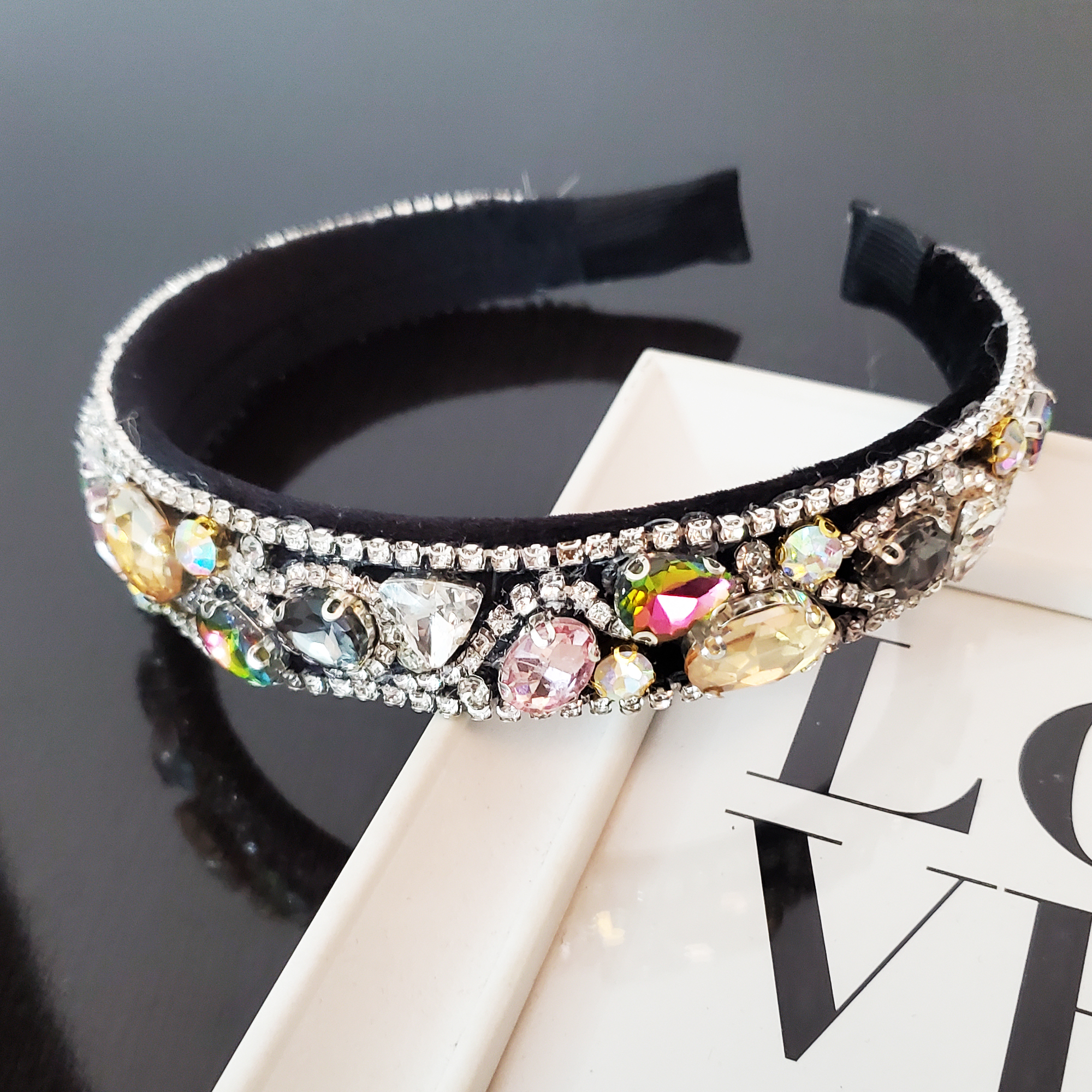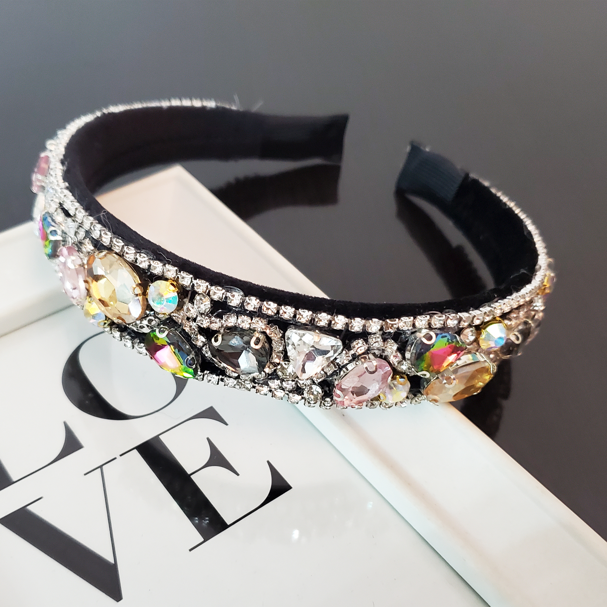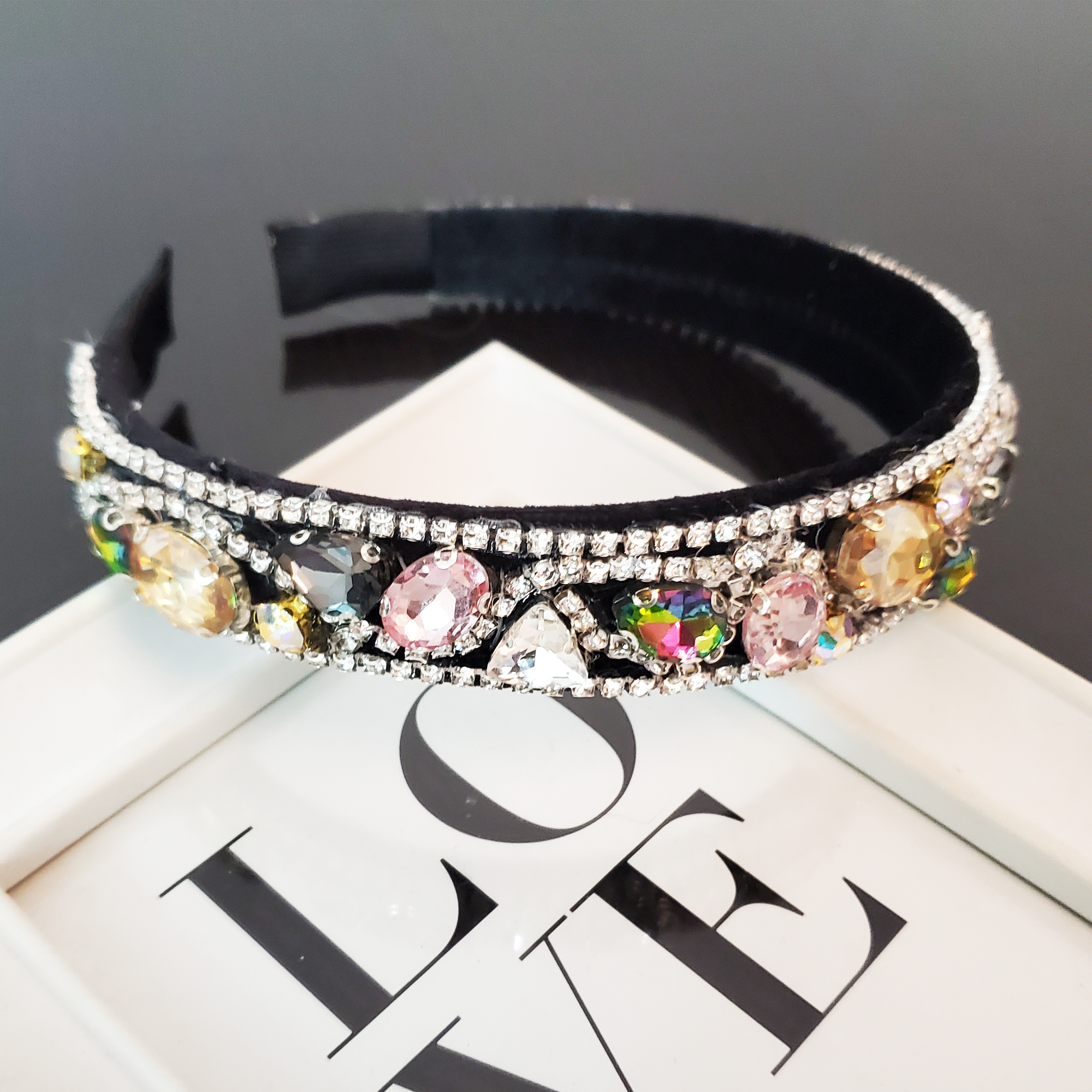 Bentita este realizata pe suport confortabil, nu aluneca, nu necesita agrafe, imbracat in catifea neagra. In exterior sunt cusute strasuri albe si cristale de sticla in nuante calde precum roz, crem, cameleon. In interior avem captuseala care ajuta la stabilitate pe orice coafura. Datorita captuselii bentita se poate purta cu usurinta fara sa jeneze in spatele urechilor sau sa doara