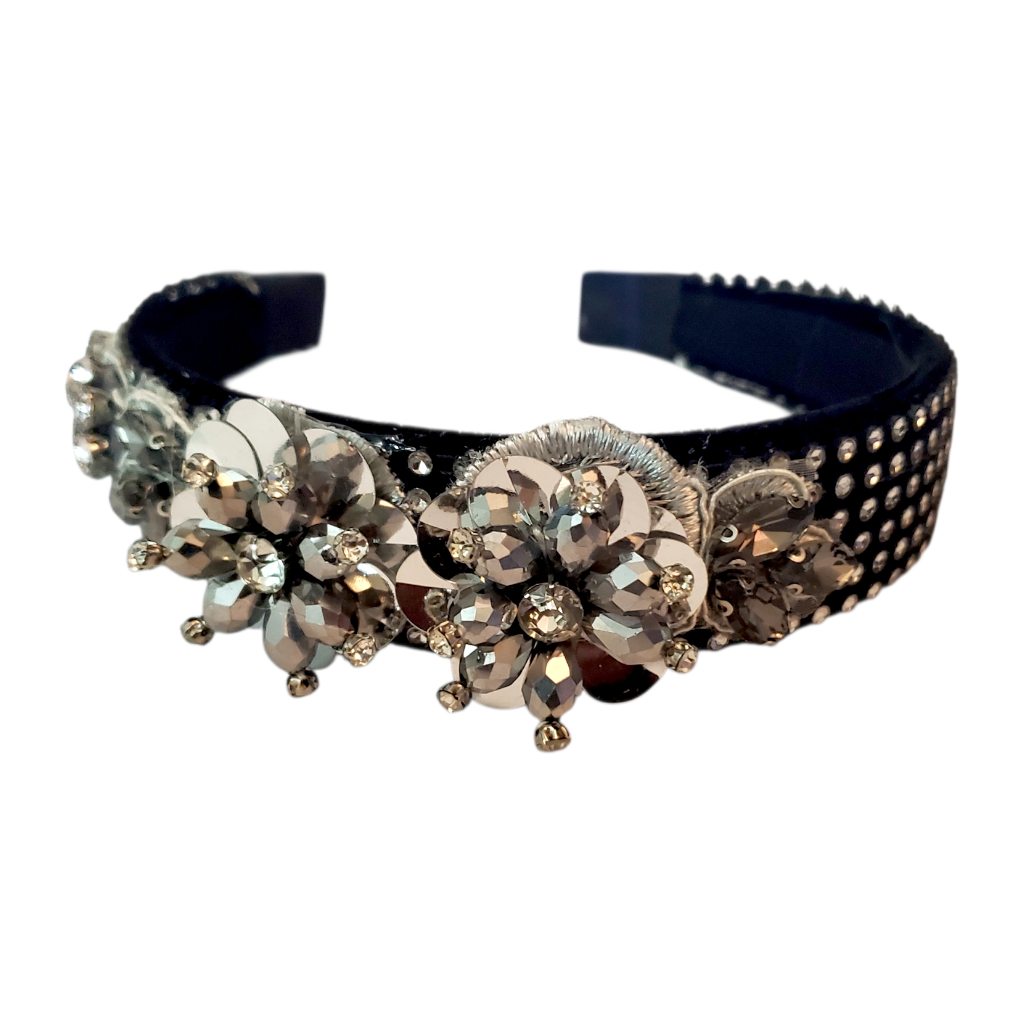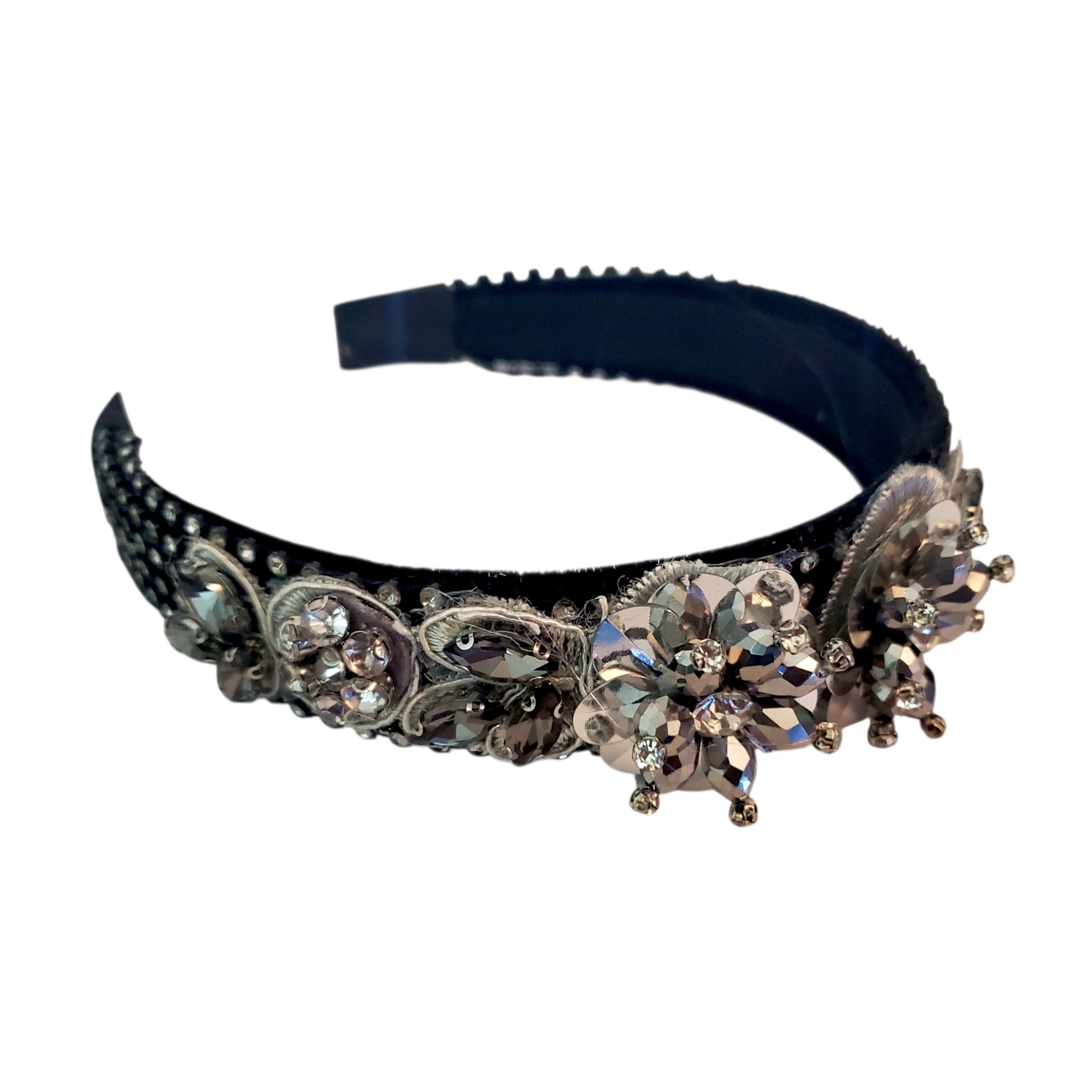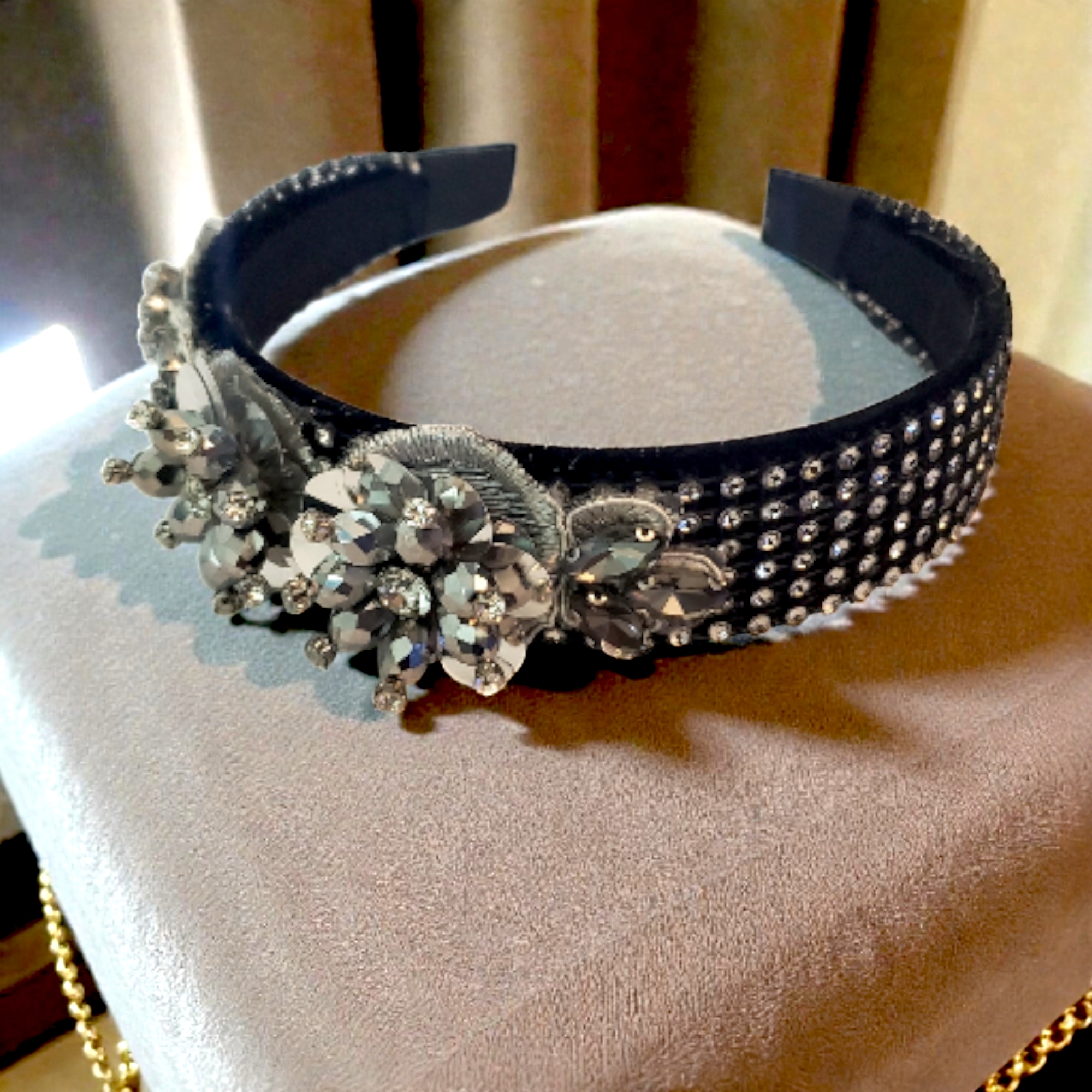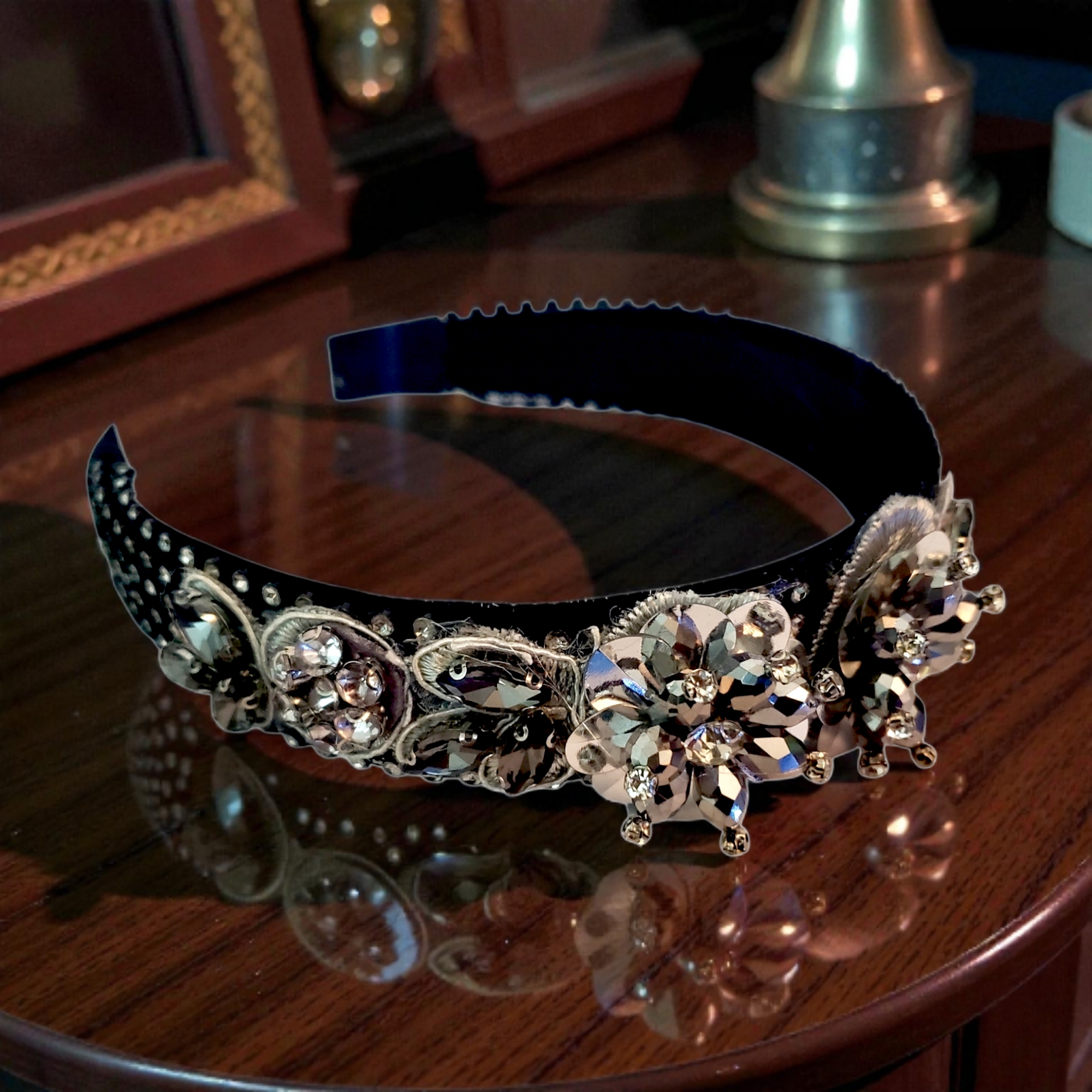 Cordeluta este realizata pe suport confortabil, nu aluneca, nu necesita agrafe, imbracat in catifea. Bentita este imbracata in totalitate in ministrasuri argintii acrilice. Intr-o parte sunt 3 aplicatii argintii cu cristale de sticla si paiete. In interior bentita este captusita pentru stabilitate pe orice coafura. Bentita se poate purta cu usurinta fara sa jeneze in spatele urechilor sau sa doara.