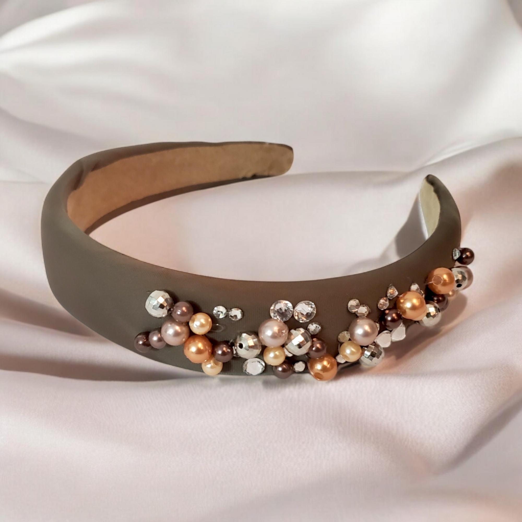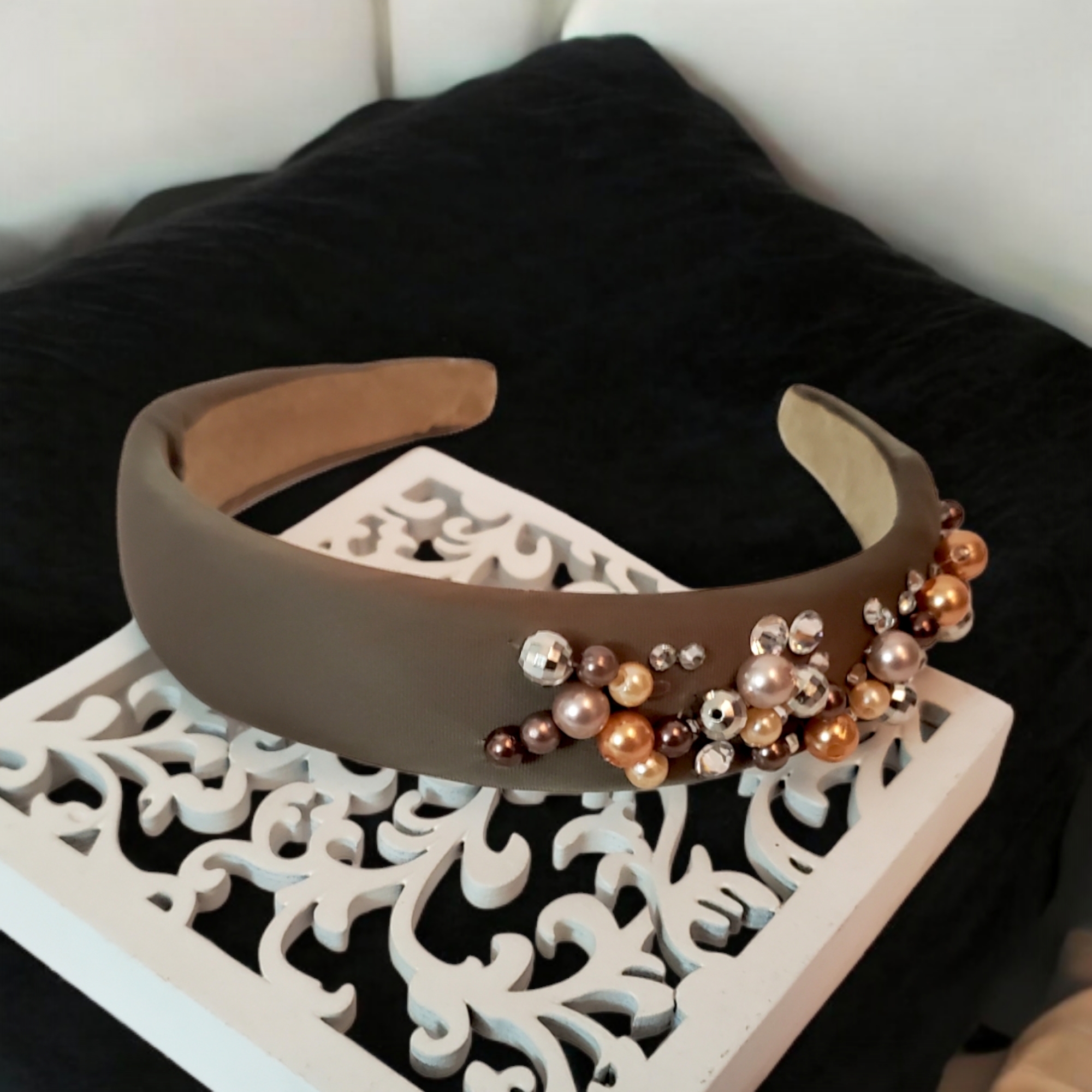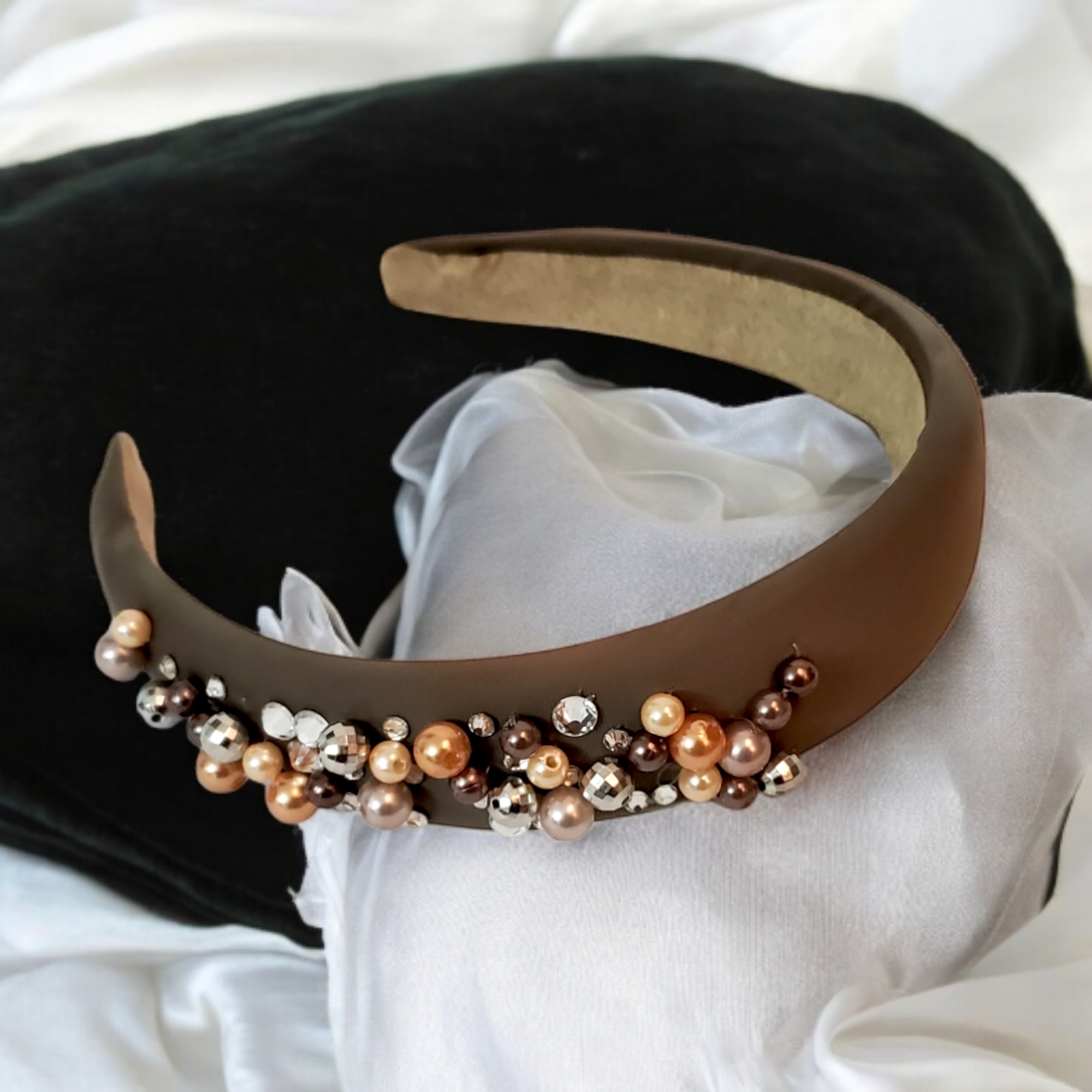 Bentita este realizata pe suport confortabil, de volum mediu, imbracat in material textil satinat maro. Intr-o parte sunt cusute perle in nuante de crem/maro/argintiu, si minicristale acrilice