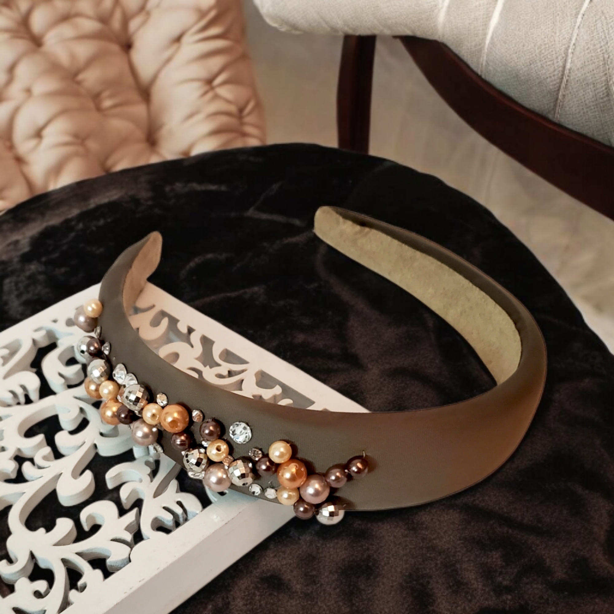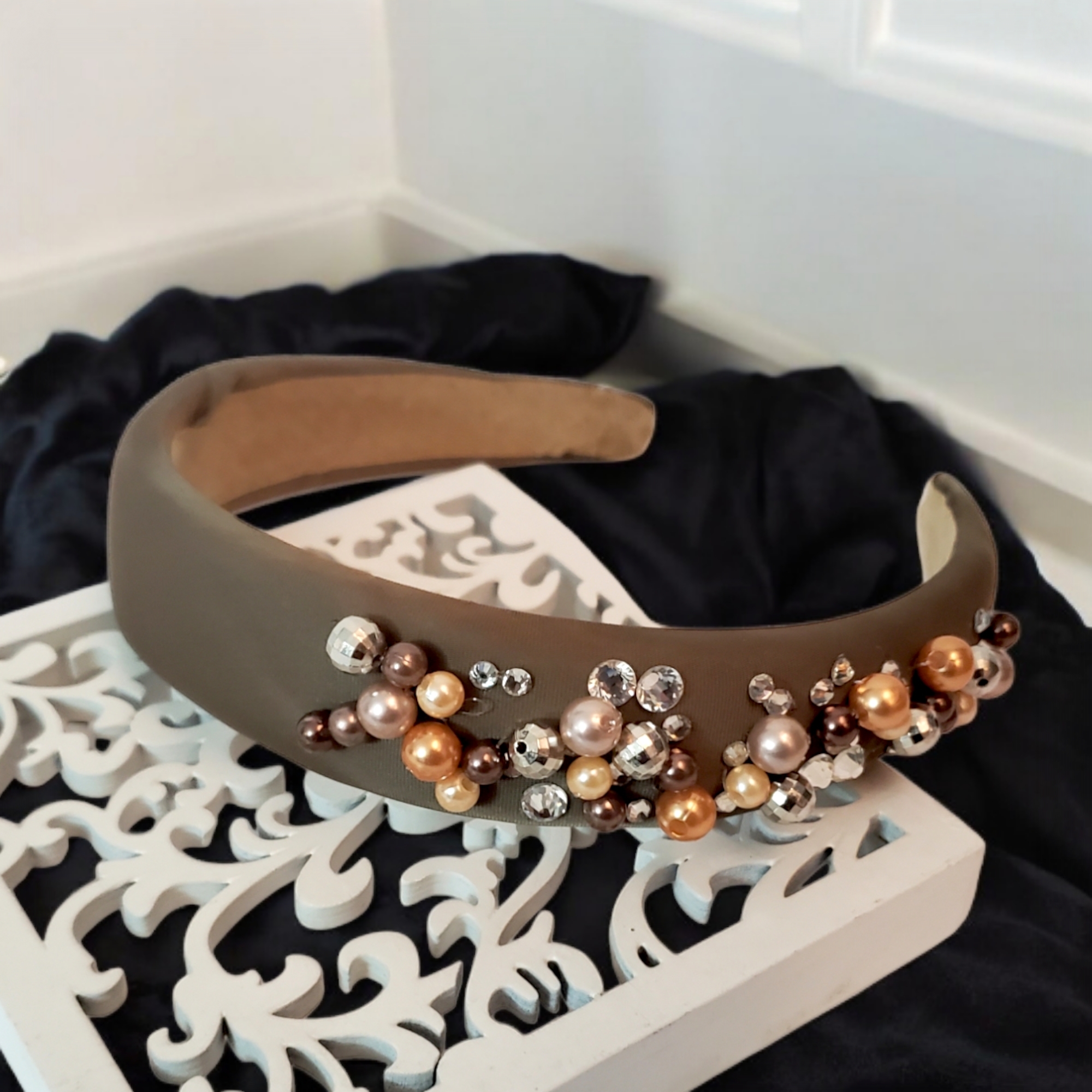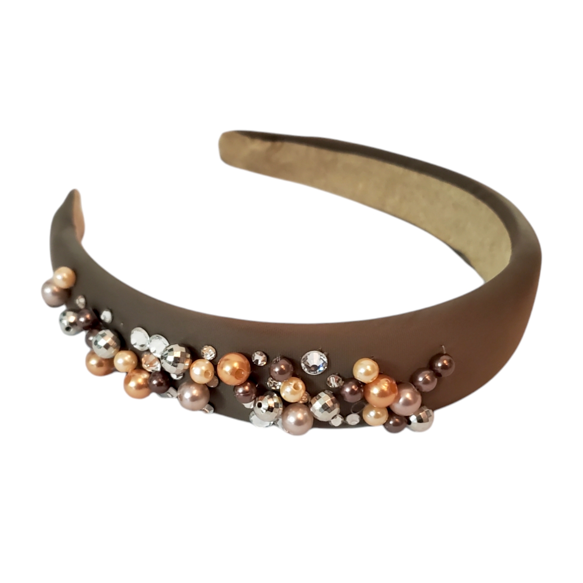 Bentita este realizata pe suport confortabil, de volum mediu, imbracat in material textil satinat maro. Intr-o parte sunt cusute perle in nuante de crem/maro/argintiu, si minicristale acrilice