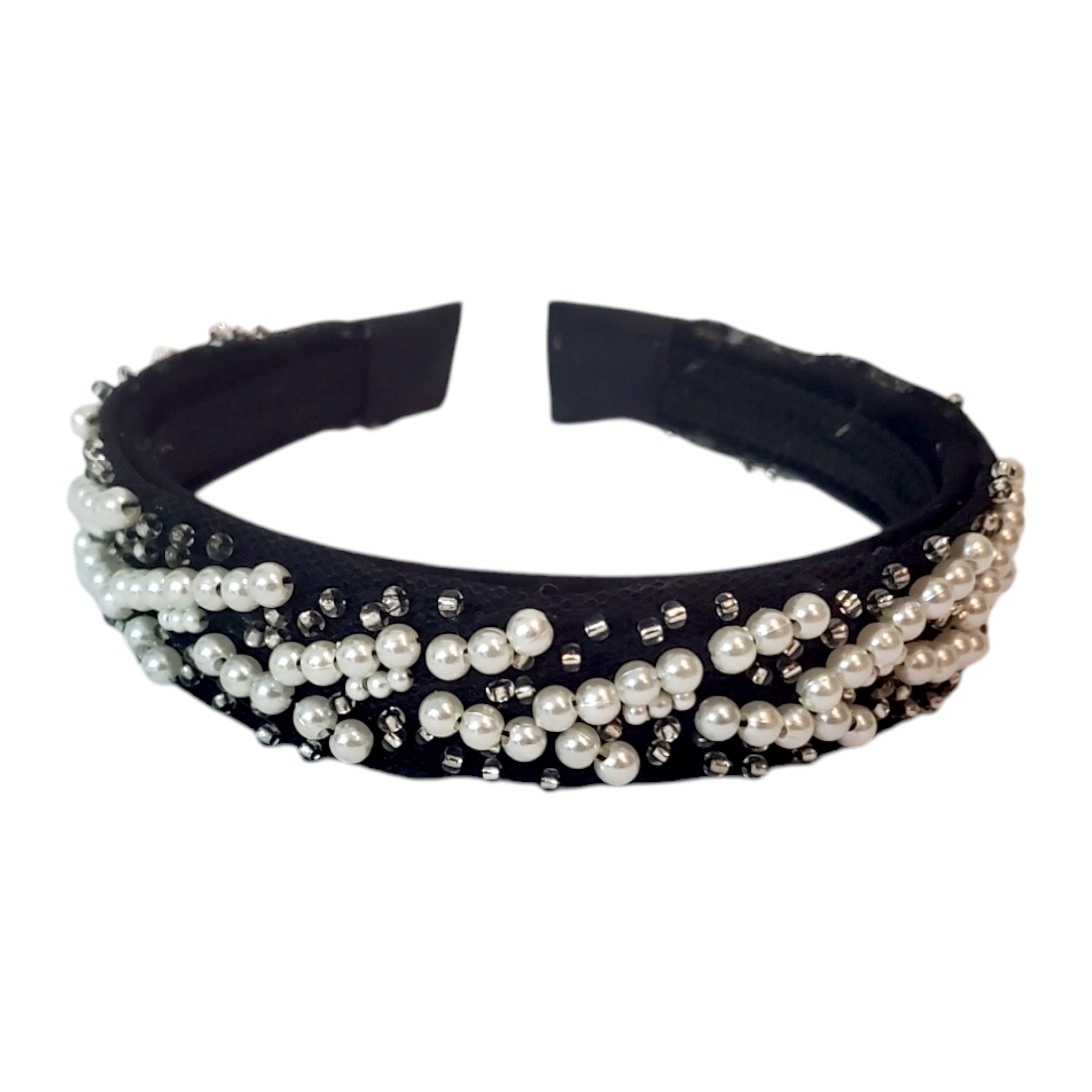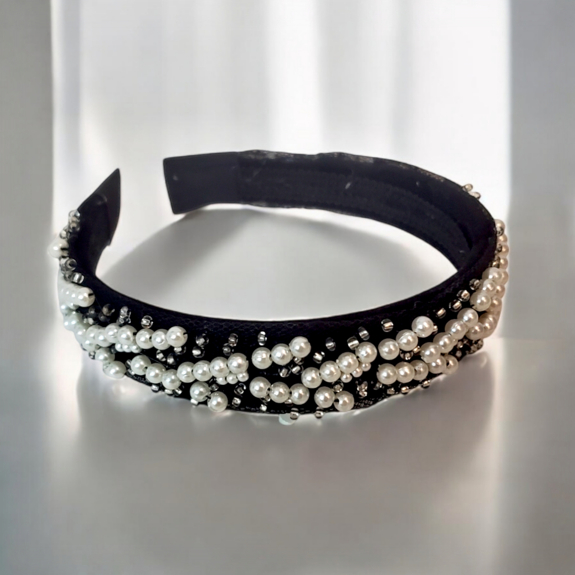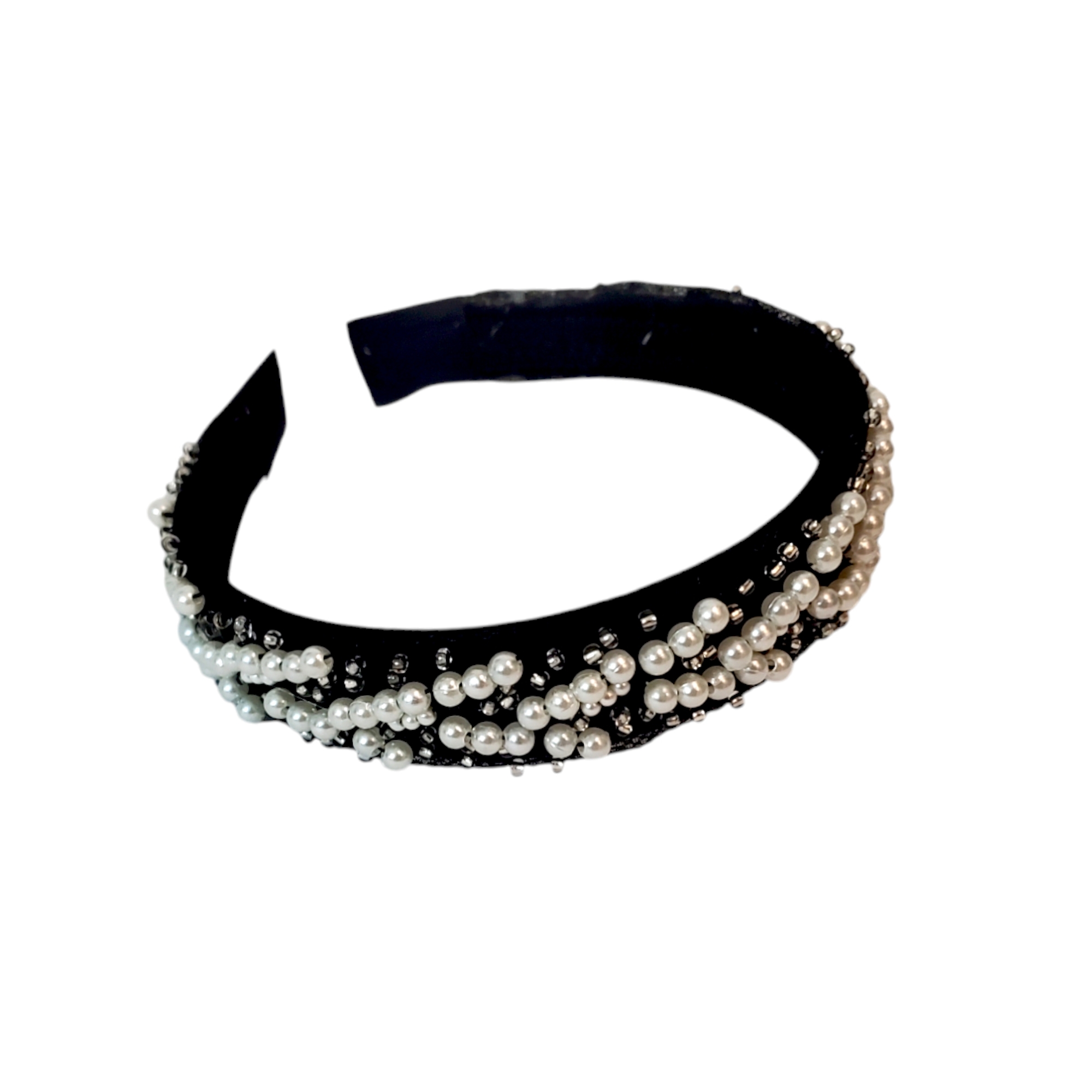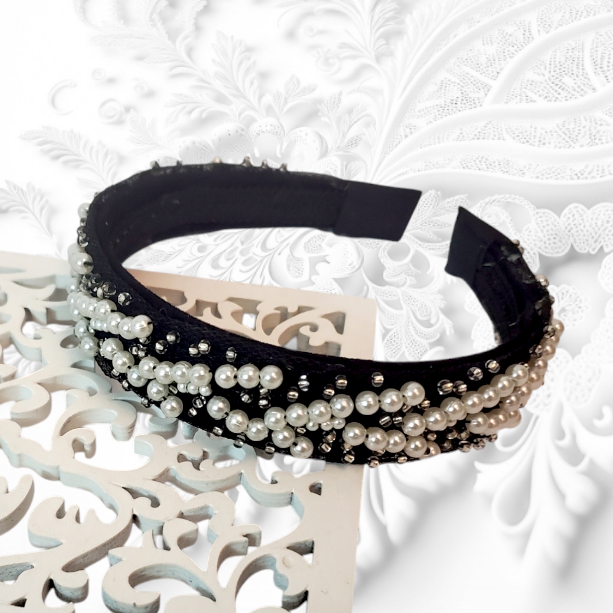 Descoperă farmecul subtil al bentitei Amelia: suport confortabil îmbrăcat în catifea fină, împodobit cu perle albe și mărgeluțe de sticlă pentru un look rafinat. Un accesoriu versatil, perfect pentru stilul office, casual sau elegant, ce adaugă o notă de eleganță fiecărei zile.