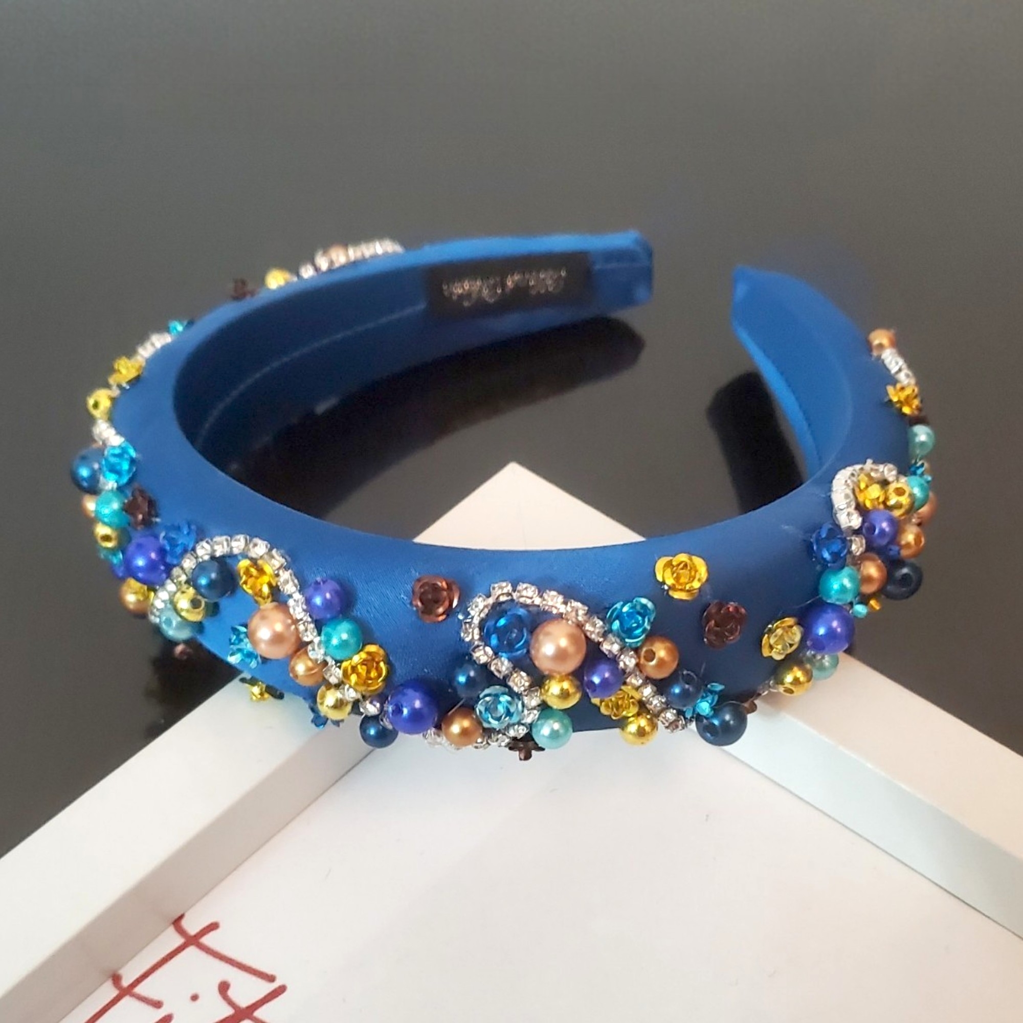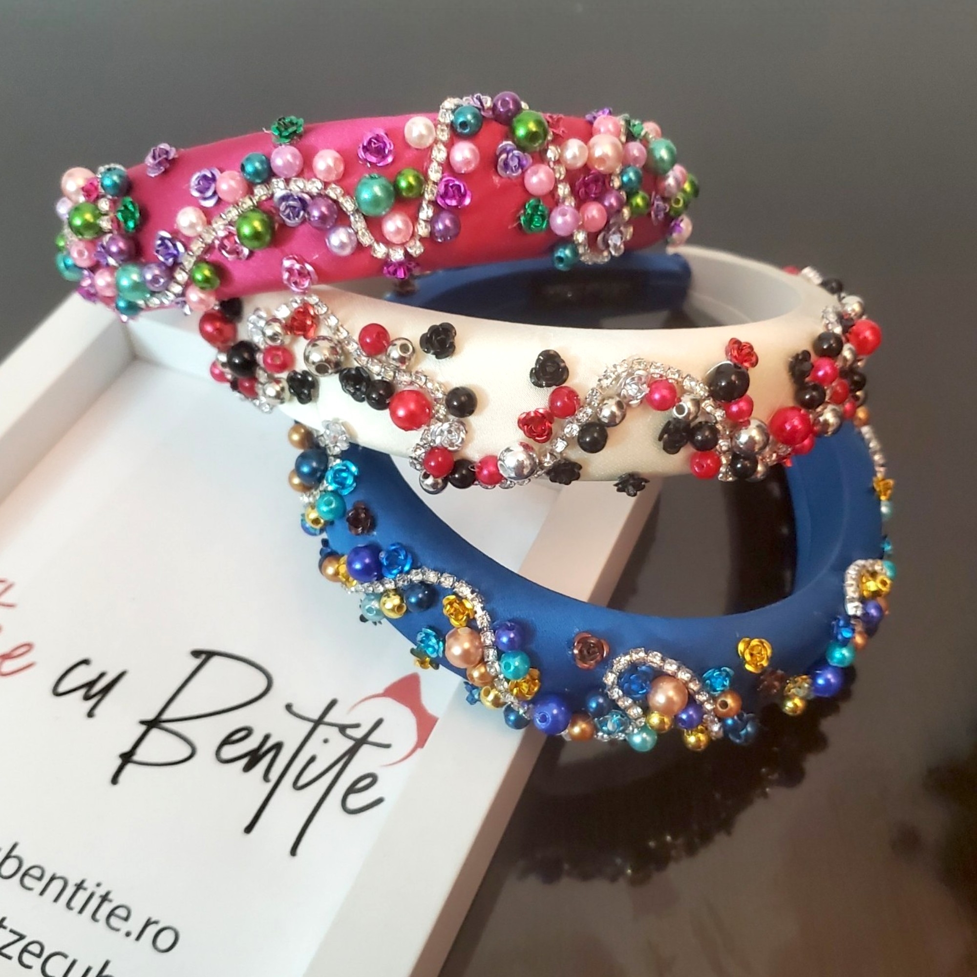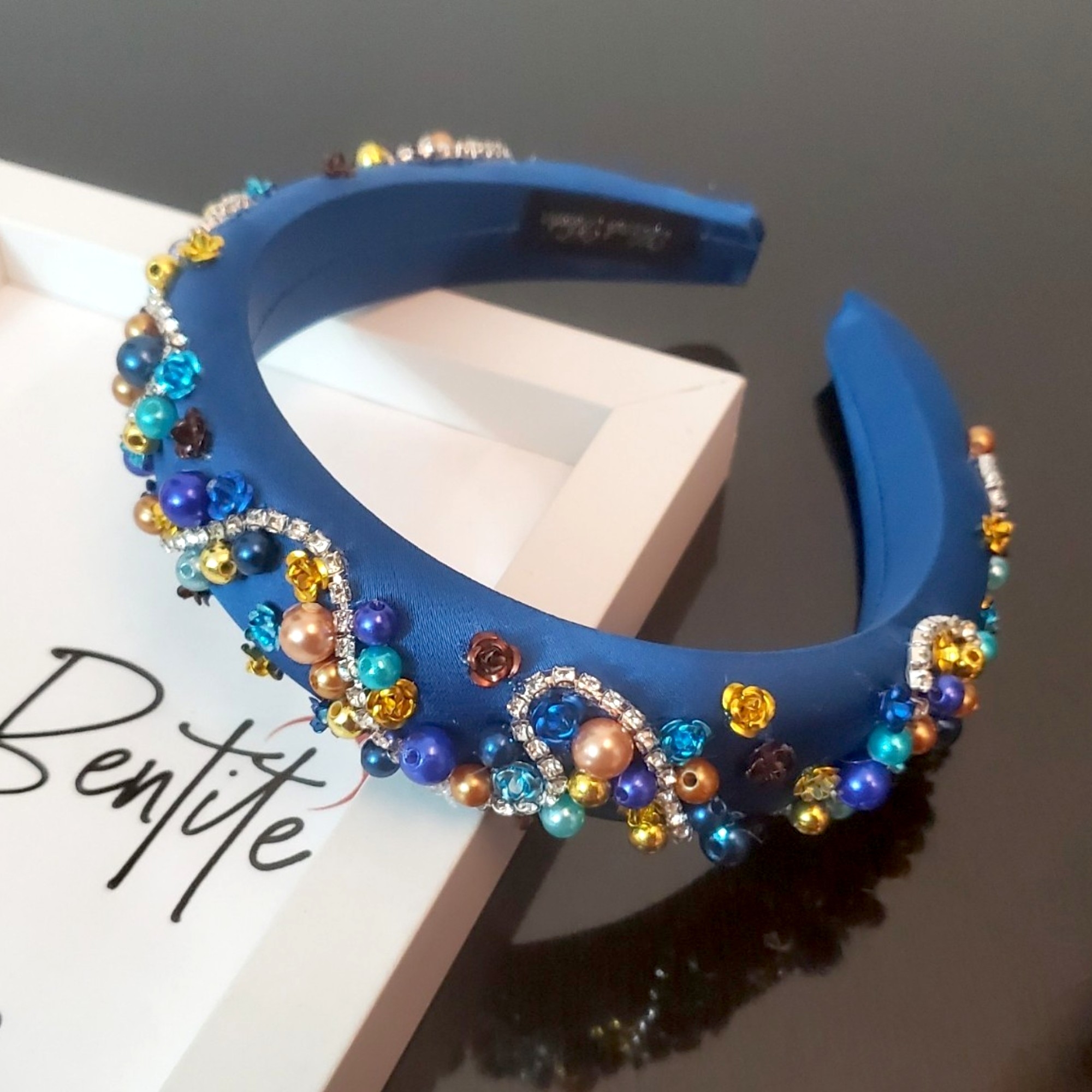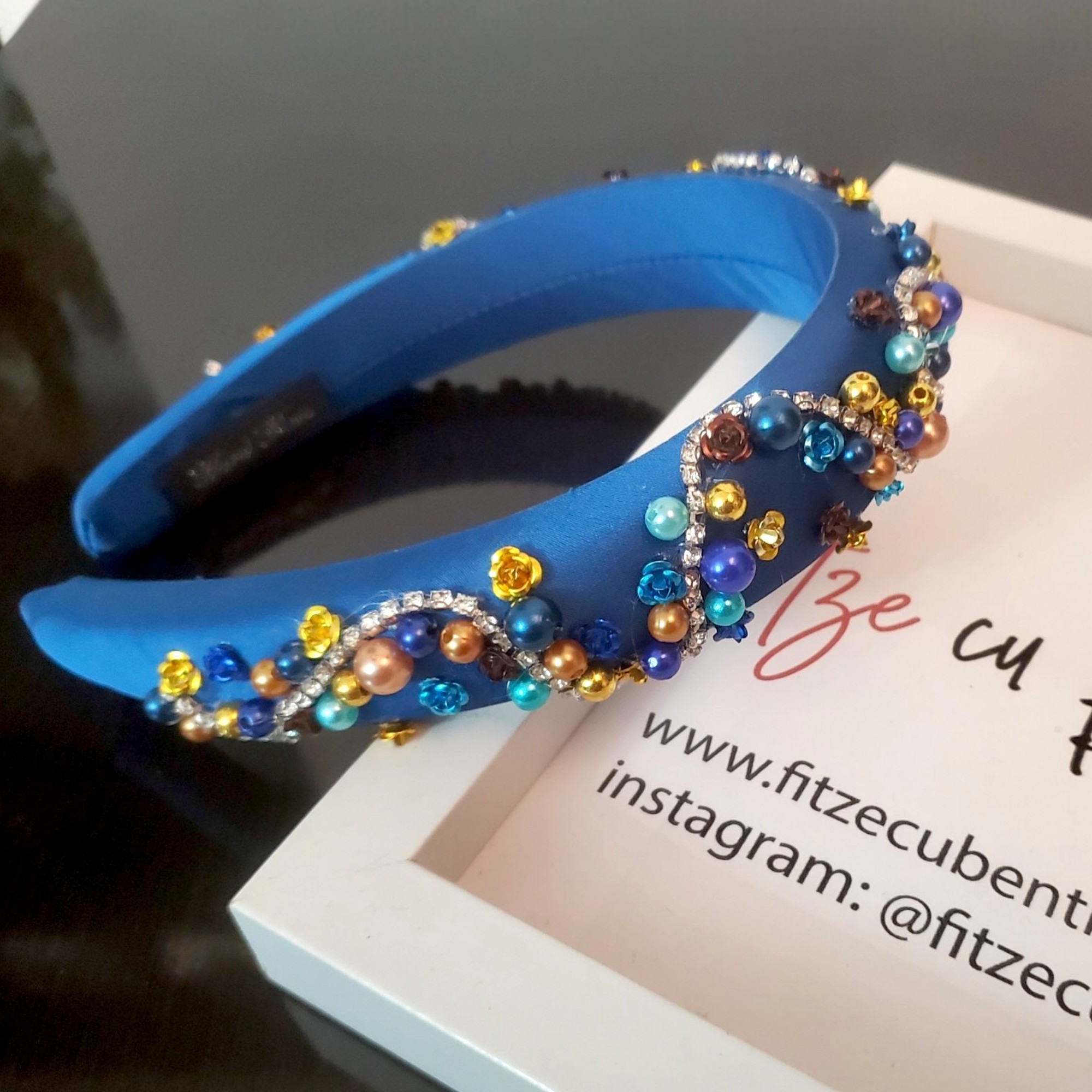 Bentita cusuta manual in nuante de albastru si crem, ce poate fi usor asortata cu bijuterii din argint, aur, sau din strasuri.