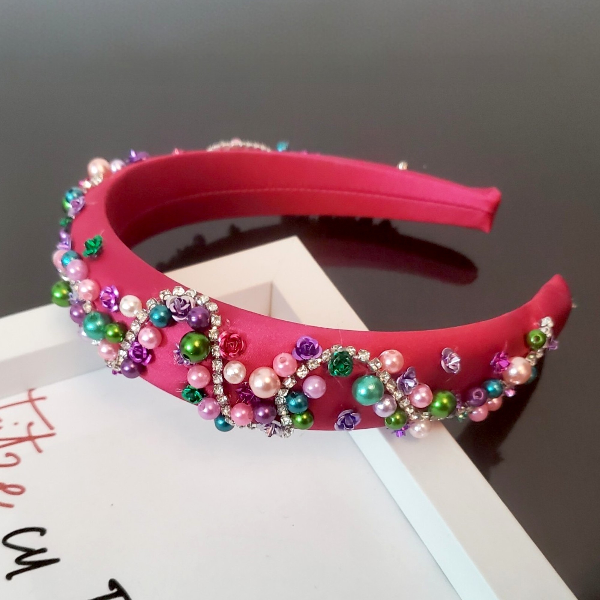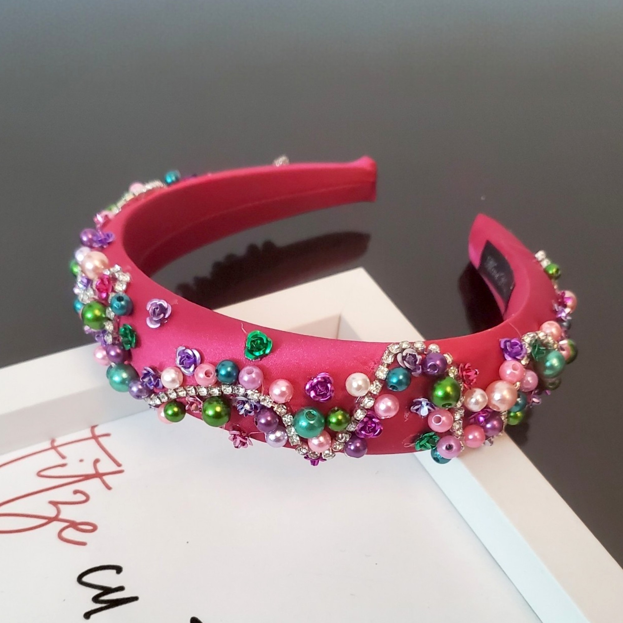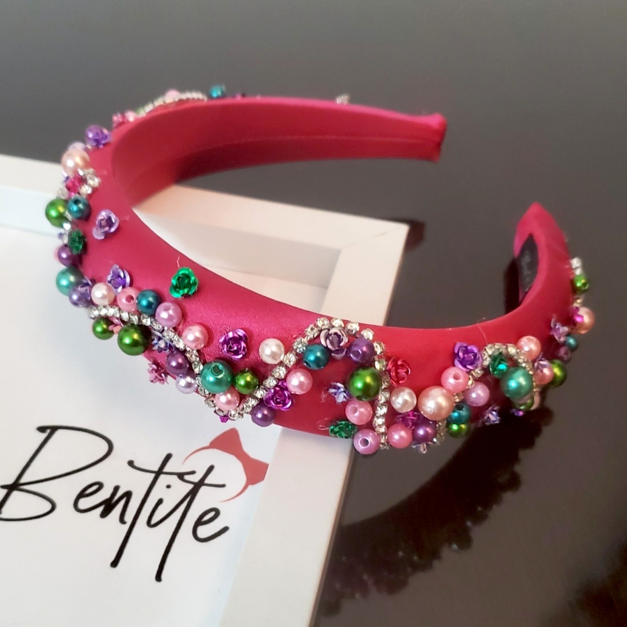 Bentita cusuta manual in nuante de roz si verde ce poate fi usor asortata cu bijuterii din argint sau din strasuri.