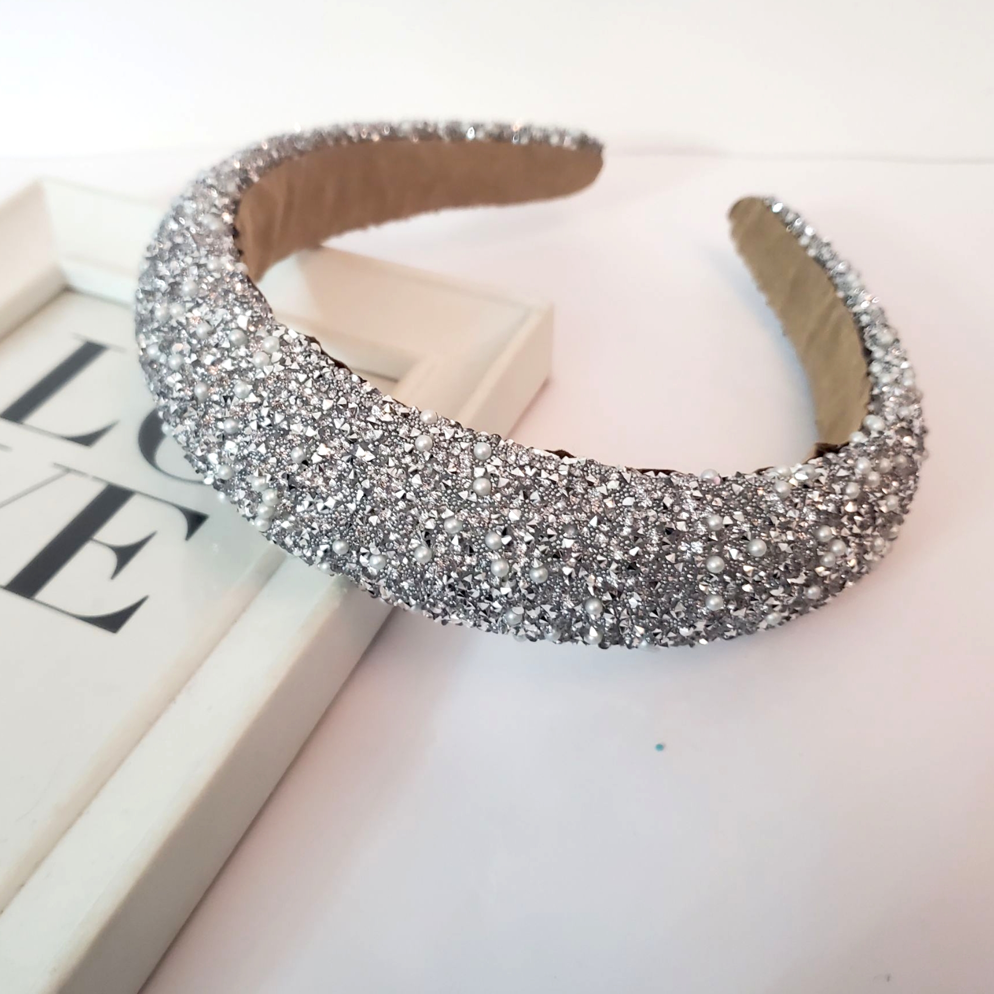 Bentita pe suport cu volum, de latime medie. Bentita este acoperita cu un material de tip ministrasuri argintii, avand nuante de alb si argintiu.