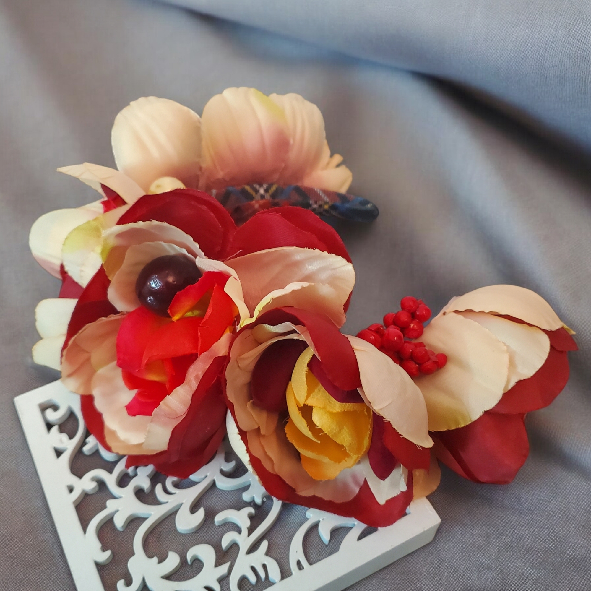 Marimea este universala. Bentita cu flori Blossomize este unica si irepetabila, fiind realizata manual.