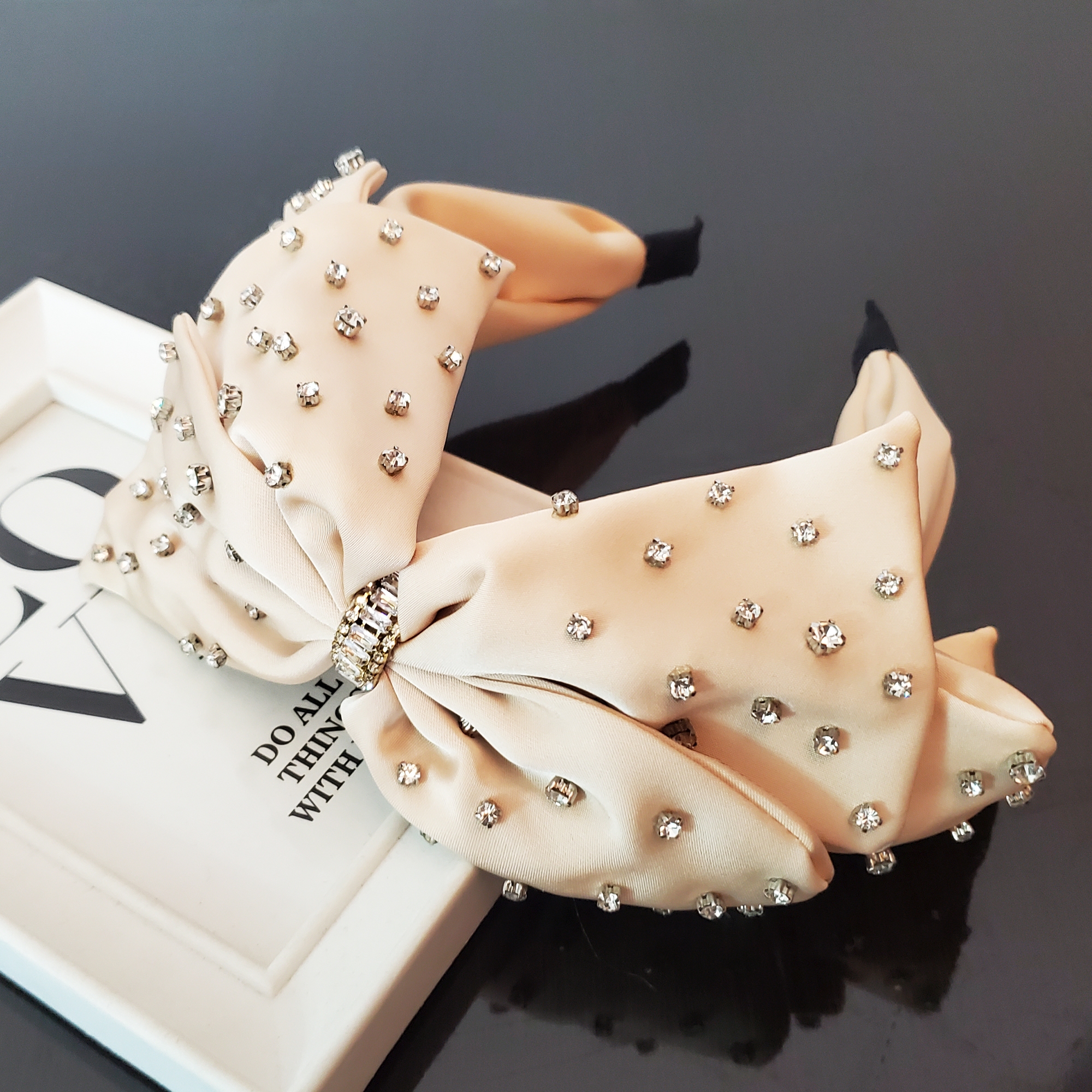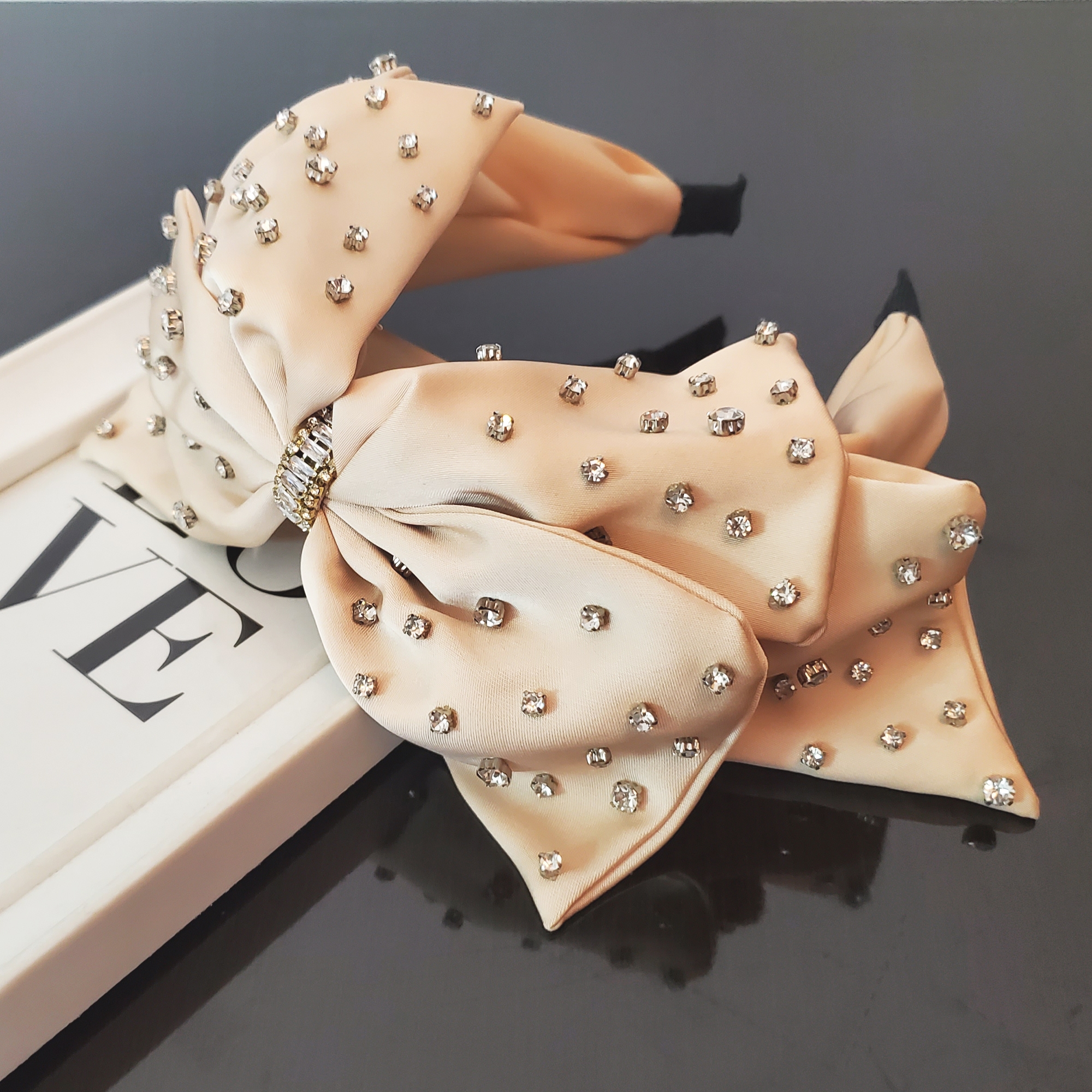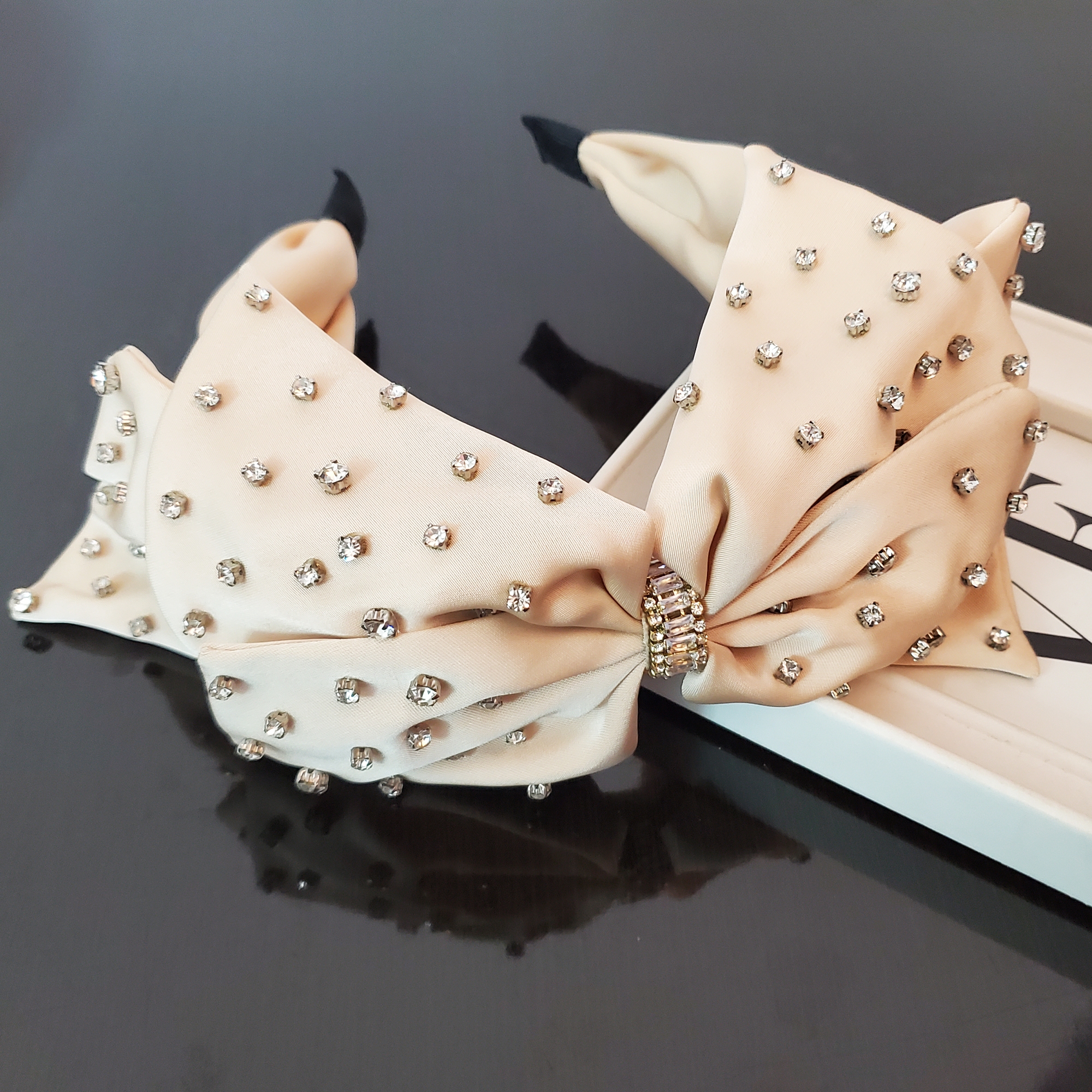 Materialul dublu satinat conferă bentiței o textură mătăsoasă, plăcută la atingere, care nu strânge și nu incomodează, fiind perfectă pentru purtare îndelungată. Funda supradimensionată, ornată cu cristale de sticlă albe, reflectă lumina discret, oferindu-ți un aer sofisticat și subtil glamour, indiferent de context.