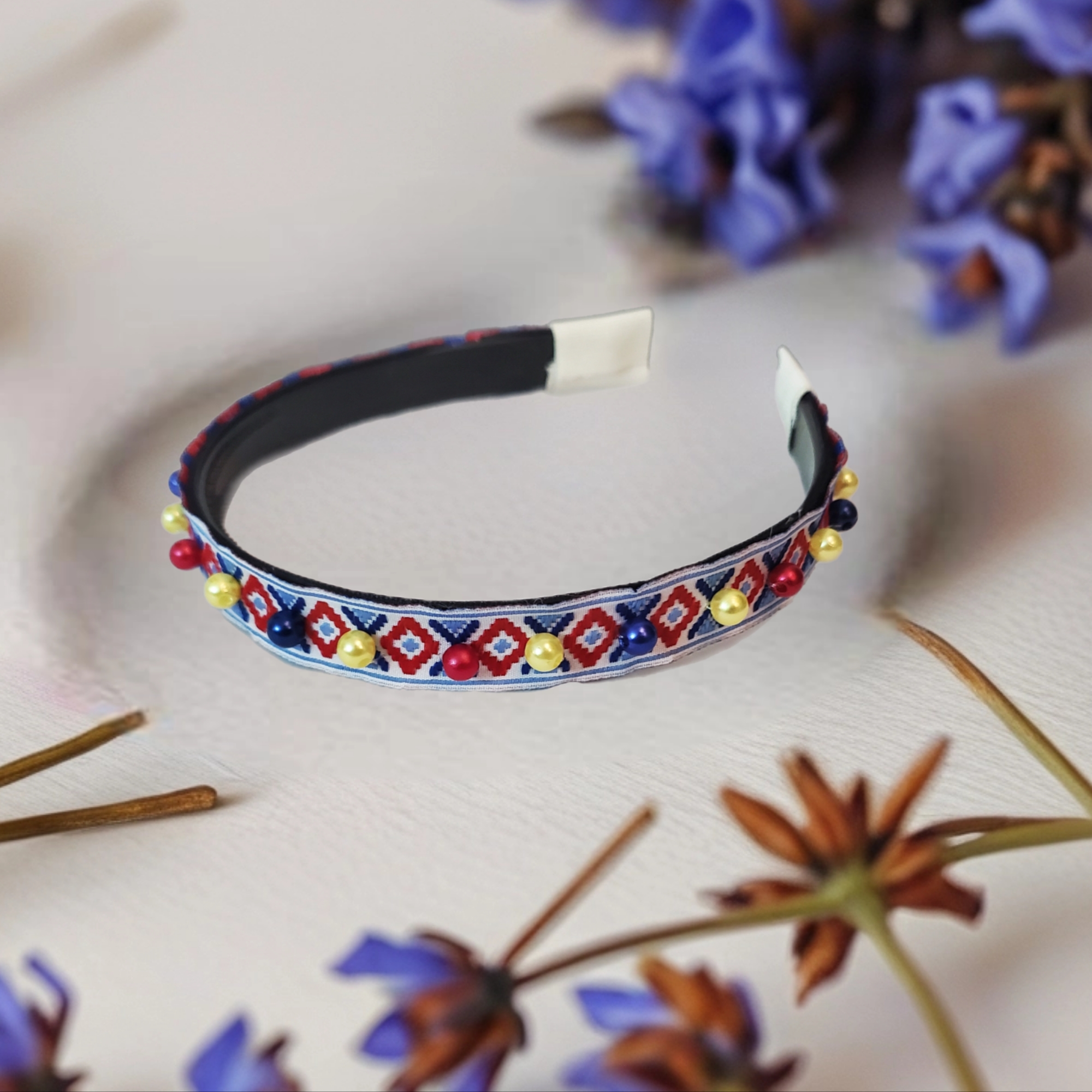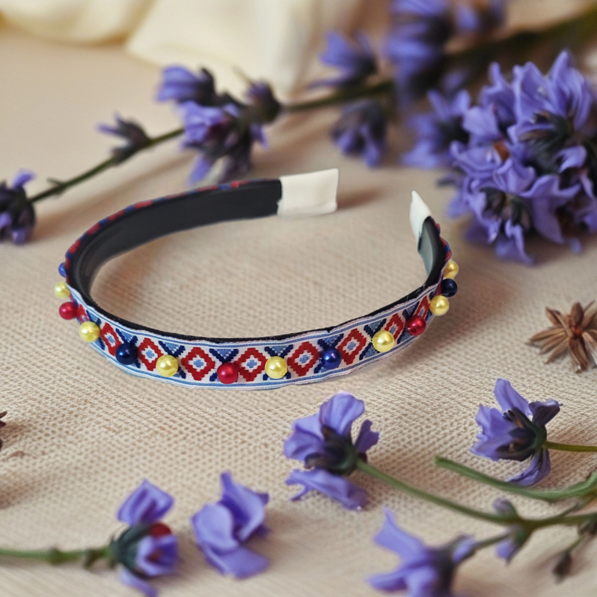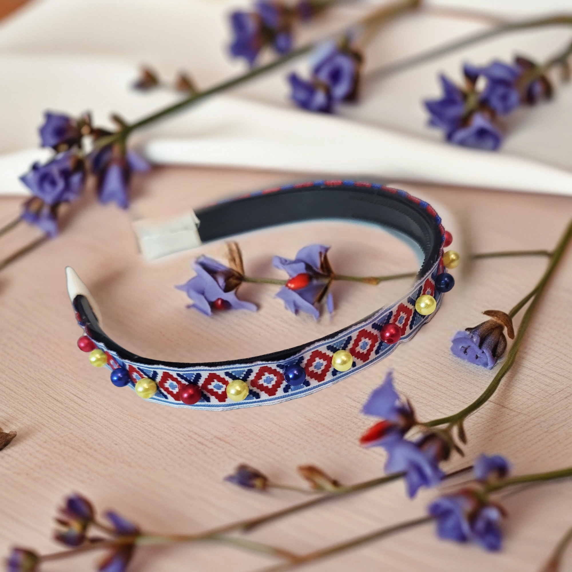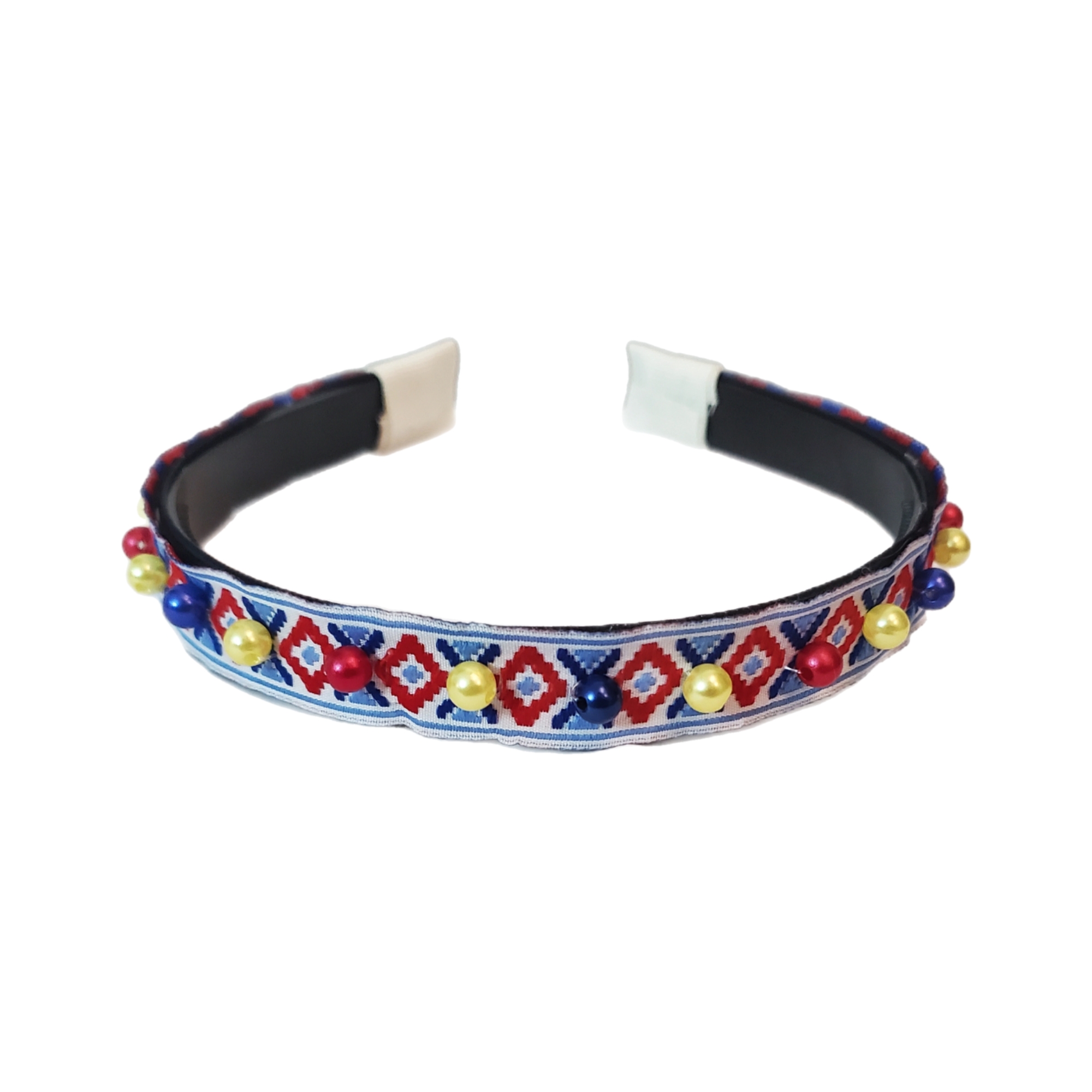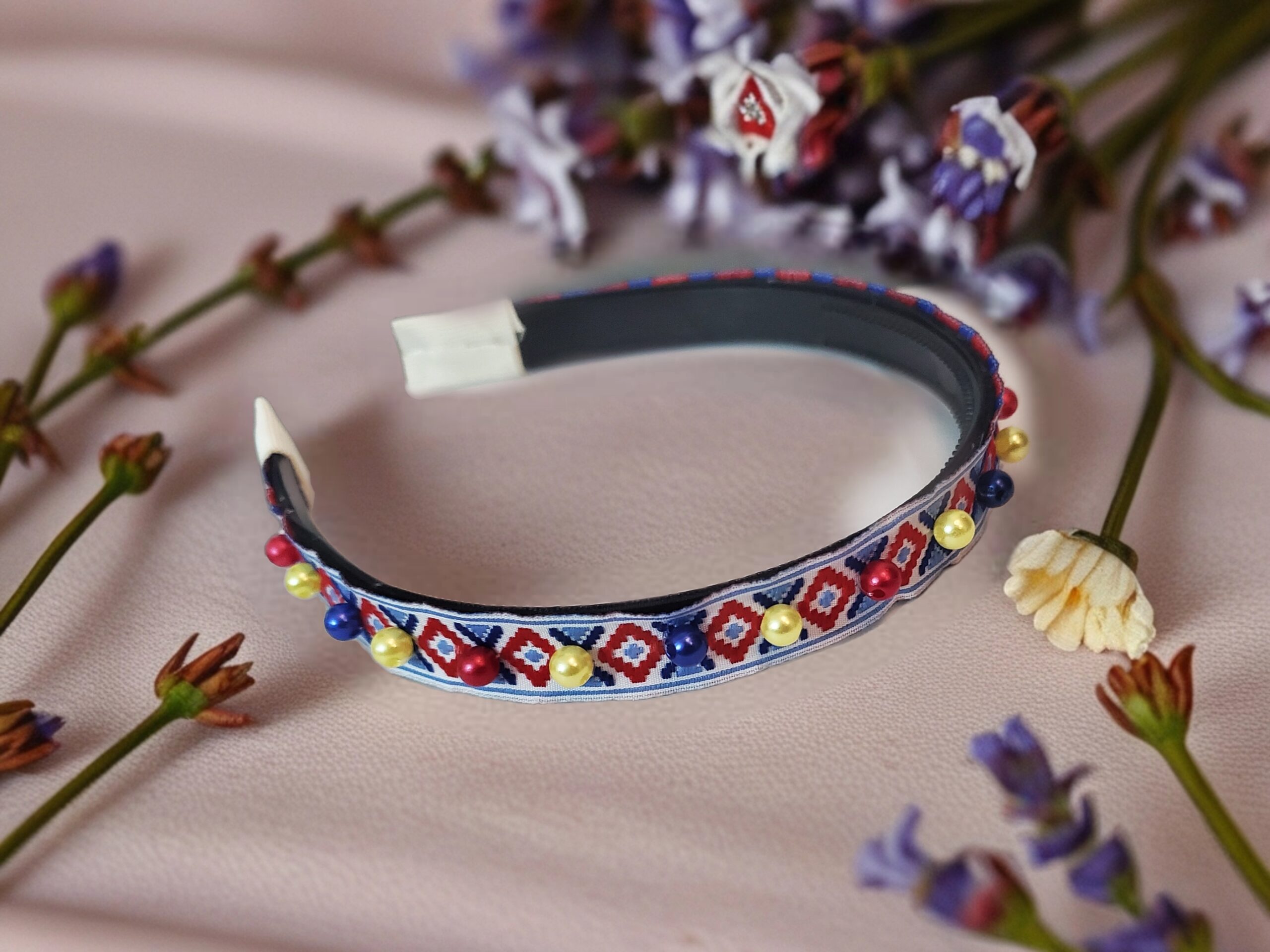 Bentita este realizata pe suport confortabil ingust negru, cu pieptane in interior pentru stabilitate. Pe bentita este aplicata o banda cu motive rustice, pe care sunt cusute perle in culorile rosu, galben, albastru.