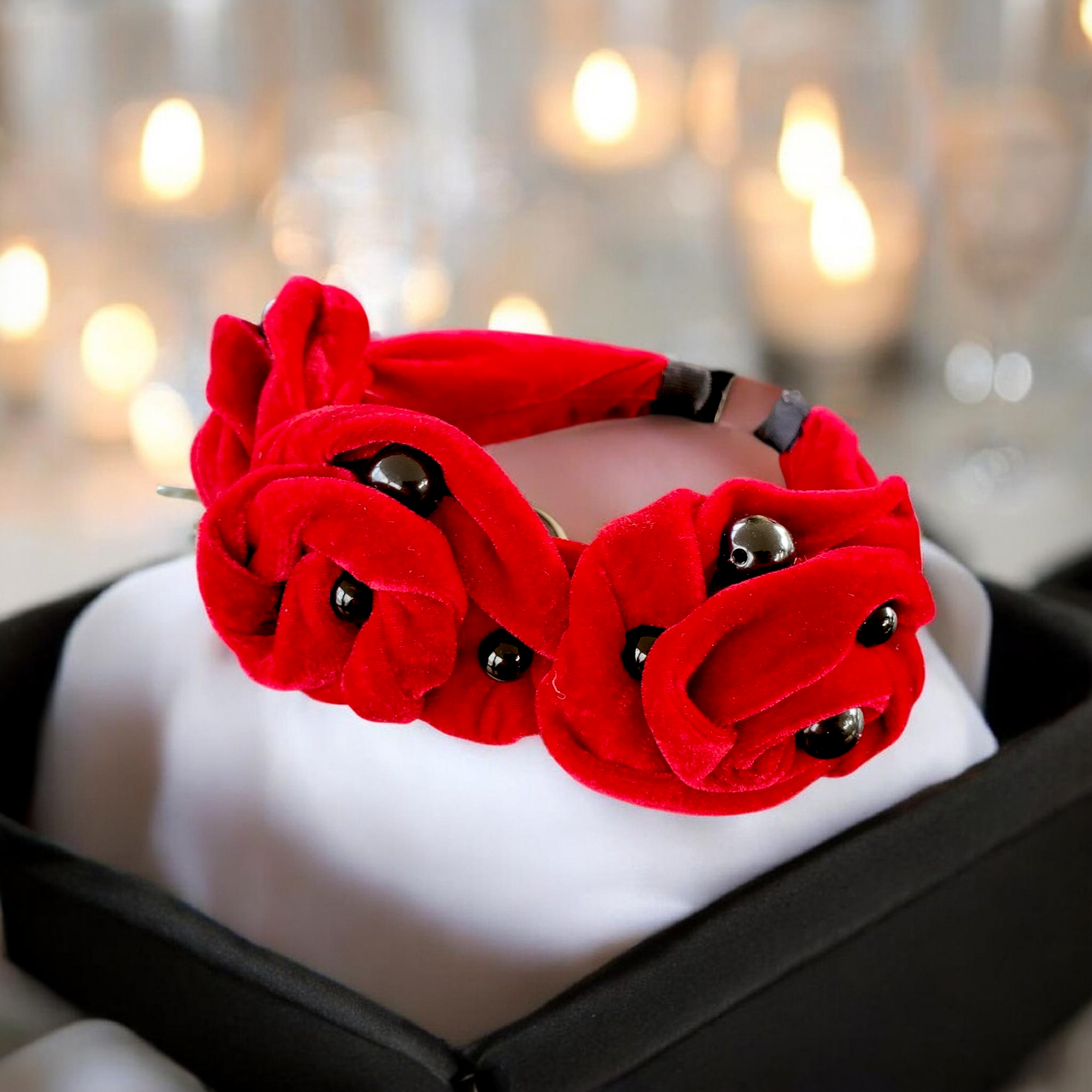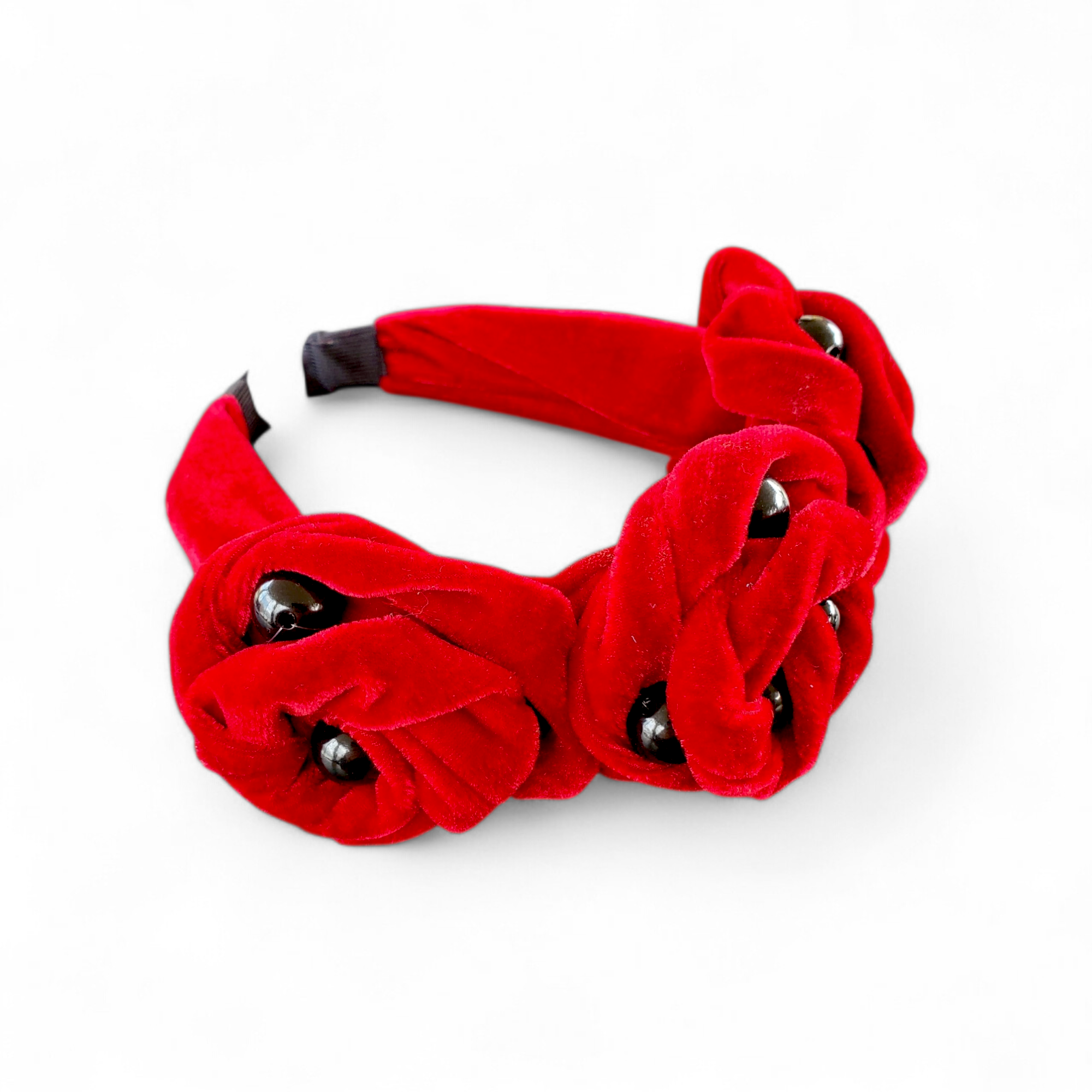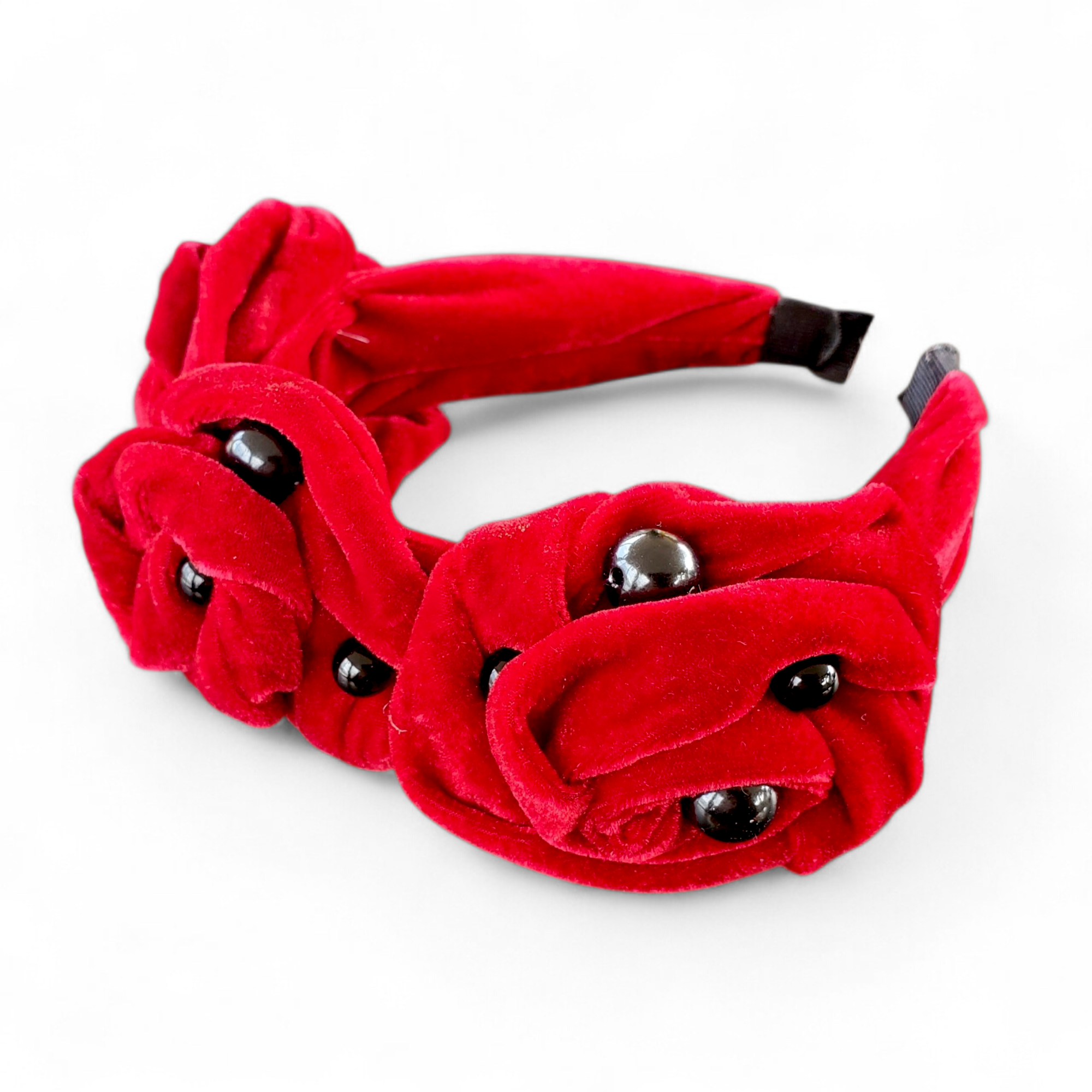 Coronita cu trei trandafiri mari rosii si perle negre, din catifea.