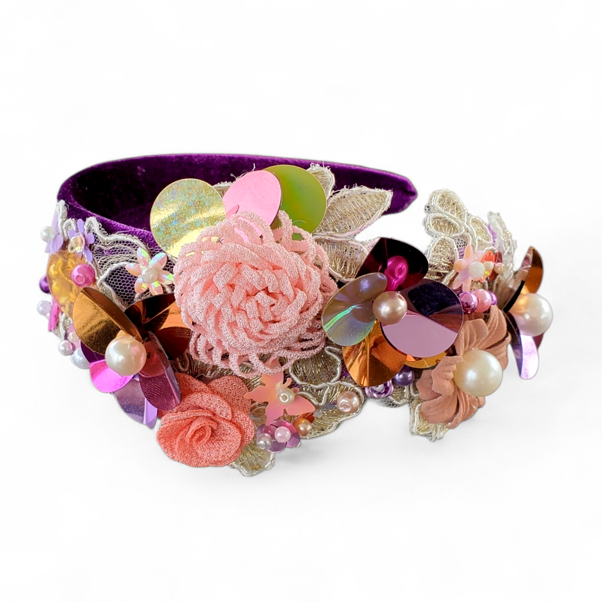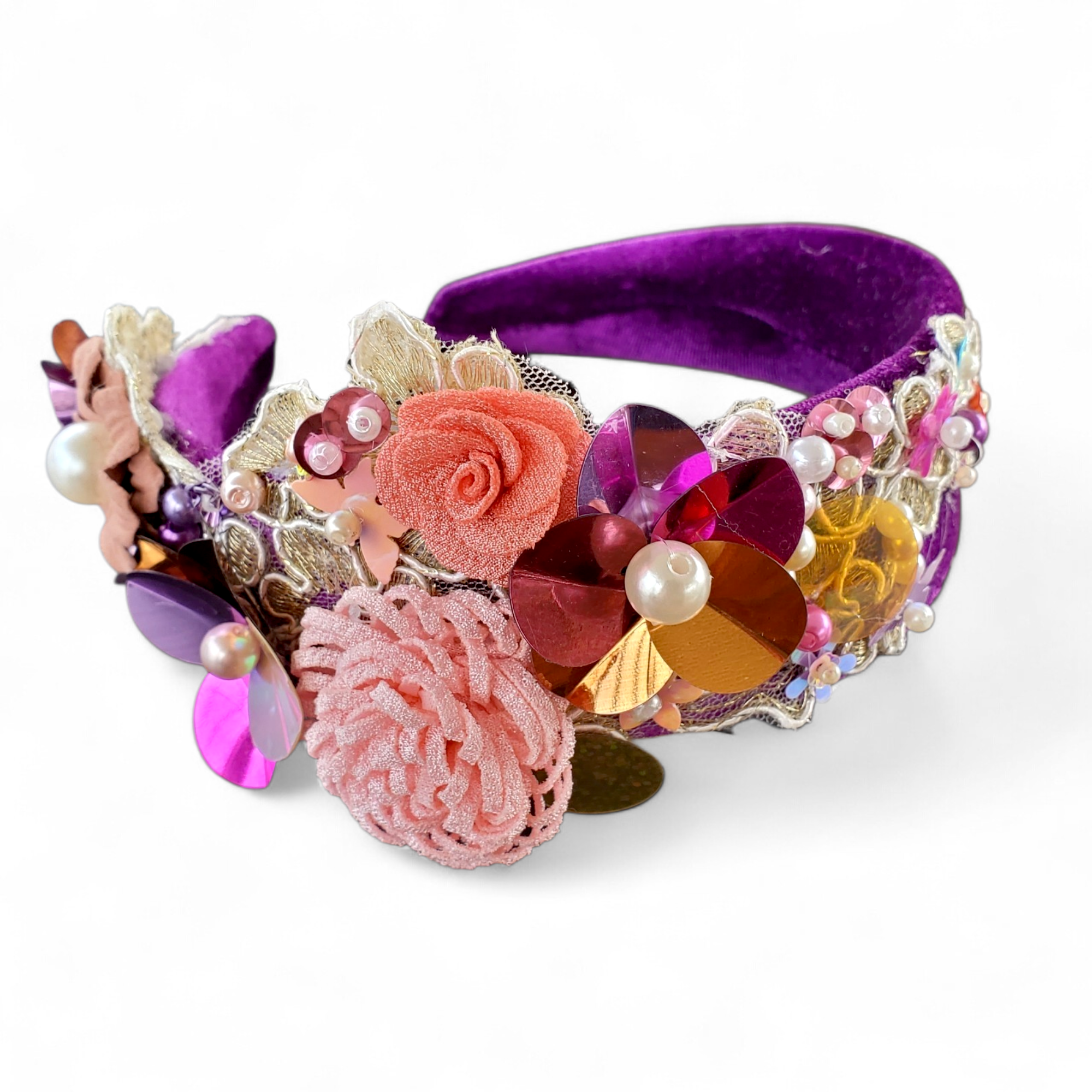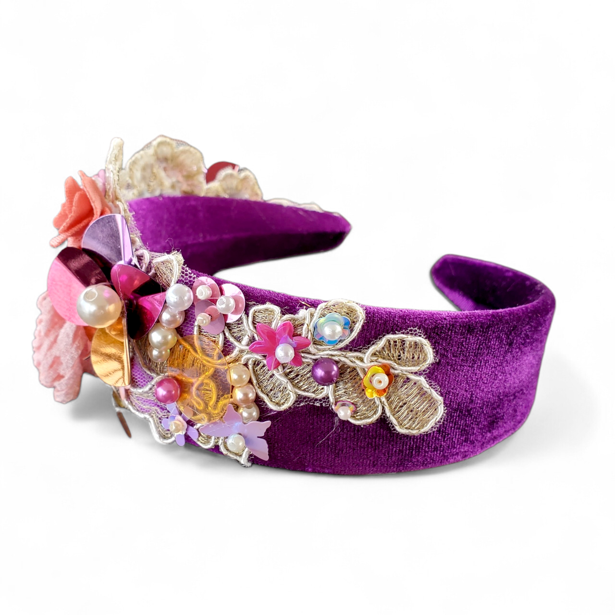Bentita este realizata pe suport lat de culoare mov, din catifea.Intr-o parte este cusuta o broderie cu flori textile, flori din paiete, perle, si paiete in culori asortate de diferite forme si marimi. Fiecare element este cusut individual.