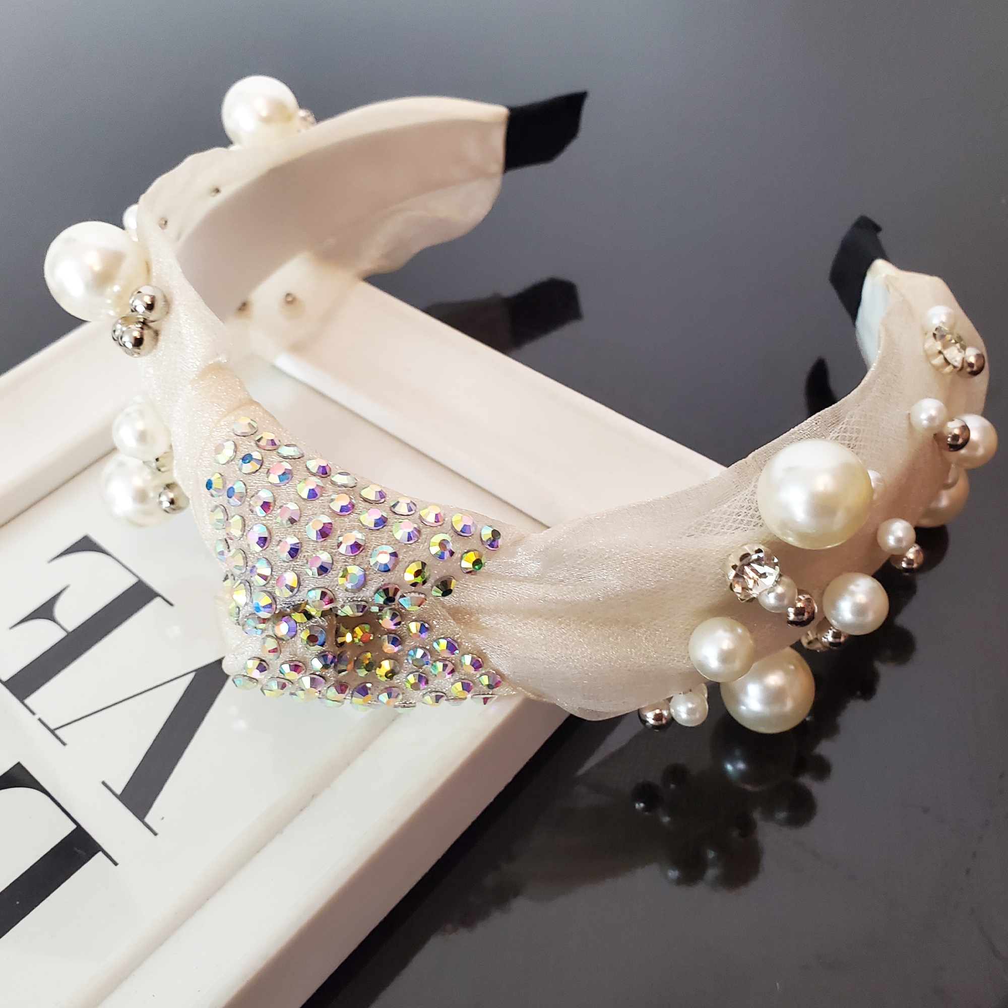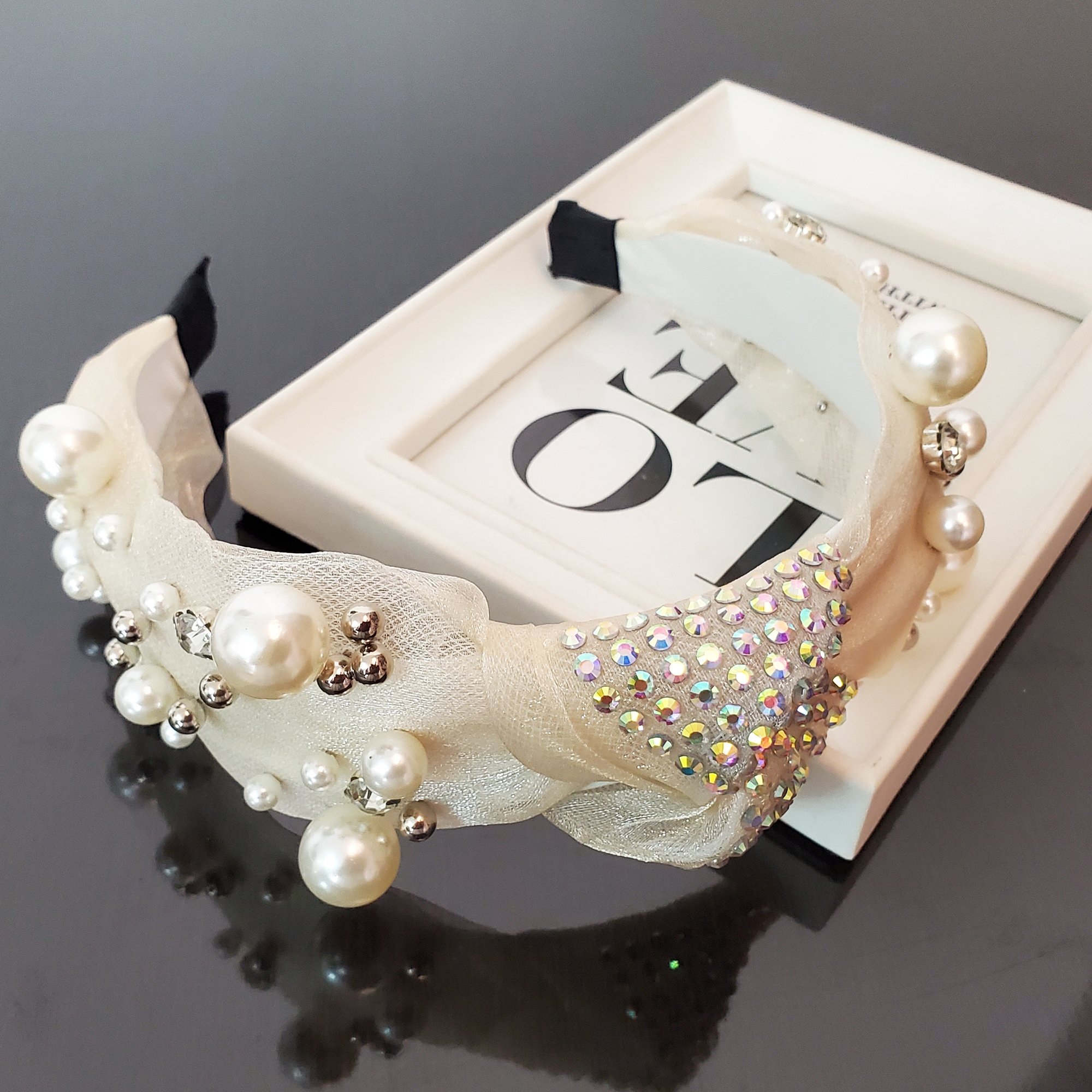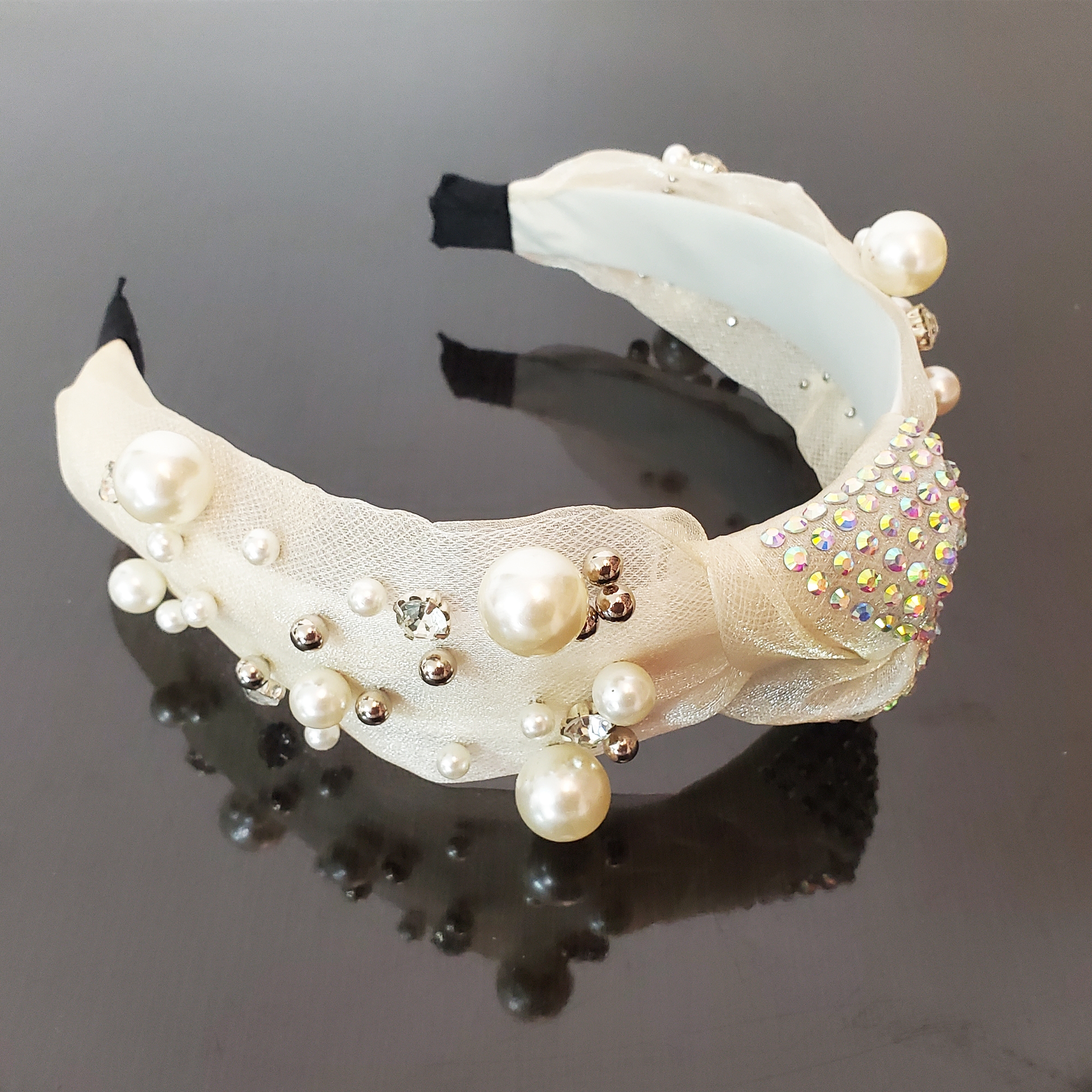 Bentita confortabila, cu captuseala la capete, imbracata in material textil fin tip voal. Bentita este innodata la mijloc sau tip turban. Pe mijloc sunt ministrasuri acrilice cu reflexii. Pe bentita sunt perle albe de diferite dimensiuni si cristale de sticla albe.