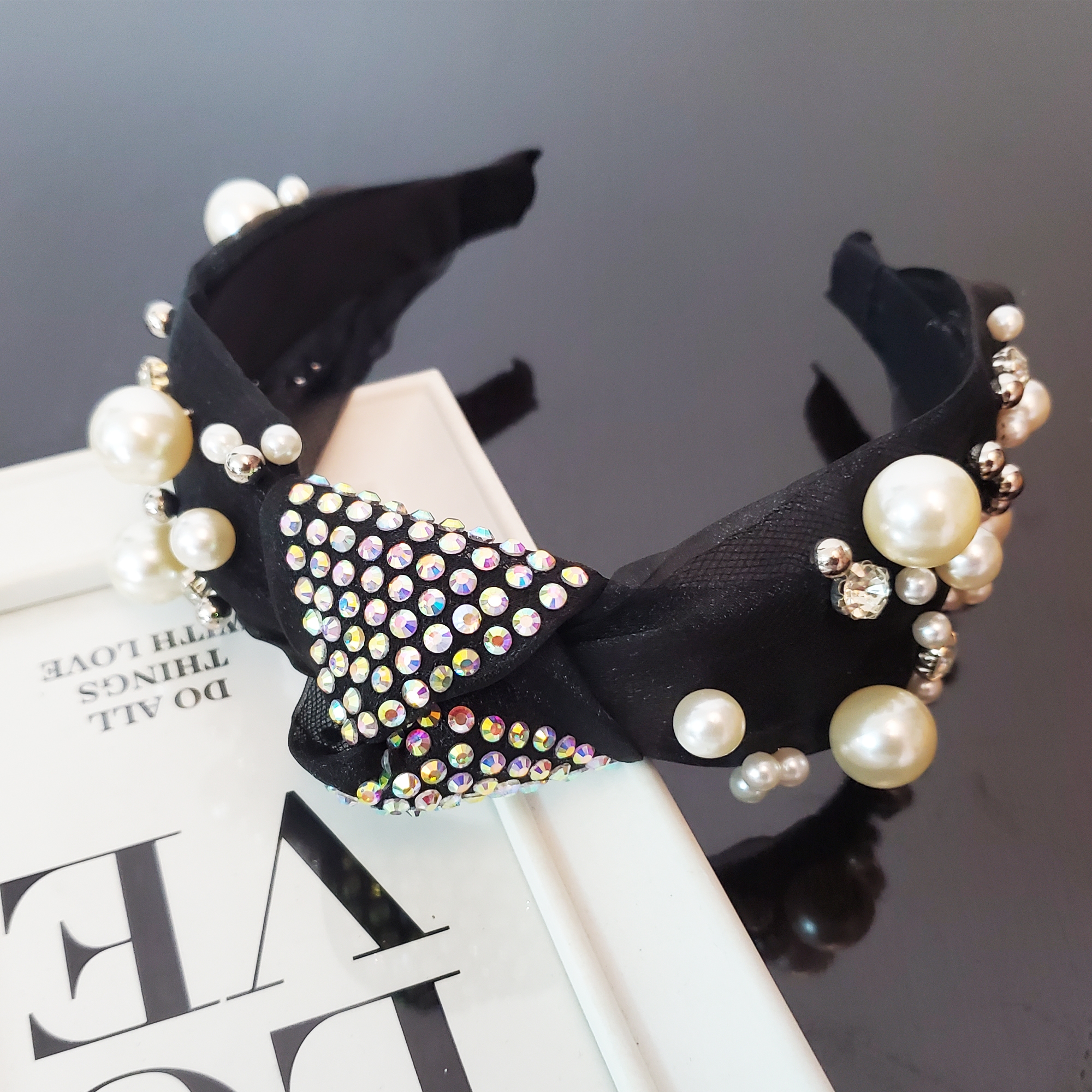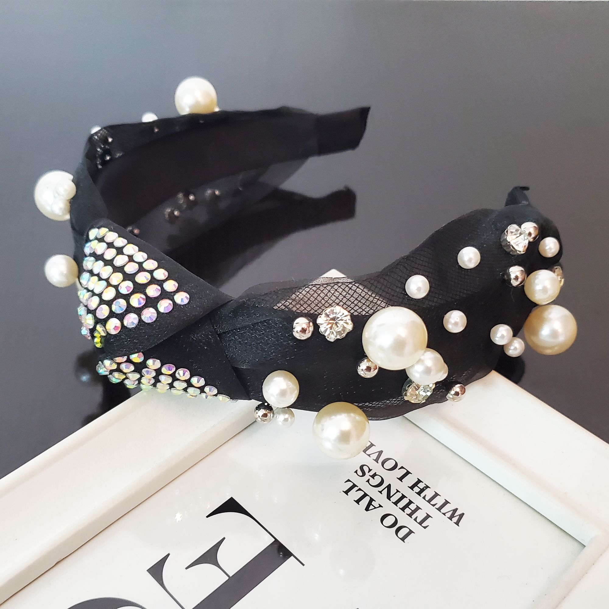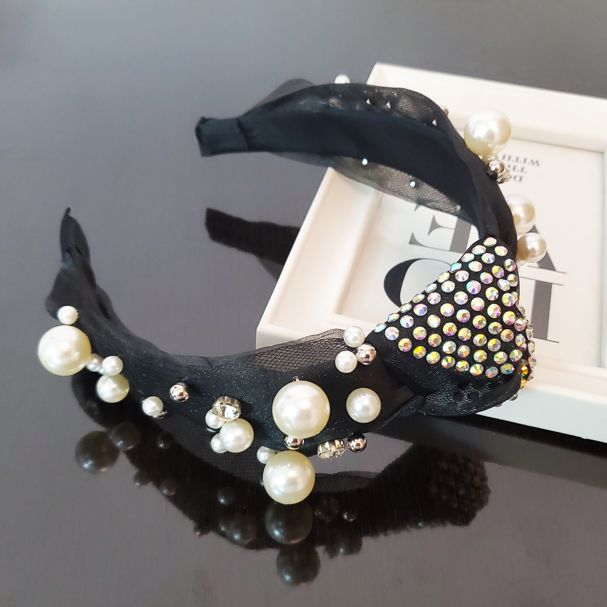 Bentita confortabila, cu captuseala la capete, imbracata in material textil fin tip voal. Bentita este innodata la mijloc sau tip turban. Pe mijloc sunt ministrasuri acrilice cu reflexii. Pe bentita sunt perle albe de diferite dimensiuni si cristale de sticla albe.