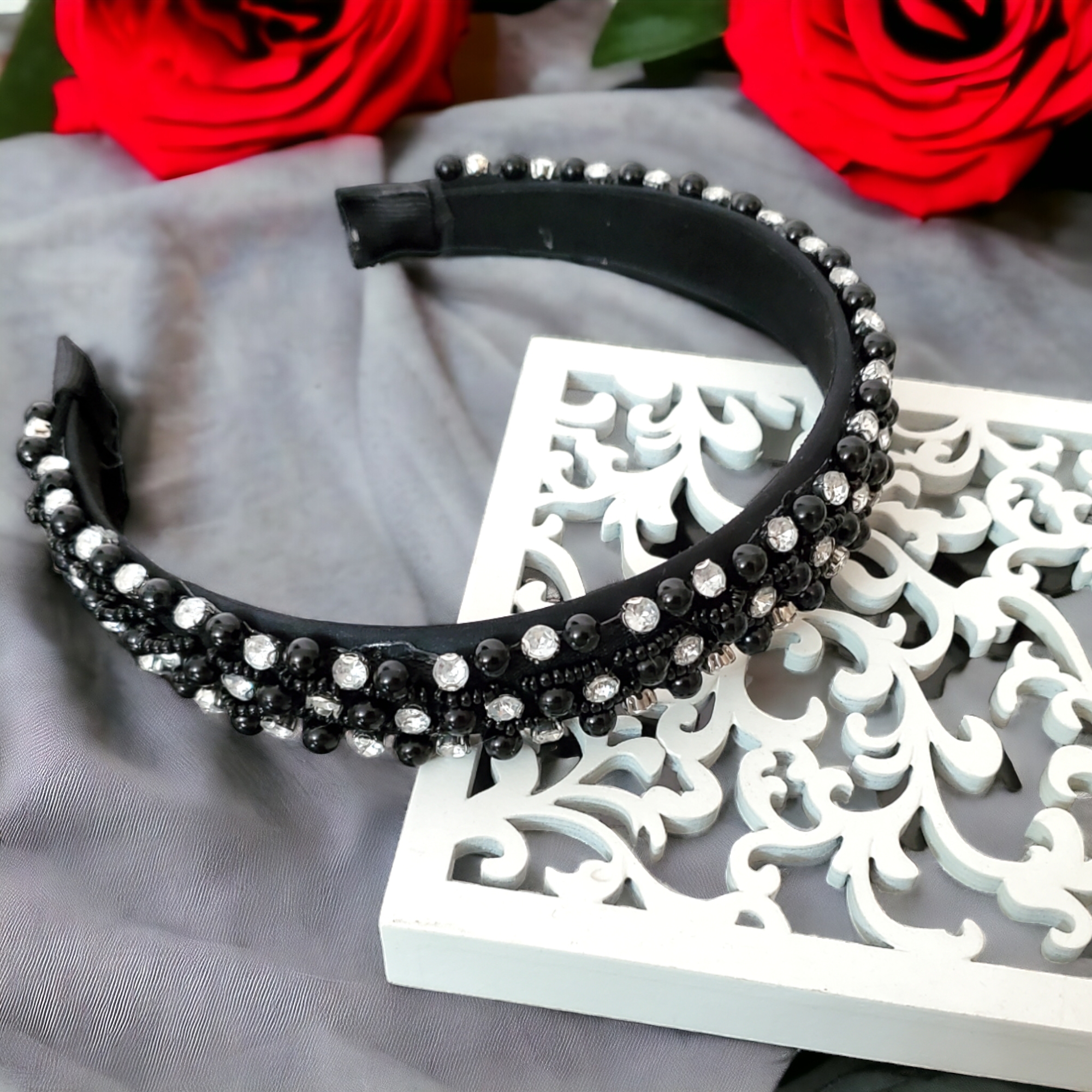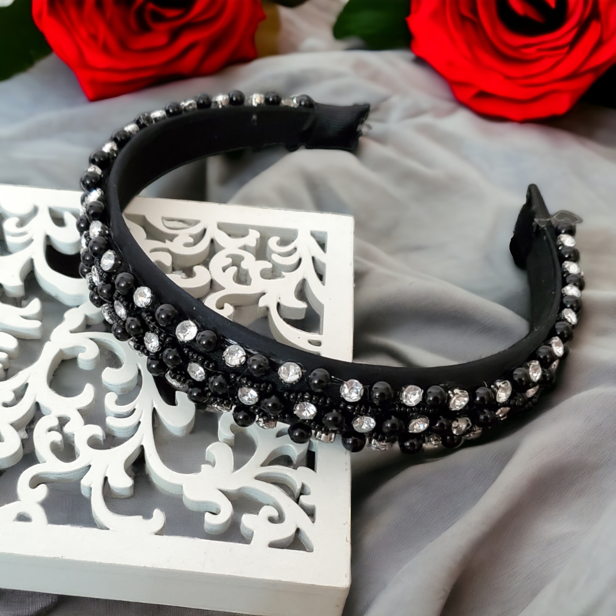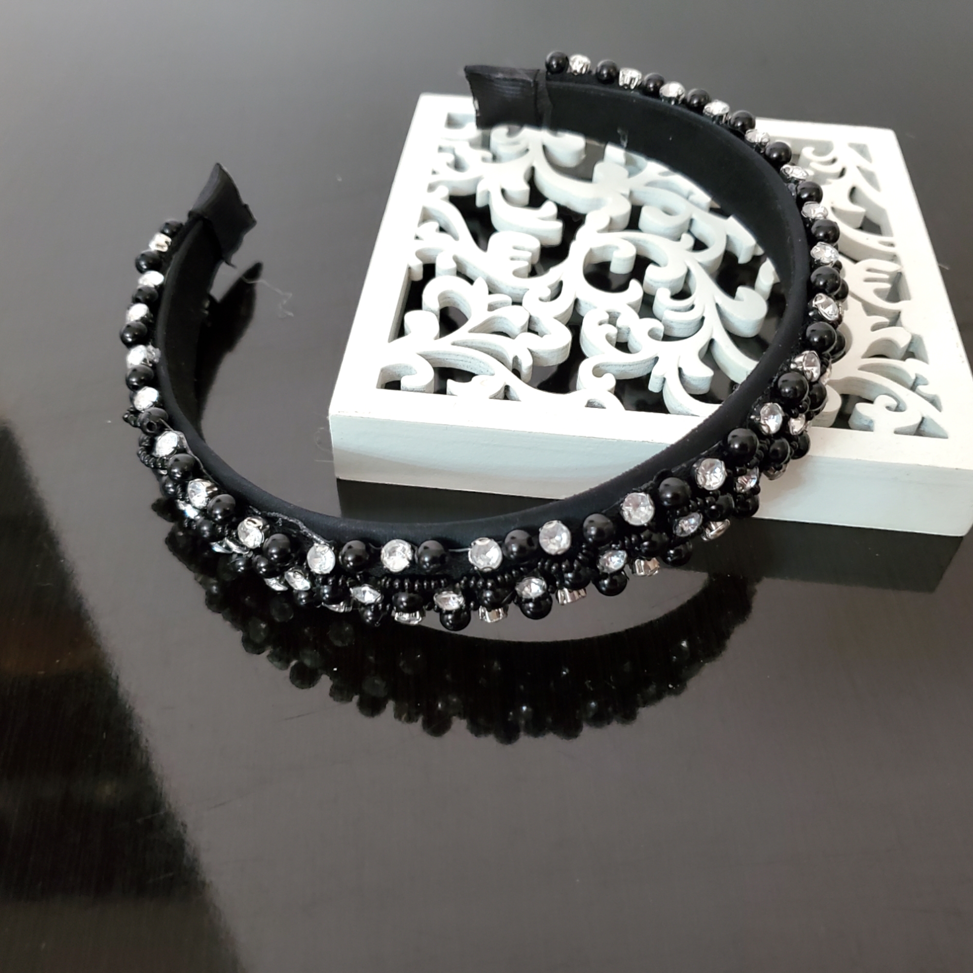 Elementele decorative cusute manual creează o armonie vizuală între luminozitatea strasurilor albe și profunzimea perlelor și mărgeluțelor negre, oferind un contrast elegant, ușor de integrat în orice ținută. Aranjează-ți părul lejer sau coafează-l sofisticat – bentița Cairo va adăuga instant un plus de rafinament și originalitate.
