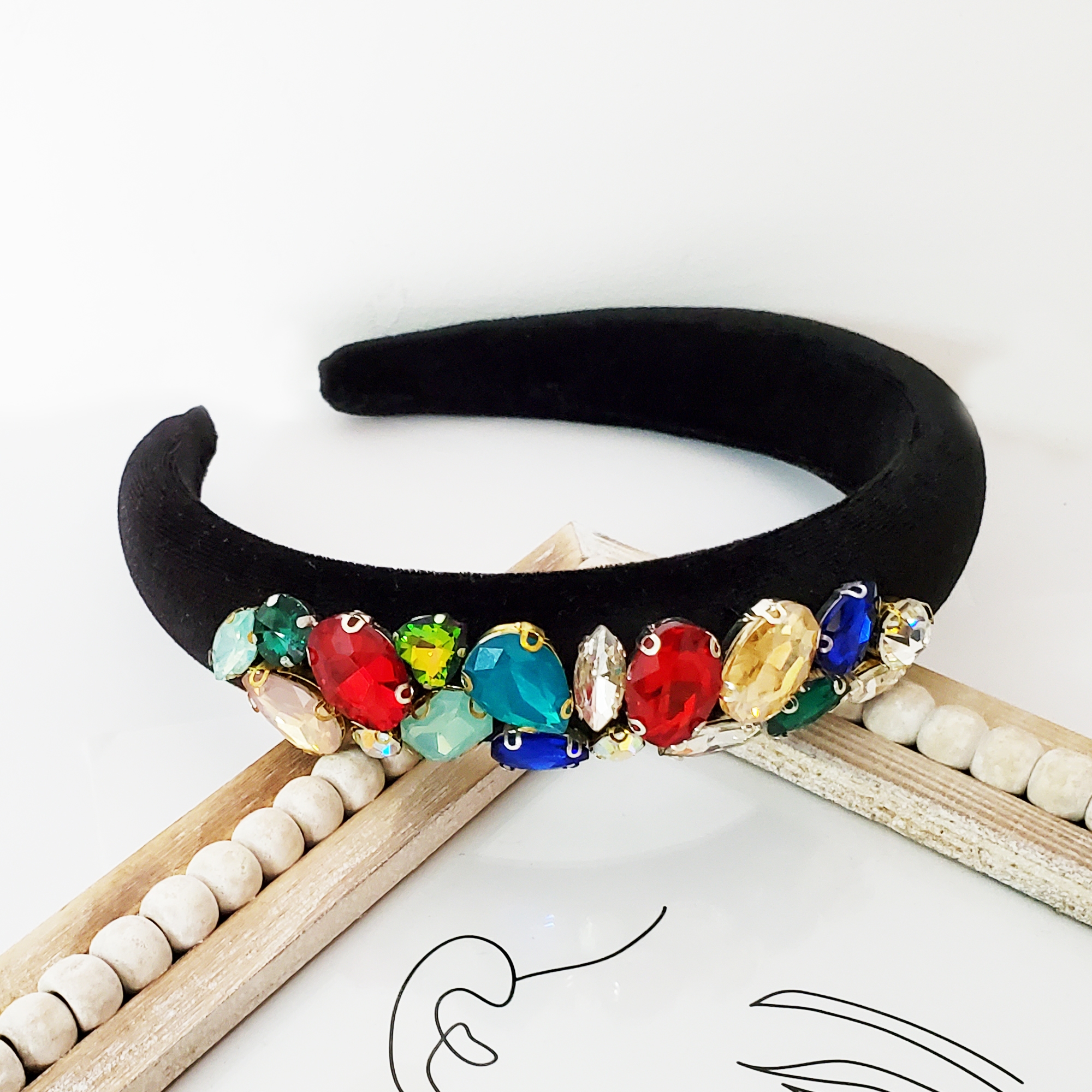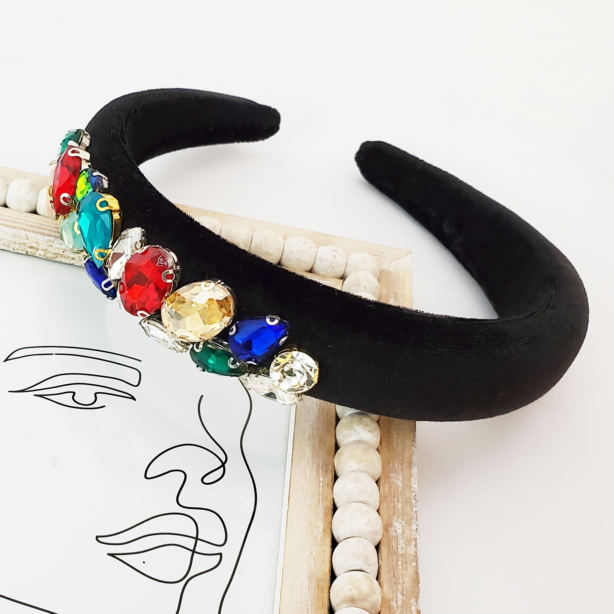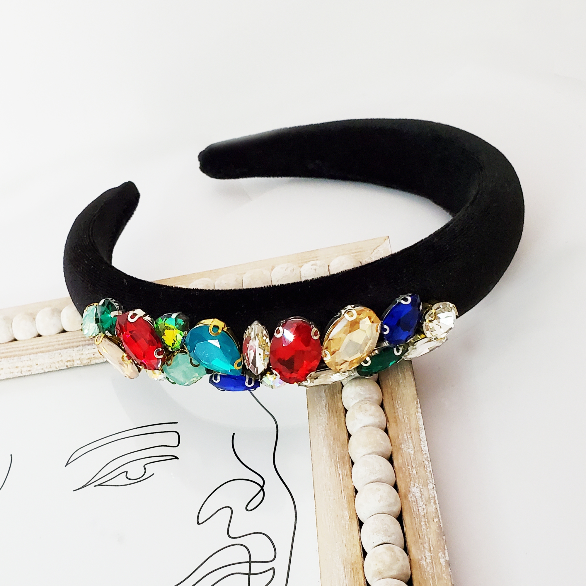 Bentita din catifea cu cristale cusute manual, pentru o pata de culoare in tinuta ta. Bentitele cu pietre sau perle sunt accesorii clasice si vor evidentia intotdeauna tinuta si machiajul tau. Spor la fitze!