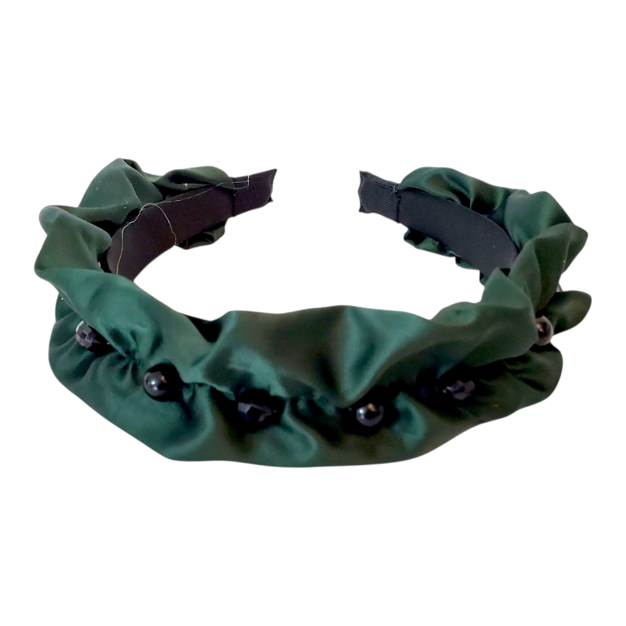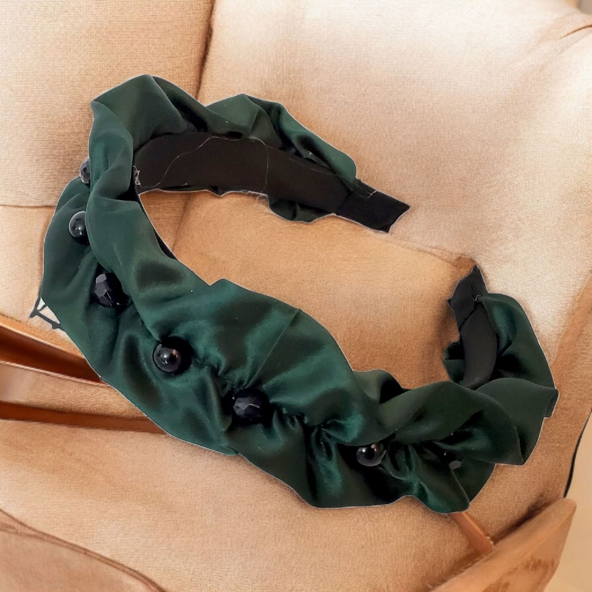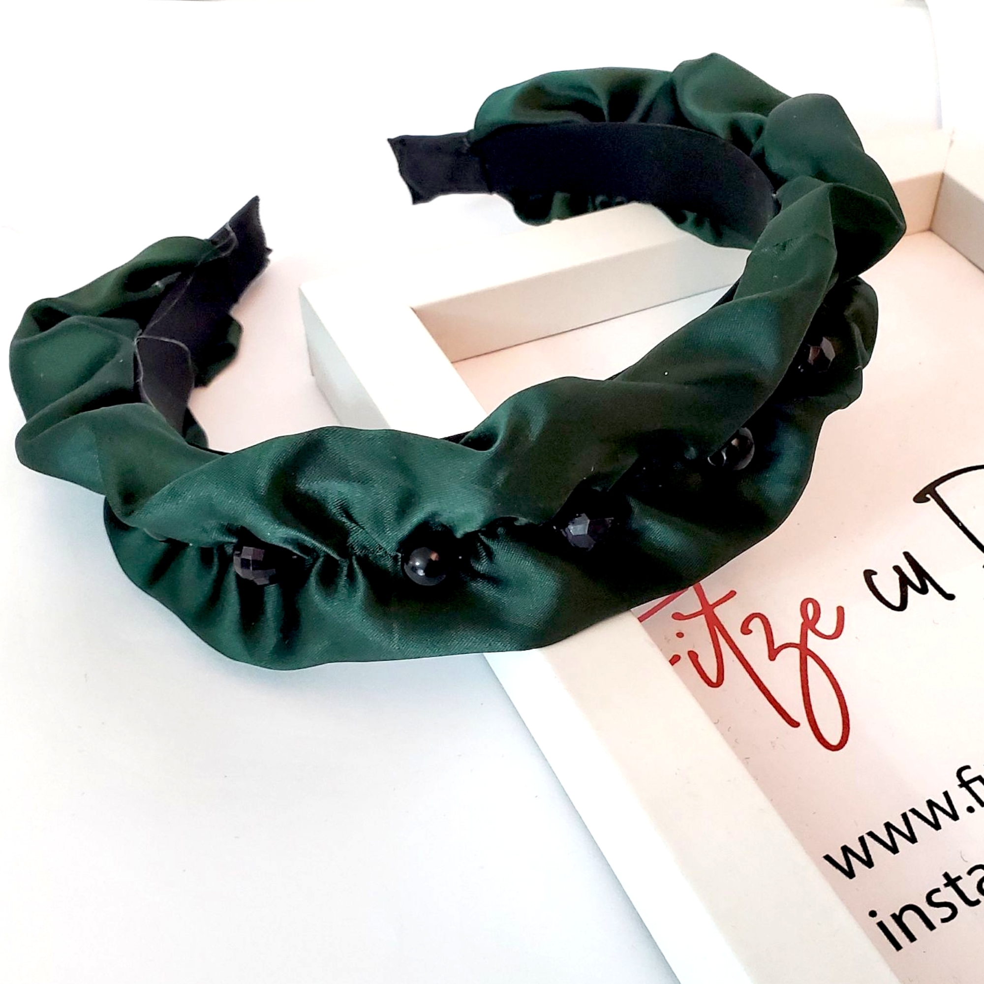 Cordeluta este confortabila, usoara, imbracata in matase verde inchis cusuta lejer pe ambele parti. Pe mijloc sunt cusute perle fatetate negre. Se livreaza in sac textil pentru bijuterii.