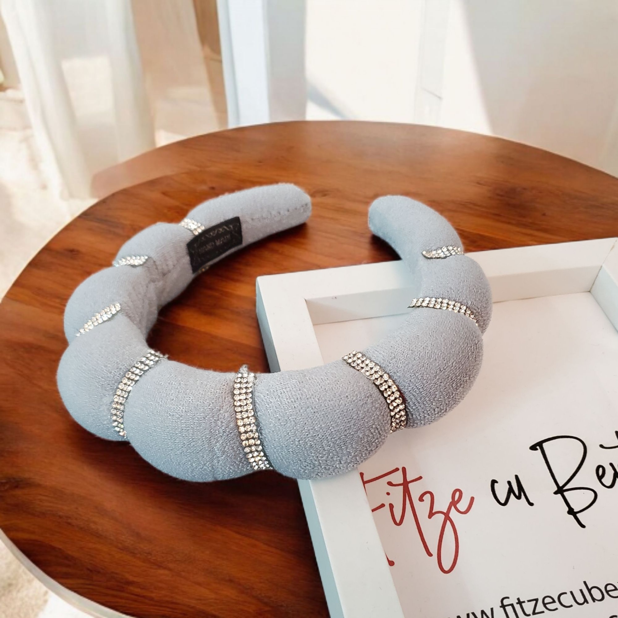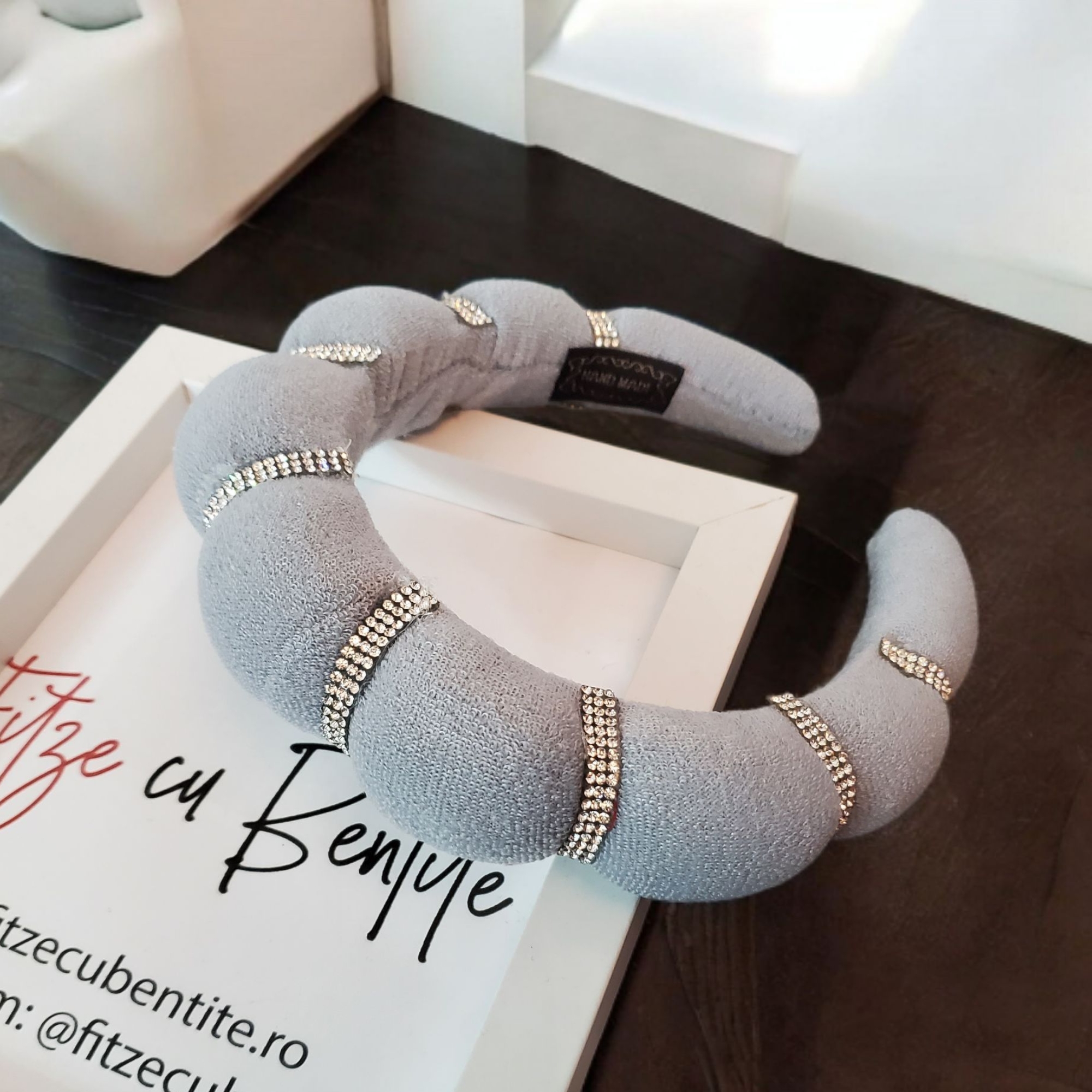 Bentita este realizata pe suport confortabil imbracat in material textil gri deschis. Bentita are insertie de burete pentru un plus de volum si eleganta. In exterior sunt aplicate ministrasuri albe cu putere mare de reflexie Bentita se poate purta cu usurinta fara sa jeneze in spatele urechilor sau sa doara.