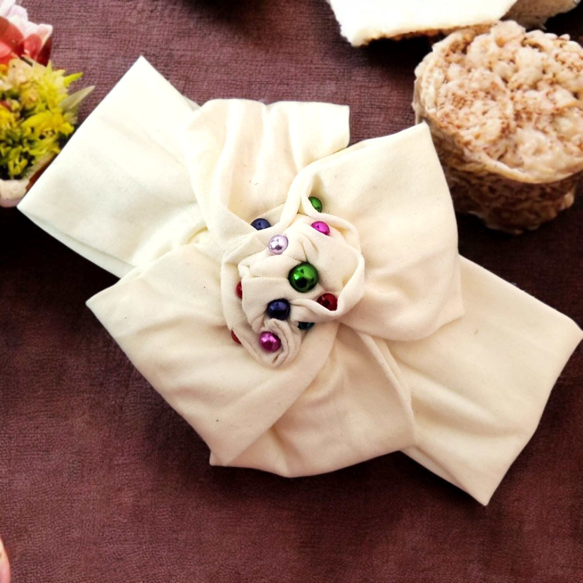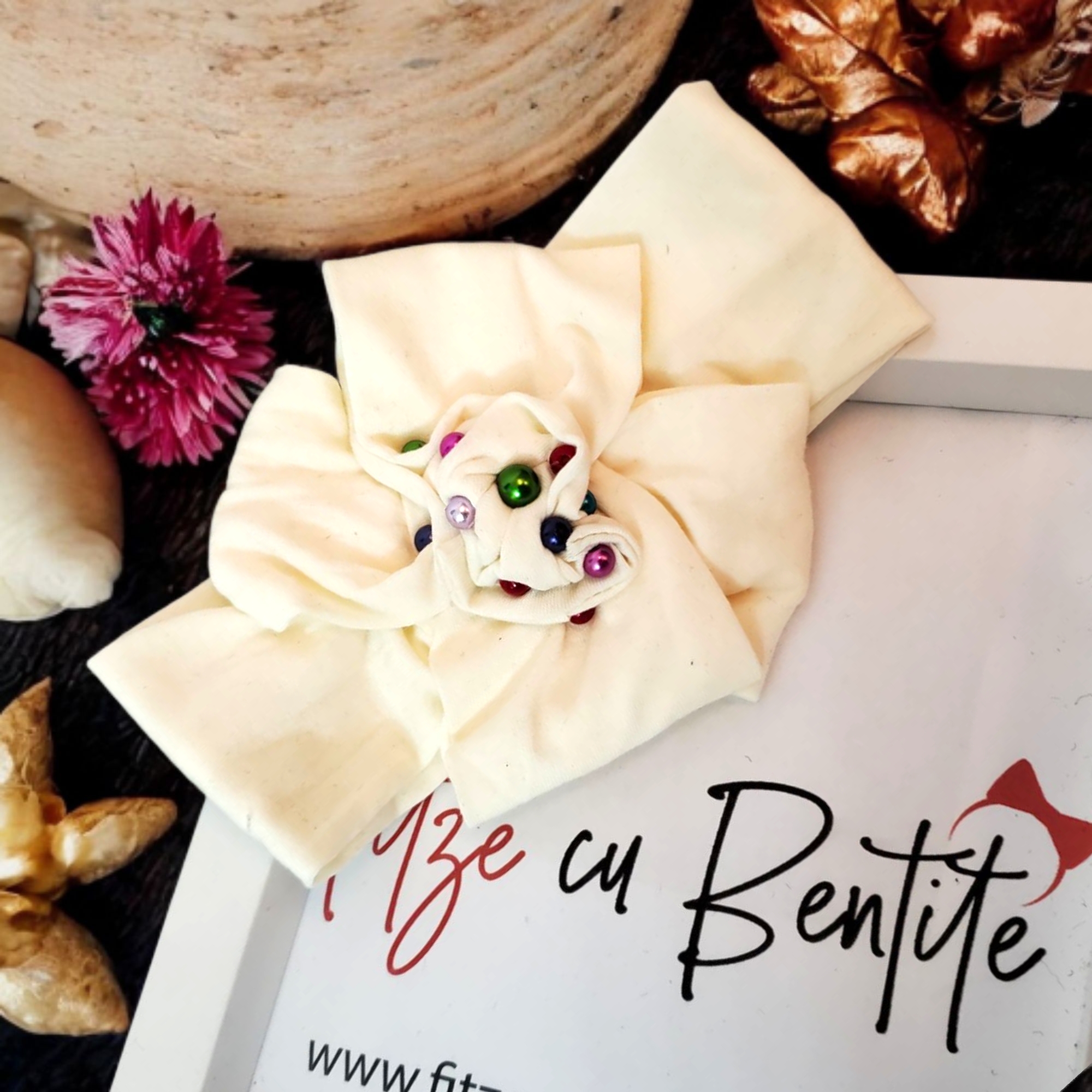 Bandana moale de culoarea untului cu o funda mare din acelasi material. Pe funda sunt cusute perle multicolore de diferite forme si marimi.