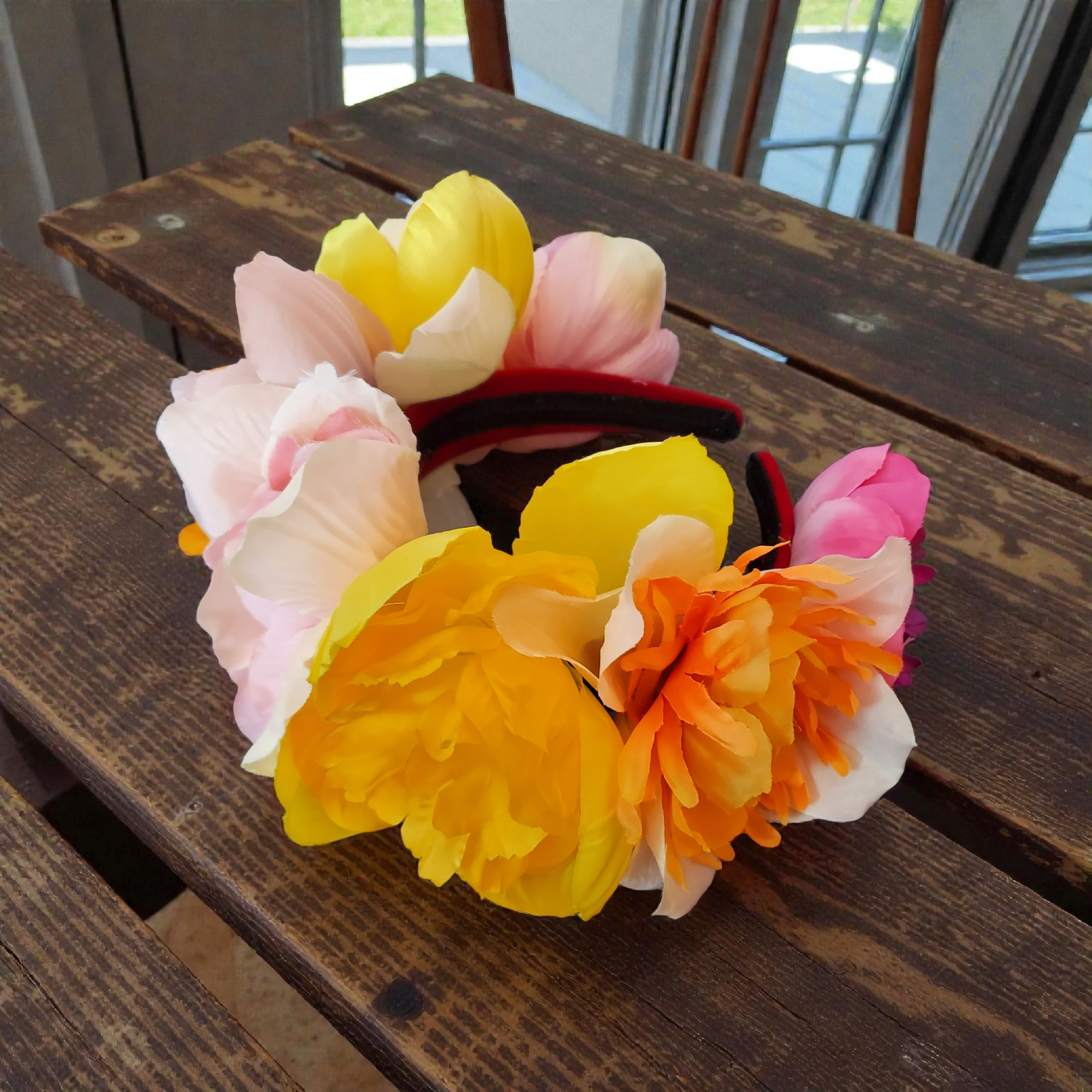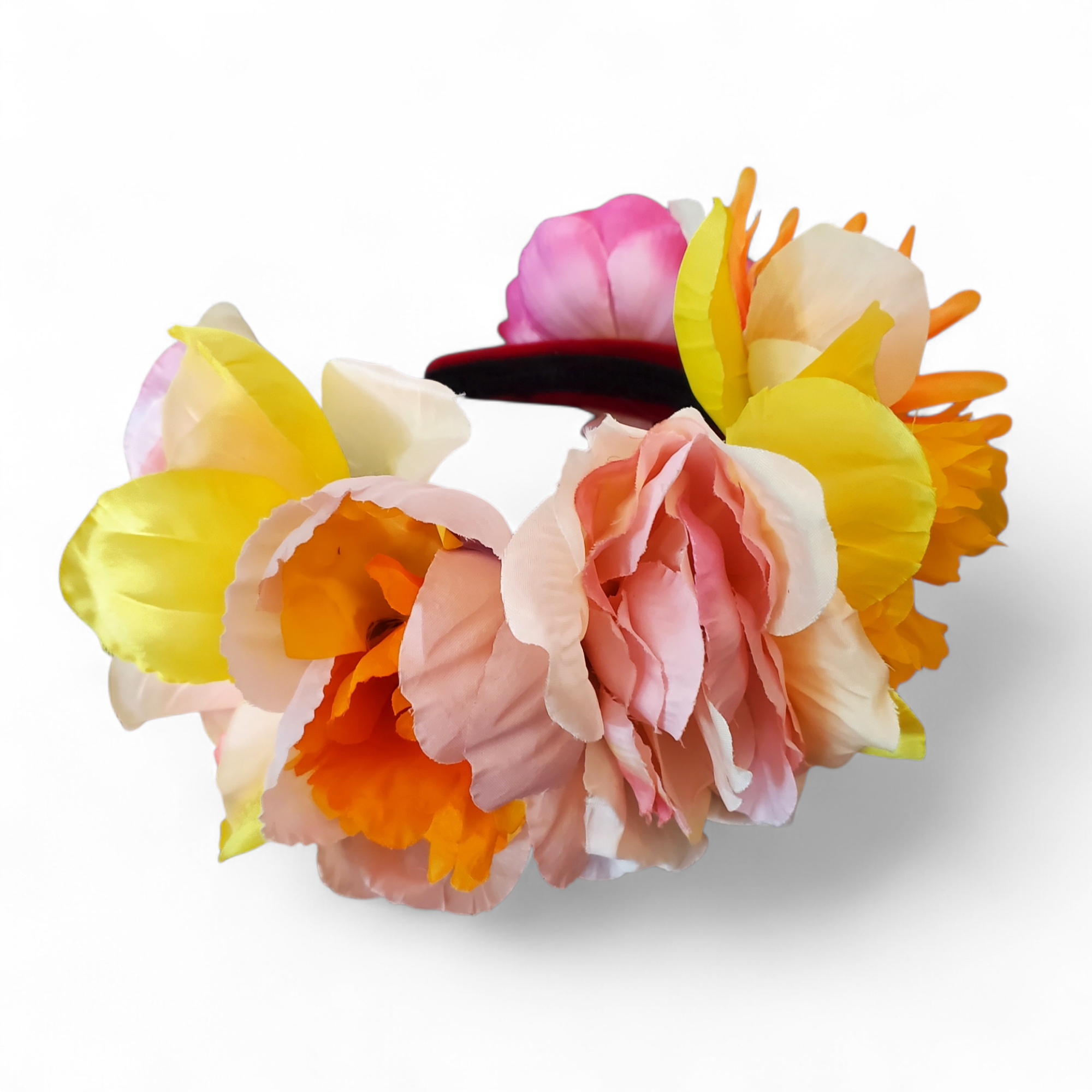 Bentita cu flori textile in culori calde, pe suport confortabil. Bentitele sunt accesorii clasice si vor evidentia intotdeauna tinuta si machiajul tau. Spor la fitze!