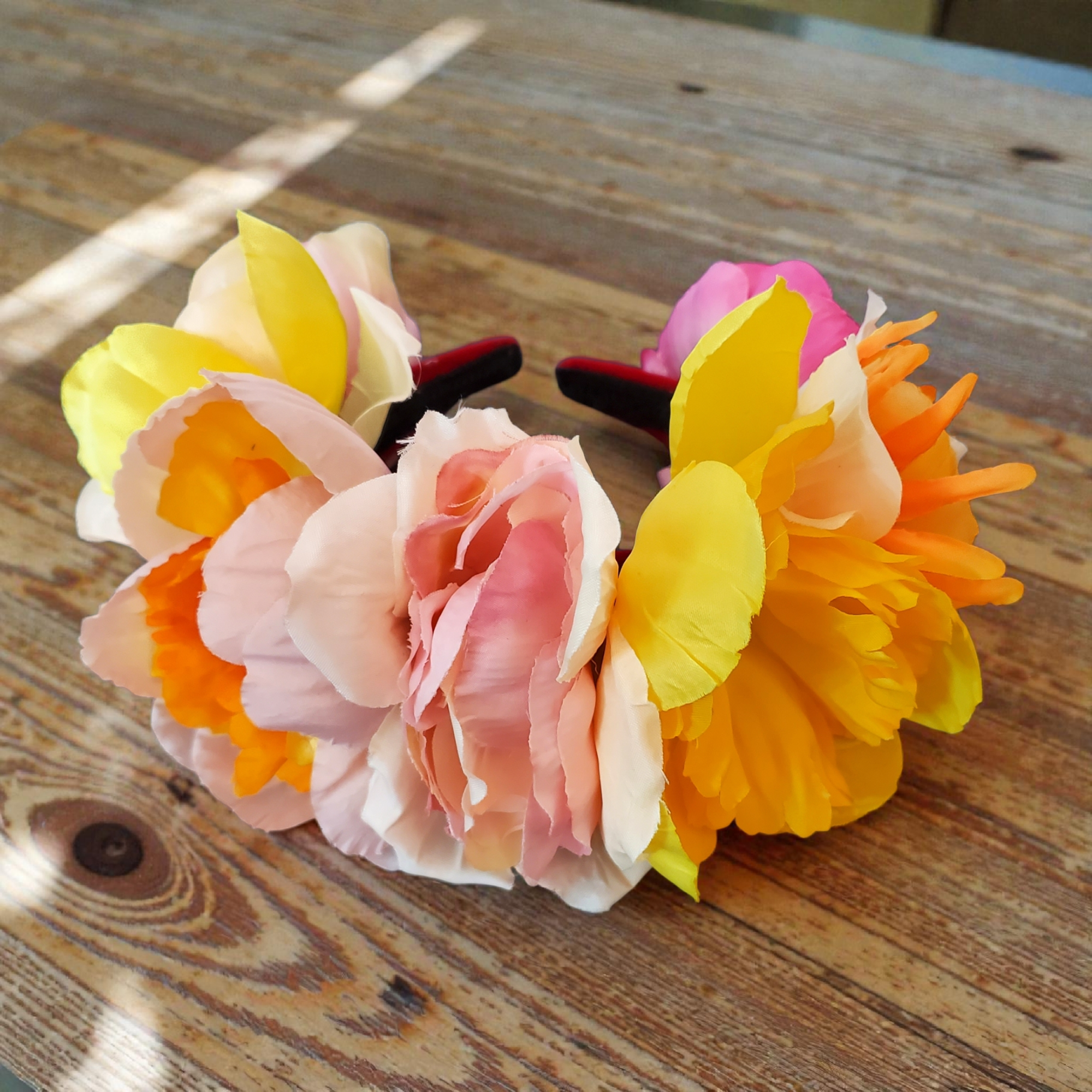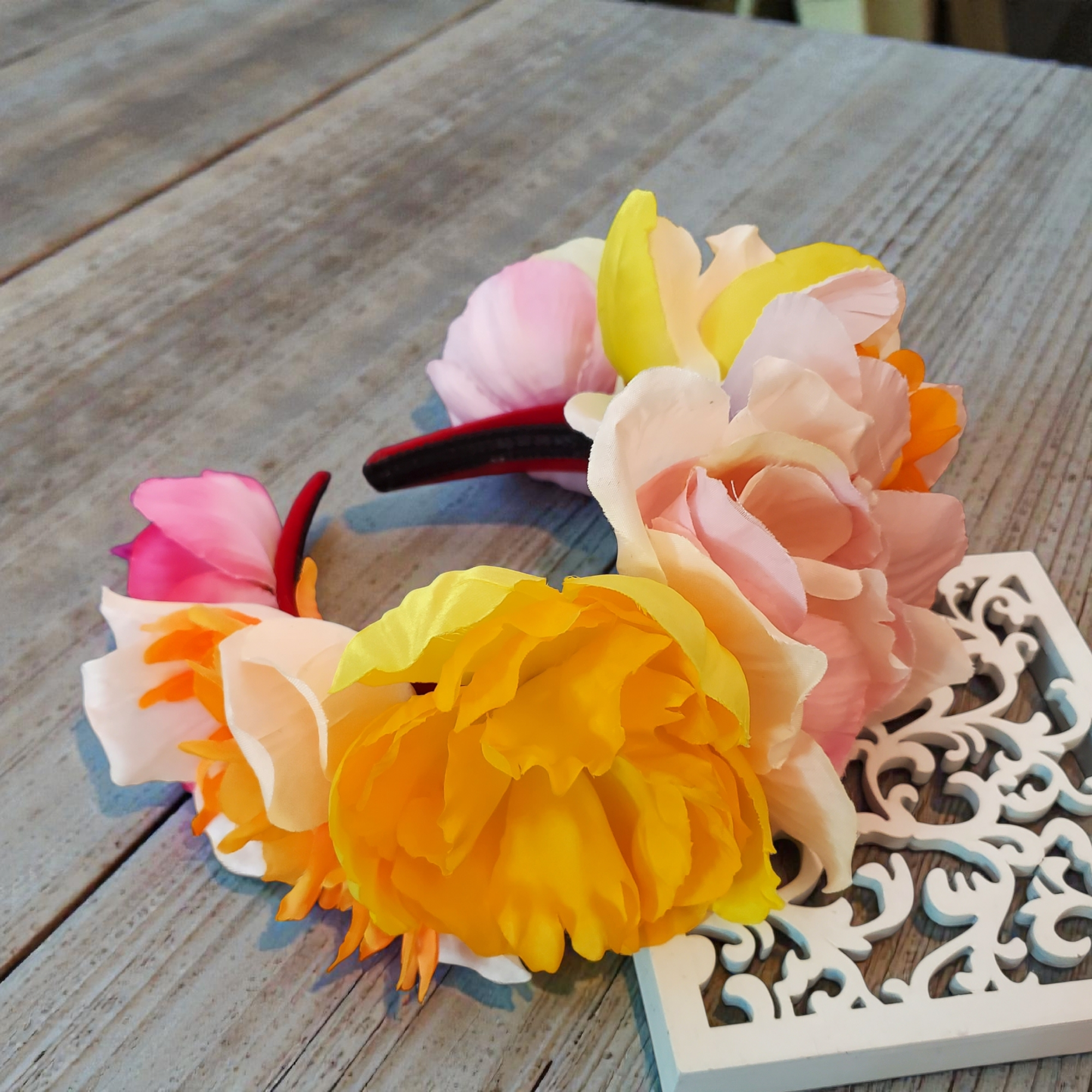 Bentita este realizata pe suport confortabil, nu aluneca, nu necesita agrafe, imbracat in catifea. In exterior sunt cusute flori textile in nuante calde de roz, galben, portocaliu, si perle acrilice. In interior bentita are captuseala care ajuta la stabilitate pe orice coafura. Datorita captuselii bentita se poate purta cu usurinta fara sa jeneze in spatele urechilor sau sa doara. Bentita este unica si irepetabila, lucrata manual.