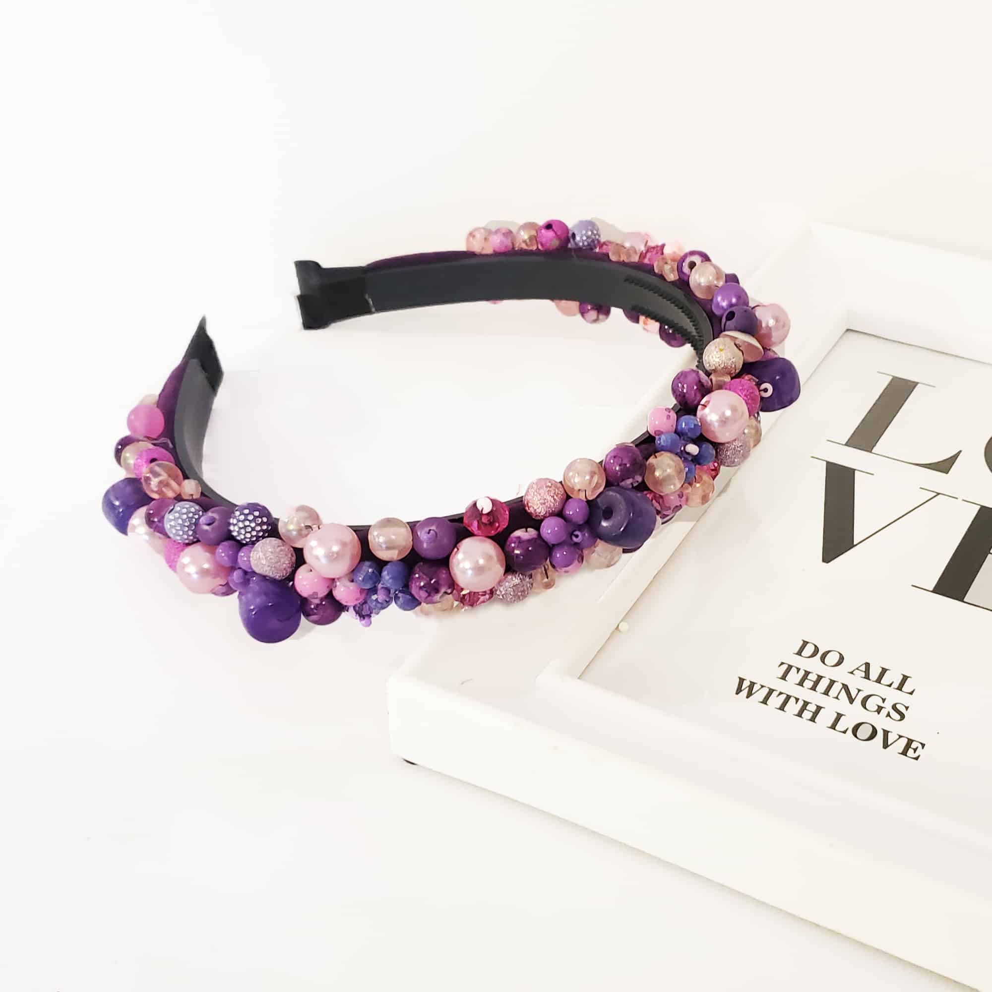 Descoperă Bentita Happy Purple – un accesoriu handmade ce îmbină catifeaua fină, perle delicate și flori metalice în nuanțe de mov și roz. Fixare sigură, confort deplin, design unic. Transformă orice ținută, de la office la elegant, într-o poveste plină de rafinament și stil!
