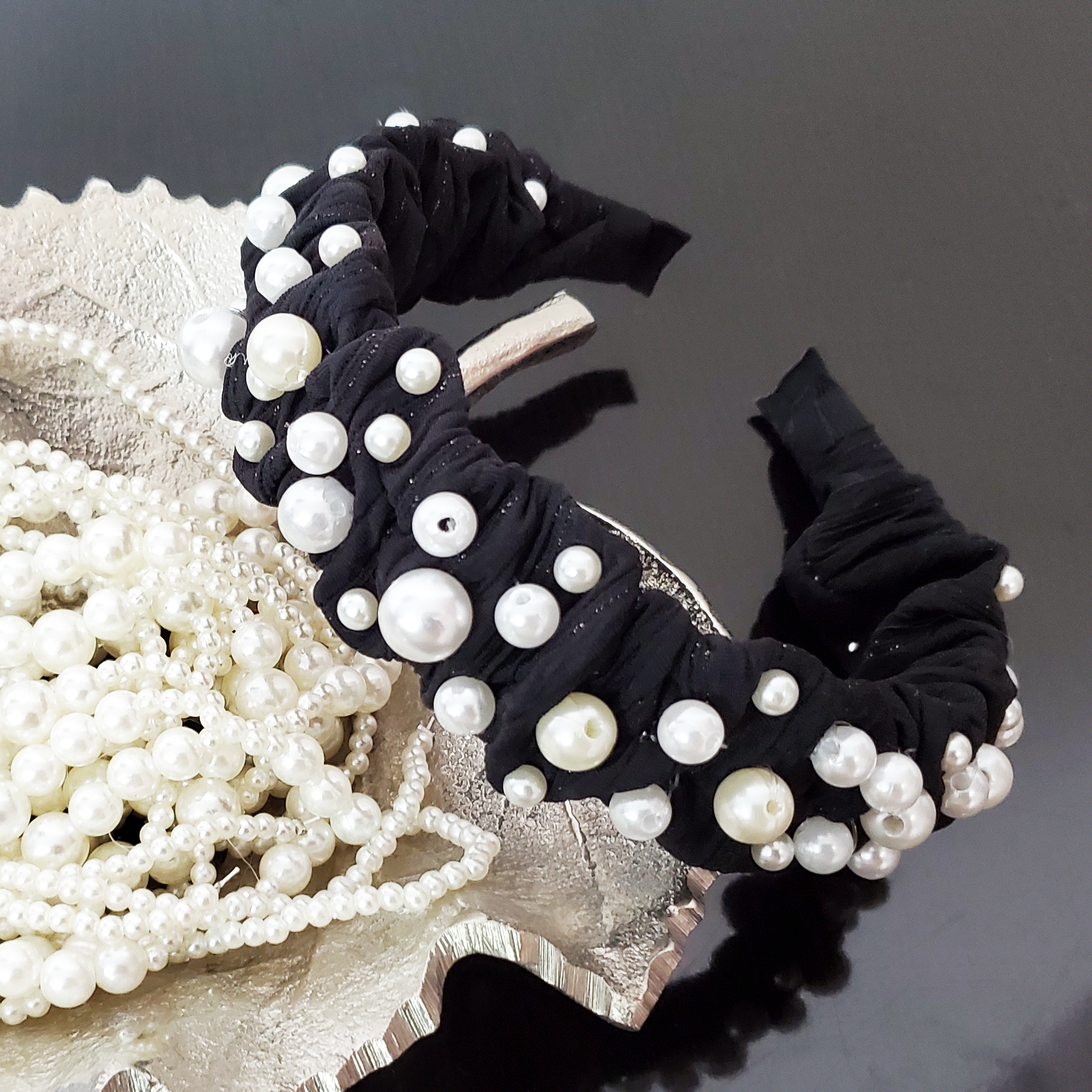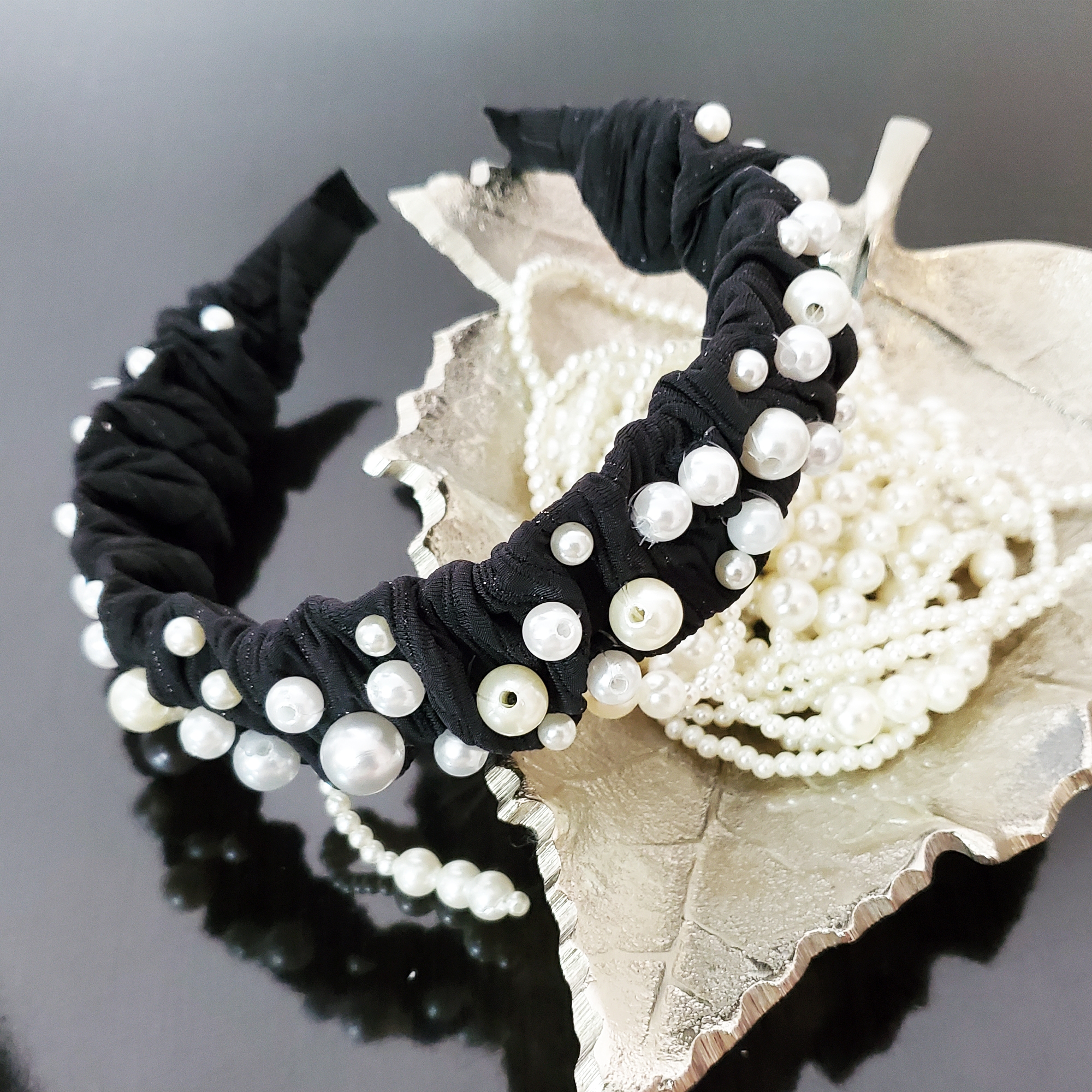 Descoperă rafinamentul cu bentita Helena negru, creată pe suport confortabil, din material textil fin cu pliuri și perle albe cusute manual. O alegere versatilă, perfectă pentru stil office, casual sau elegant, ce îți va pune în valoare feminitatea la fiecare pas. Marime universală.