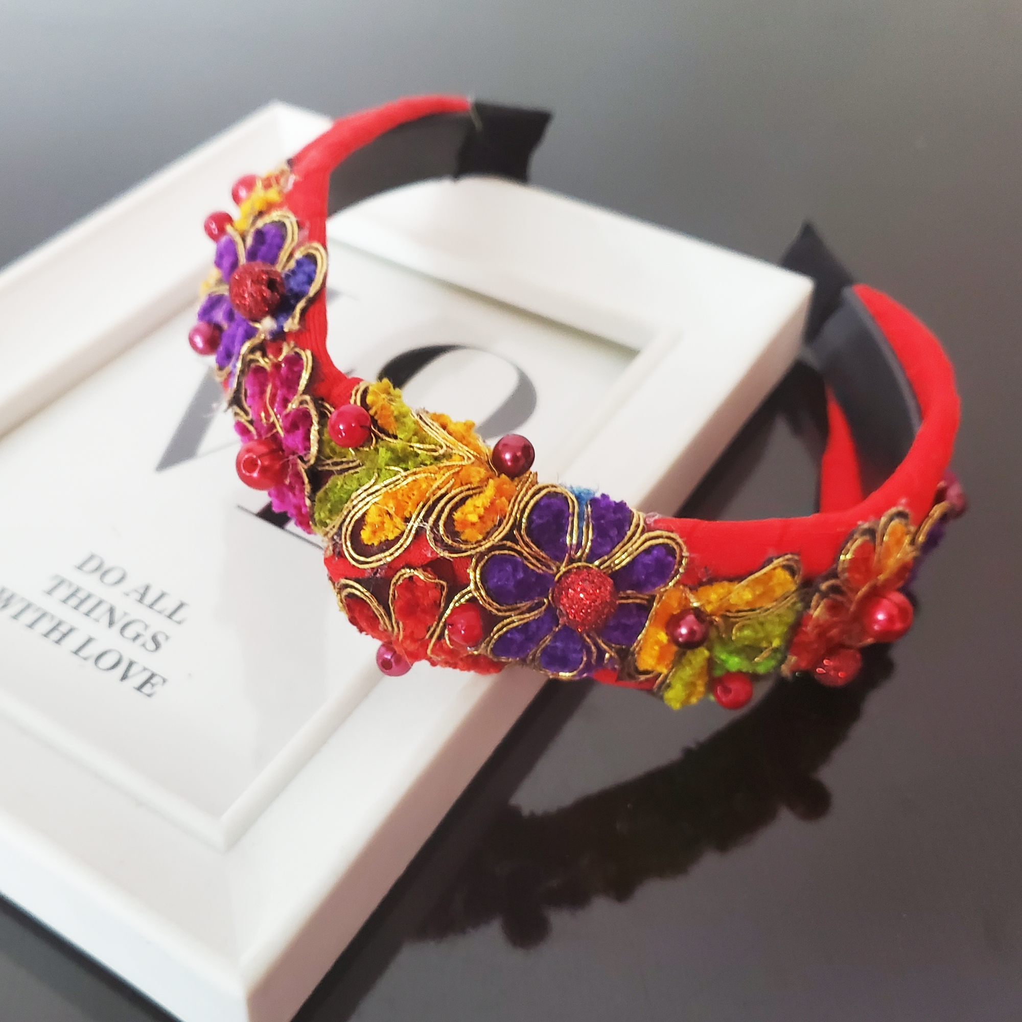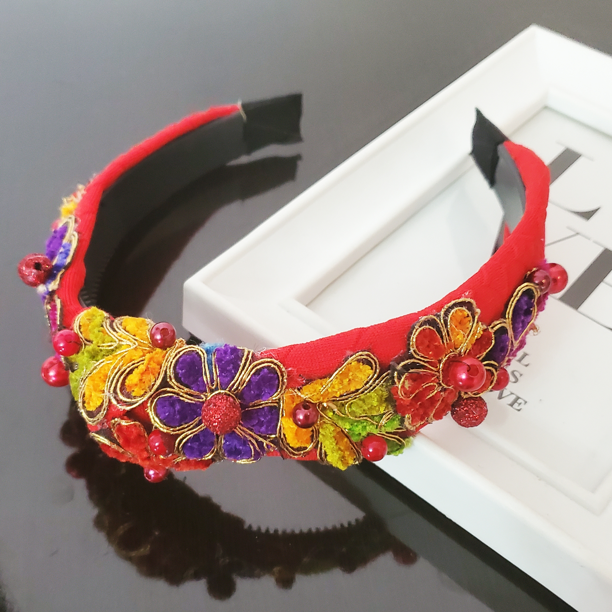 Descoperă farmecul verii cu bentita Red Summer, lucrată manual, cu flori și frunze din catifea și perle roșii cusute individual. Suportul moale, de culoare vibrantă, nu alunecă și nu necesită agrafe. Potrivire universală, pentru un look rafinat, plin de personalitate.