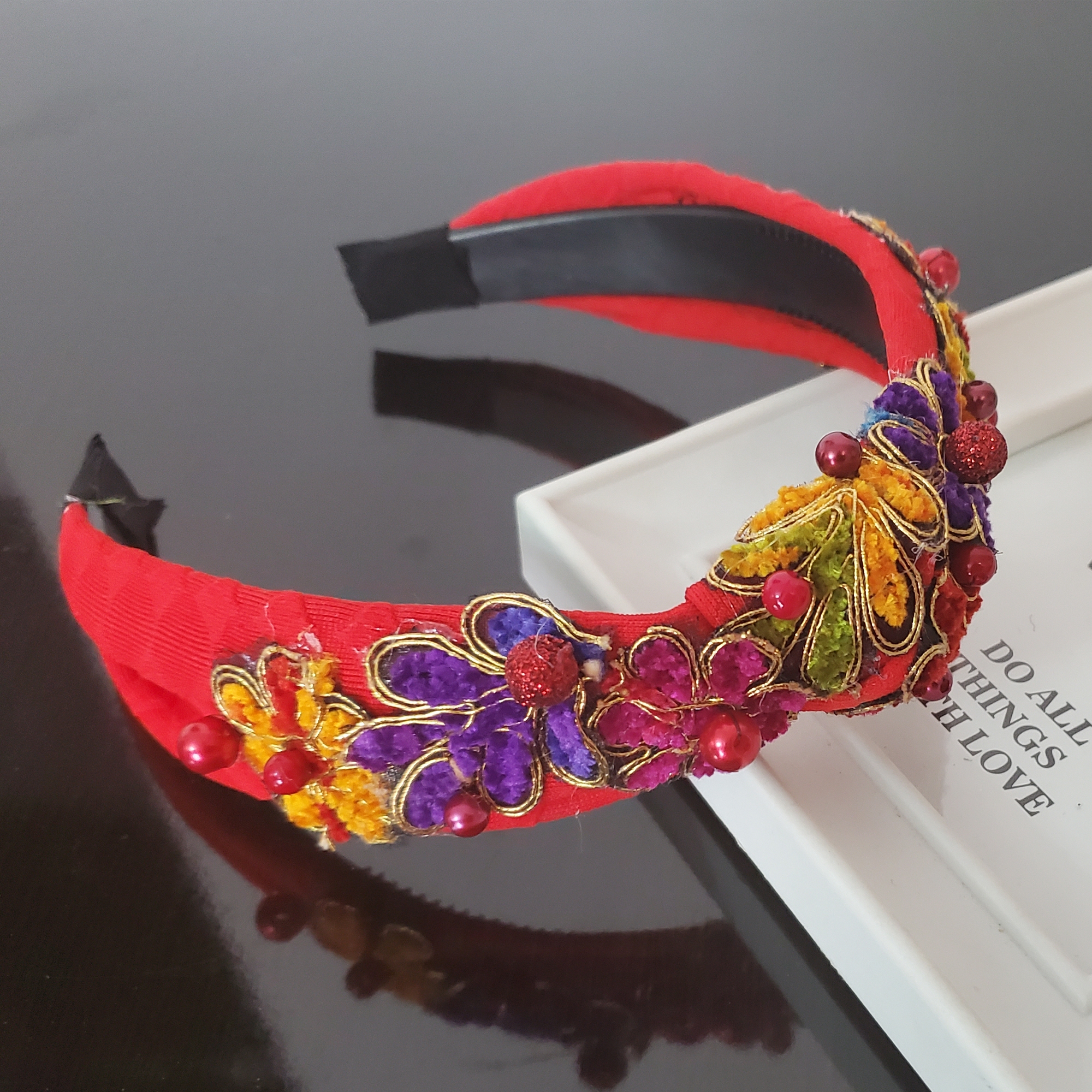 Bentita Red Summer nu este doar un accesoriu, ci o invitație la a-ți exprima personalitatea cu fiecare gest. Creată special pentru a asigura confortul suprem, bentita nu alunecă, nu strânge și nu necesită fixare suplimentară, fiind perfectă pentru zilele aglomerate sau serile relaxante. Textura catifelată și perlele delicate îți îmbracă părul într-o aură de mister și rafinament, în timp ce nuanțele de roșu aduc energie și pasiune fiecărei ținute.