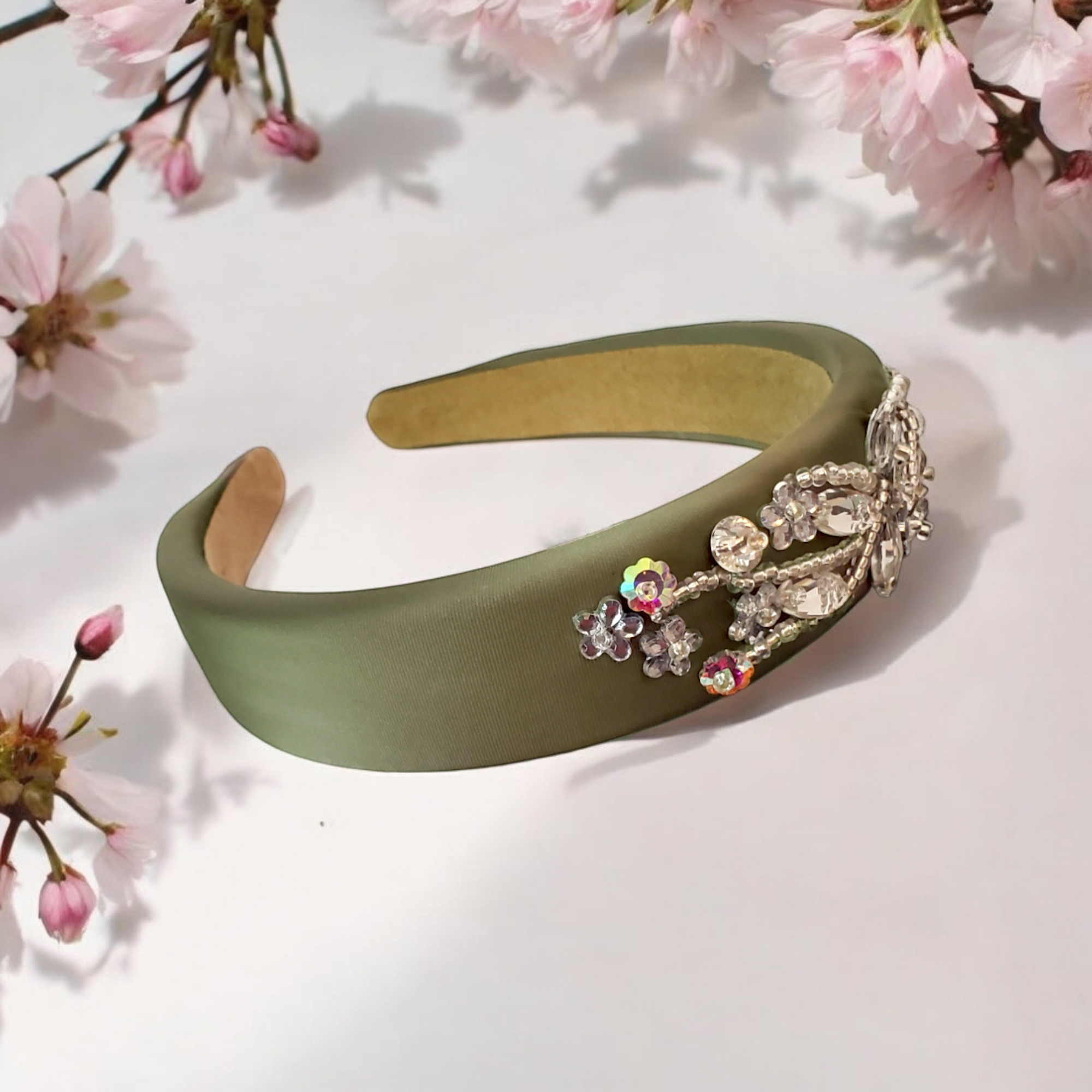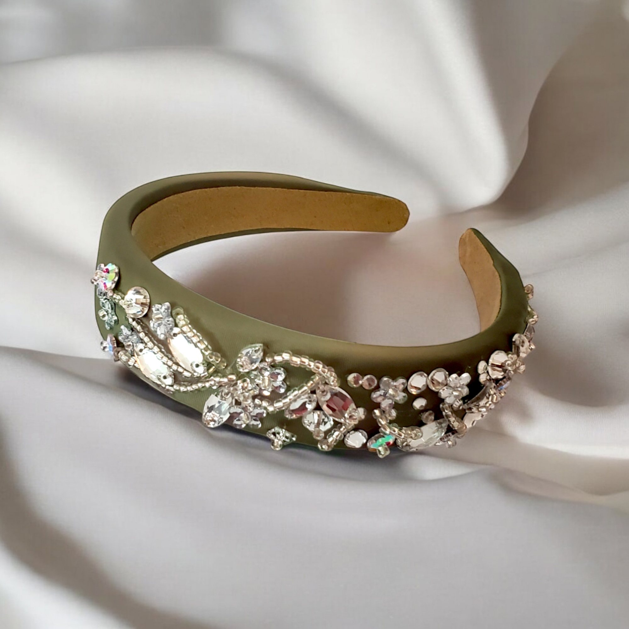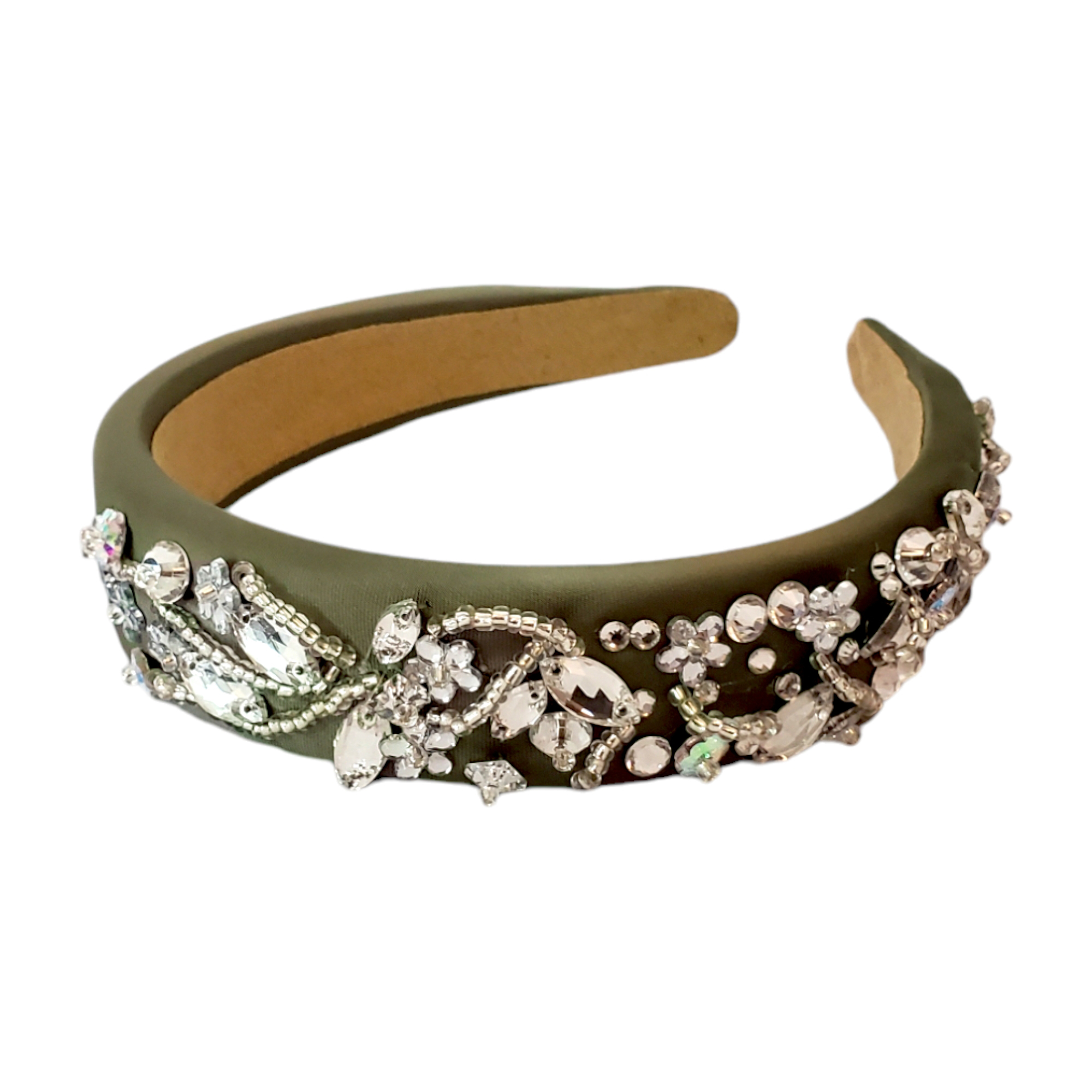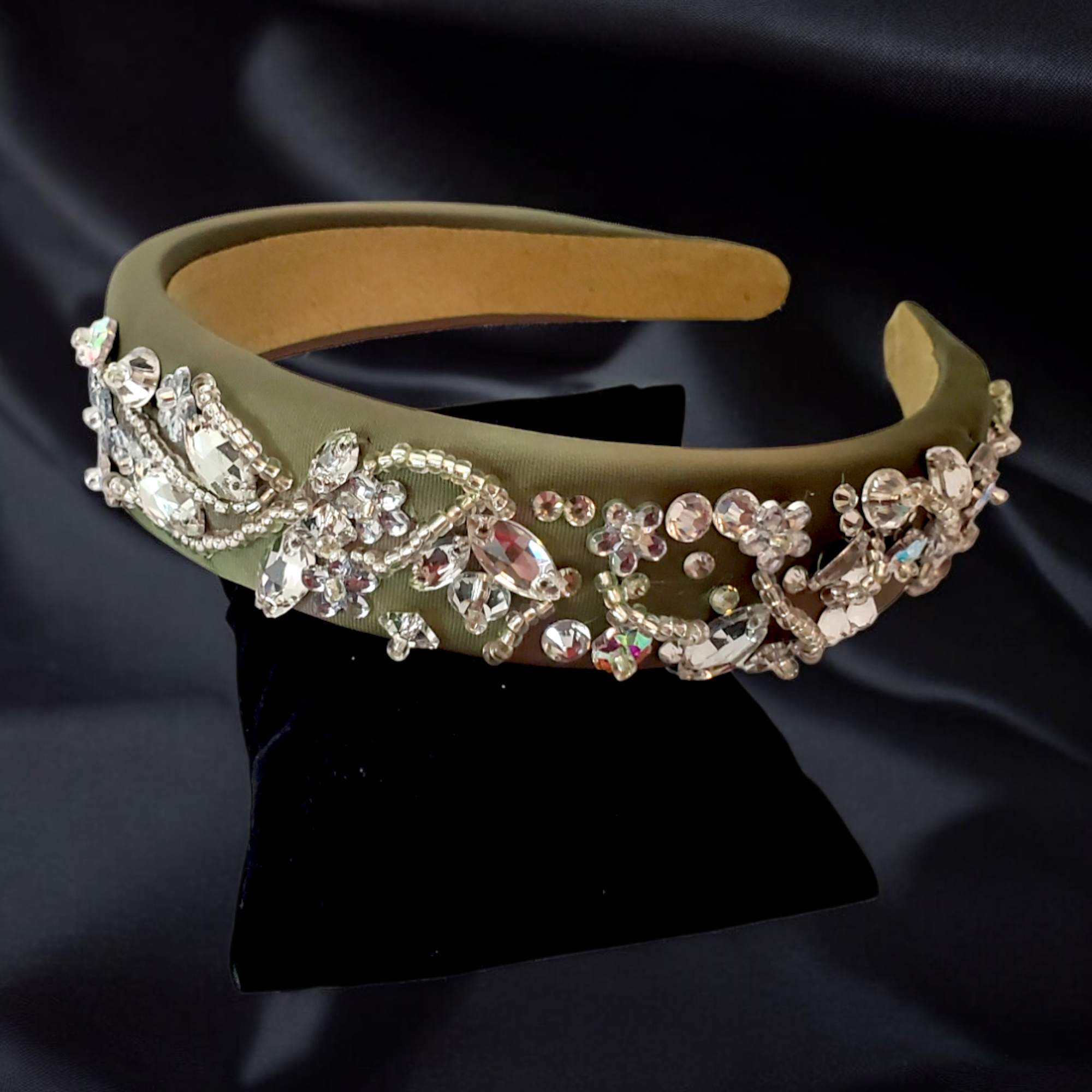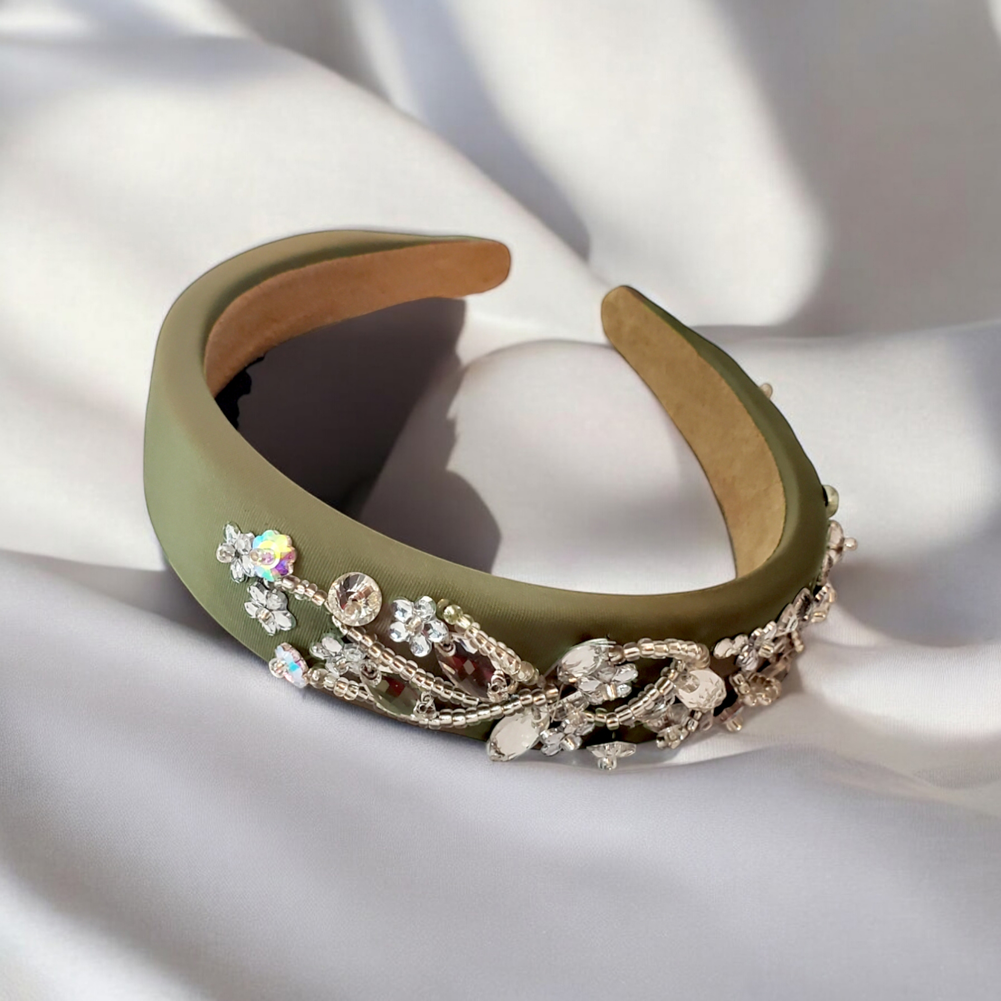 Descoperă farmecul discret al bentitei Roma: satin lucios gri verzui, cristale de sticlă cusute manual ce prind lumina în forme unice. O piesă versatilă, perfectă pentru orice ținută – de la office la elegant. Universala, mereu confortabilă, gata să-ți spună povestea stilului tău.