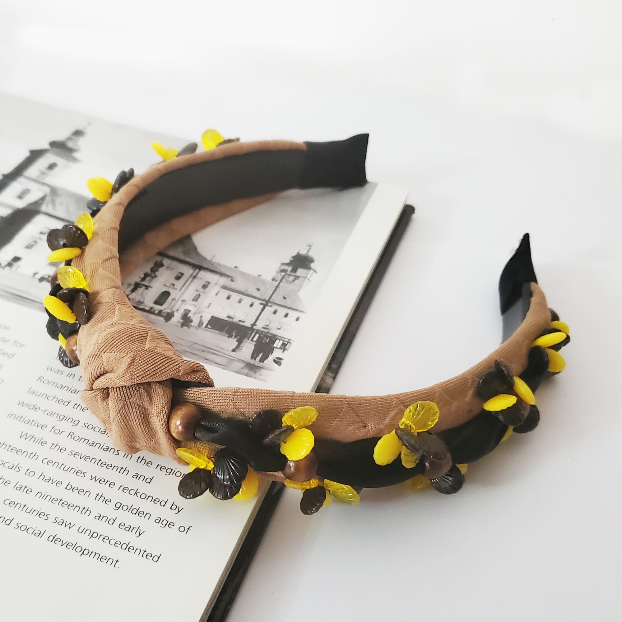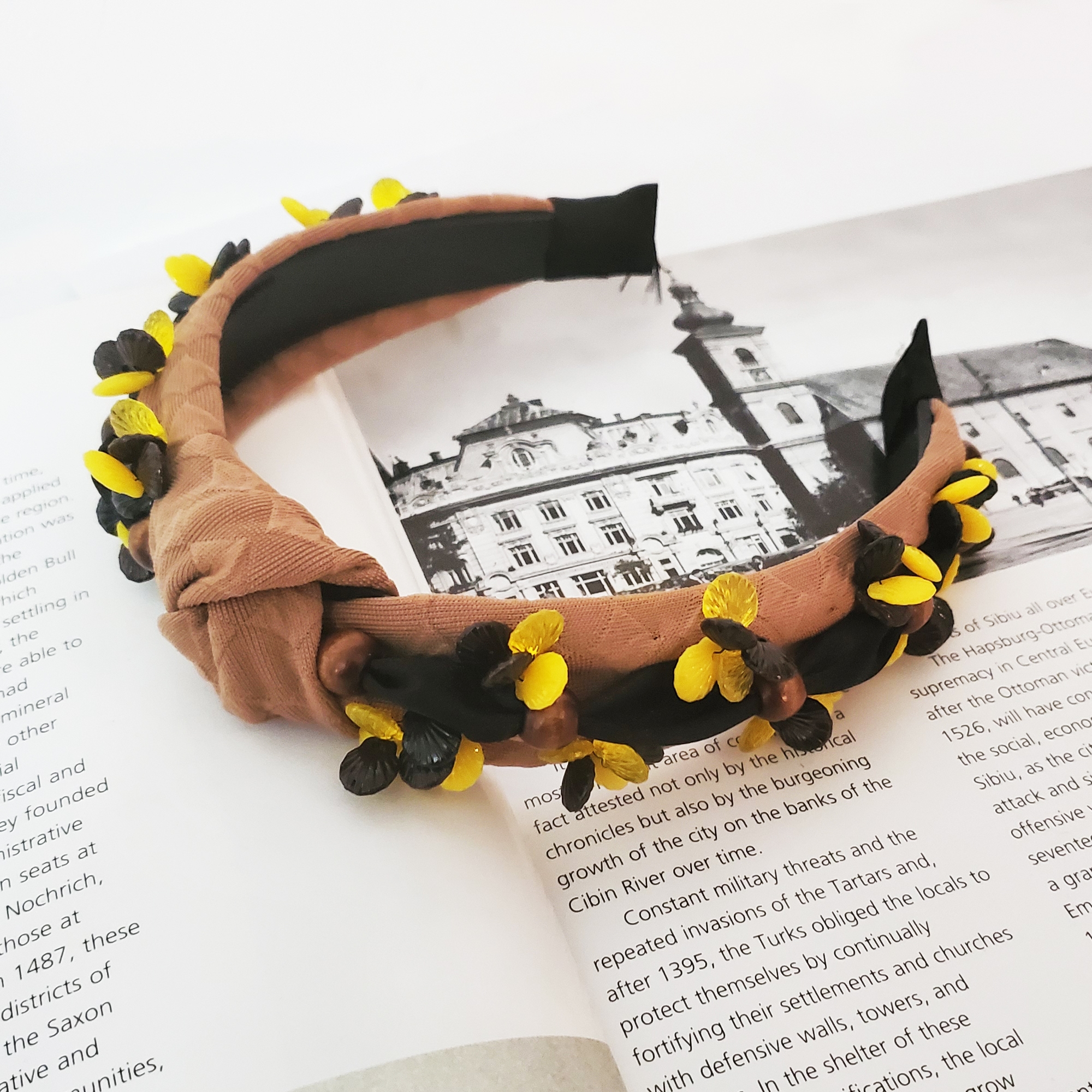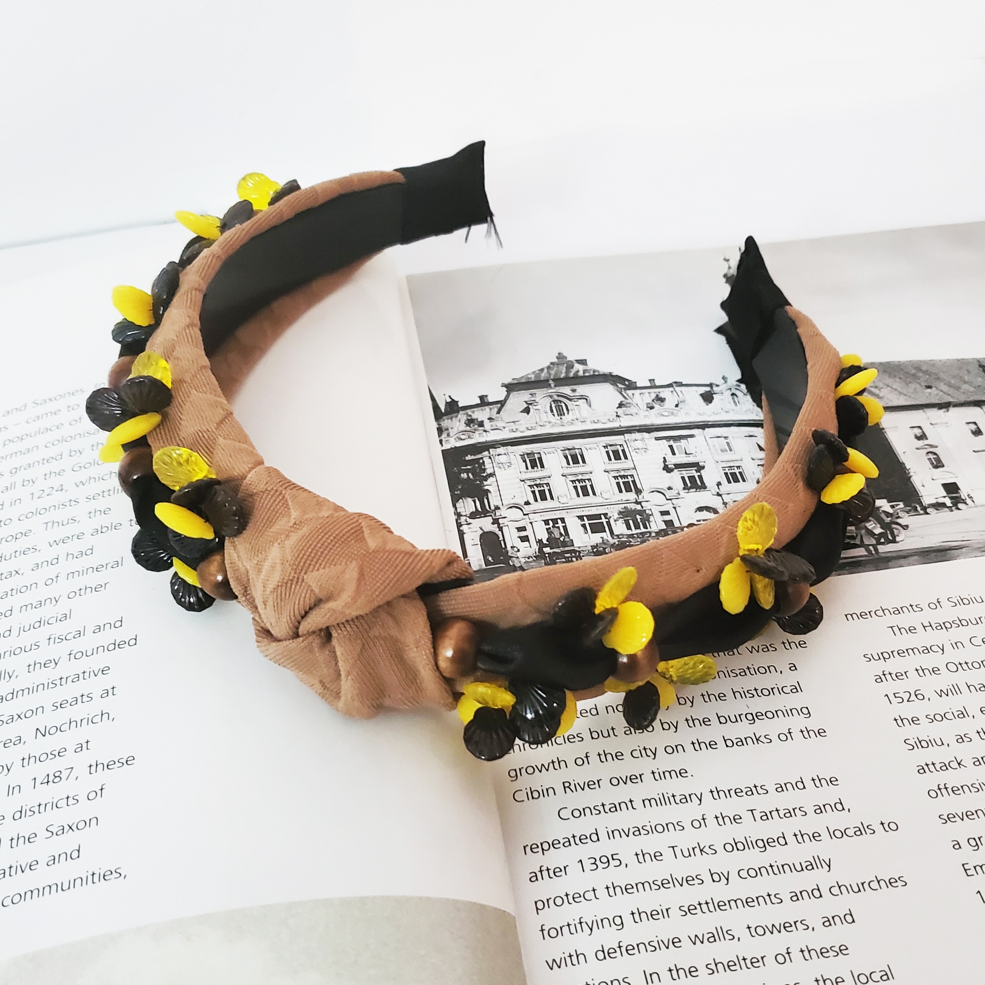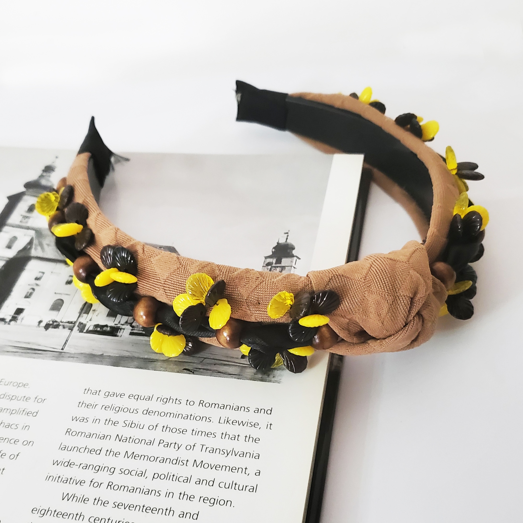 Descoperă eleganța atemporală cu bentita Sandy, accesoriul care transformă orice ținută. Realizată pe suport confortabil, nu alunecă și nu necesită agrafe, fiind îmbrăcată în material maro deschis, cu perle cusute manual în nuanțe de maro, galben și negru. Perfectă pentru stil office, casual sau elegant. Marime universală, fixare sigură cu pieptene interior.