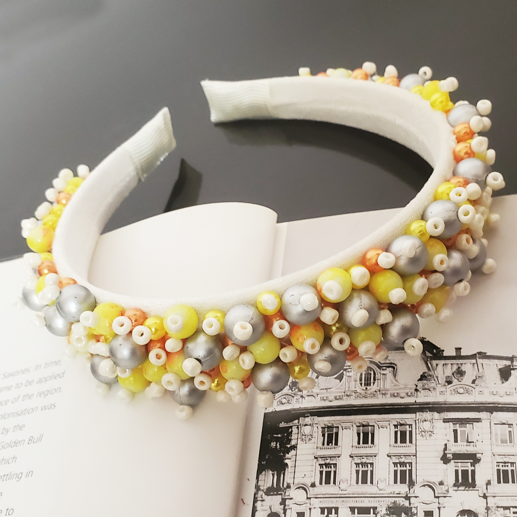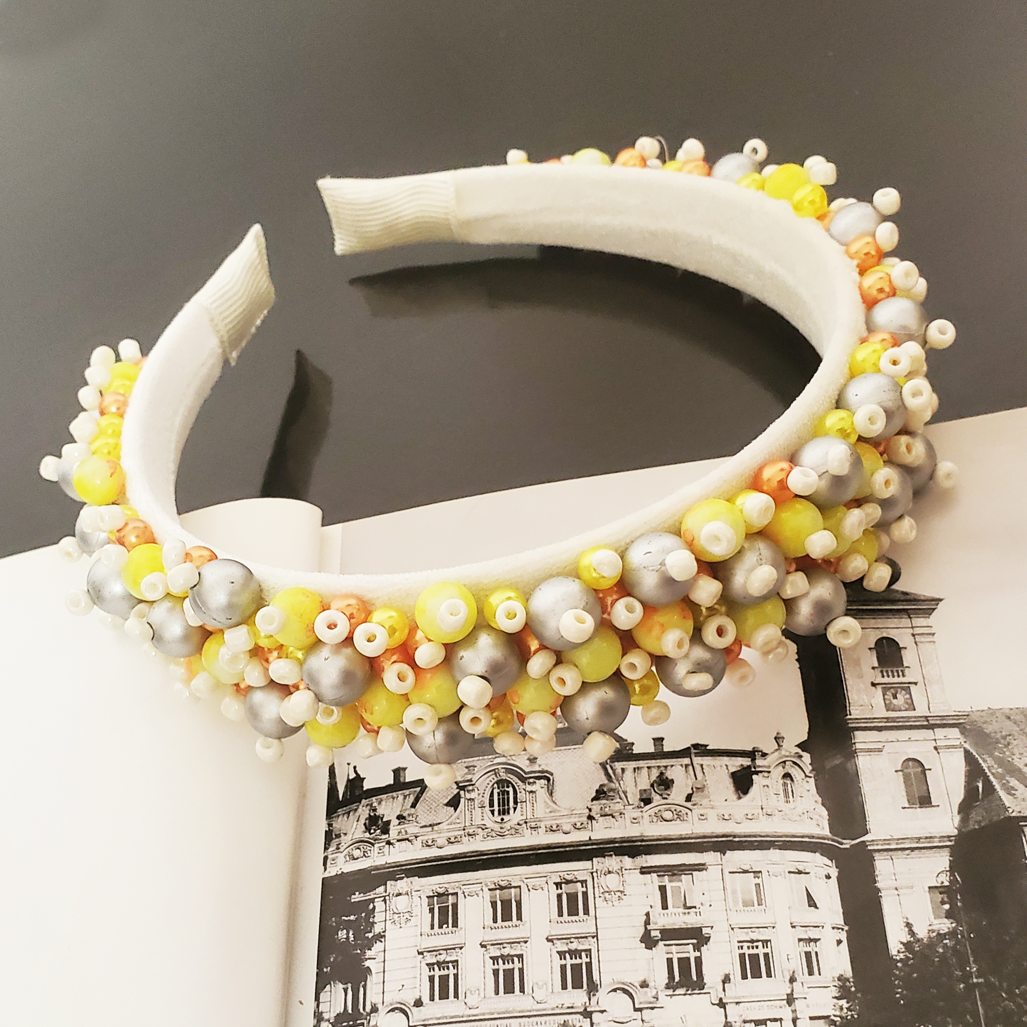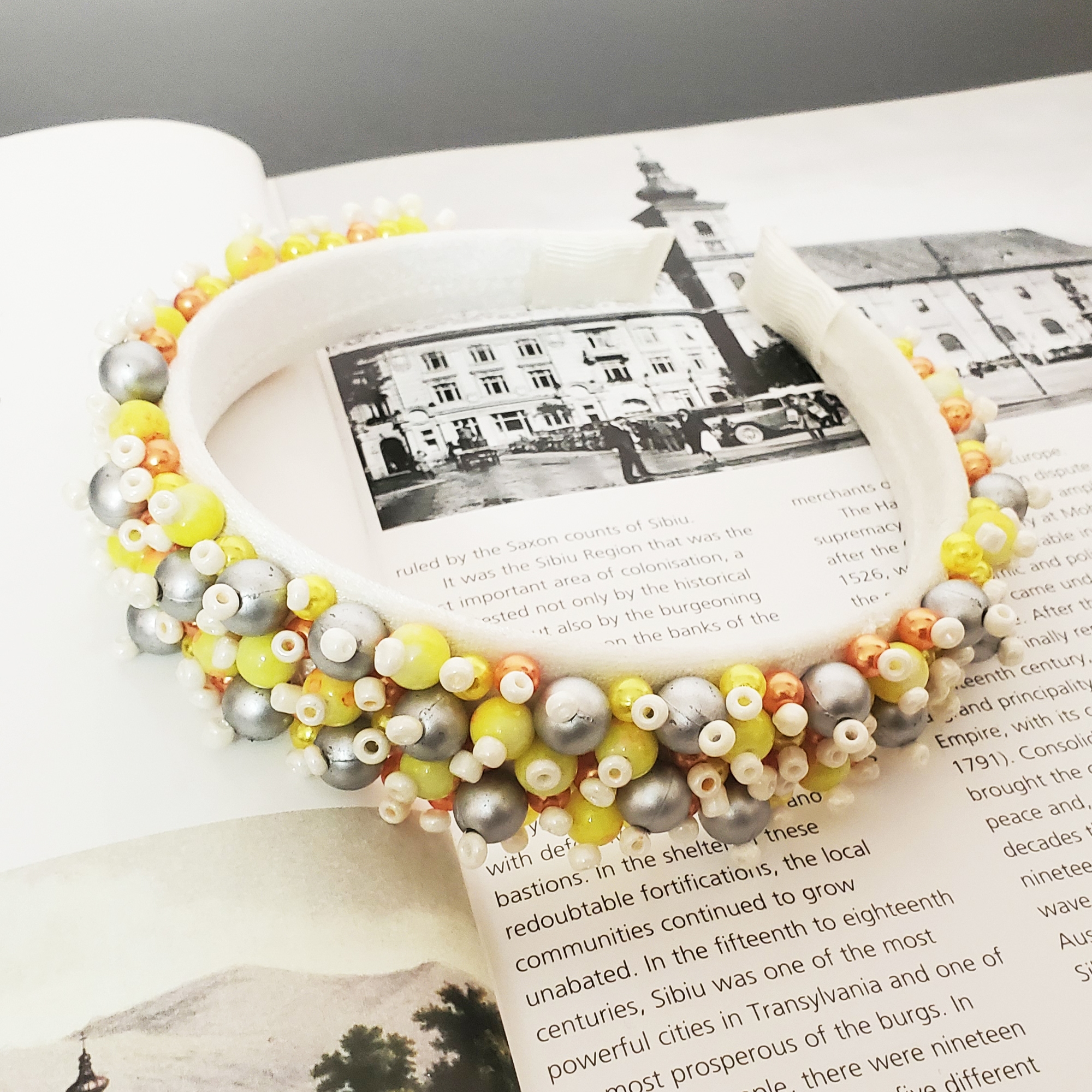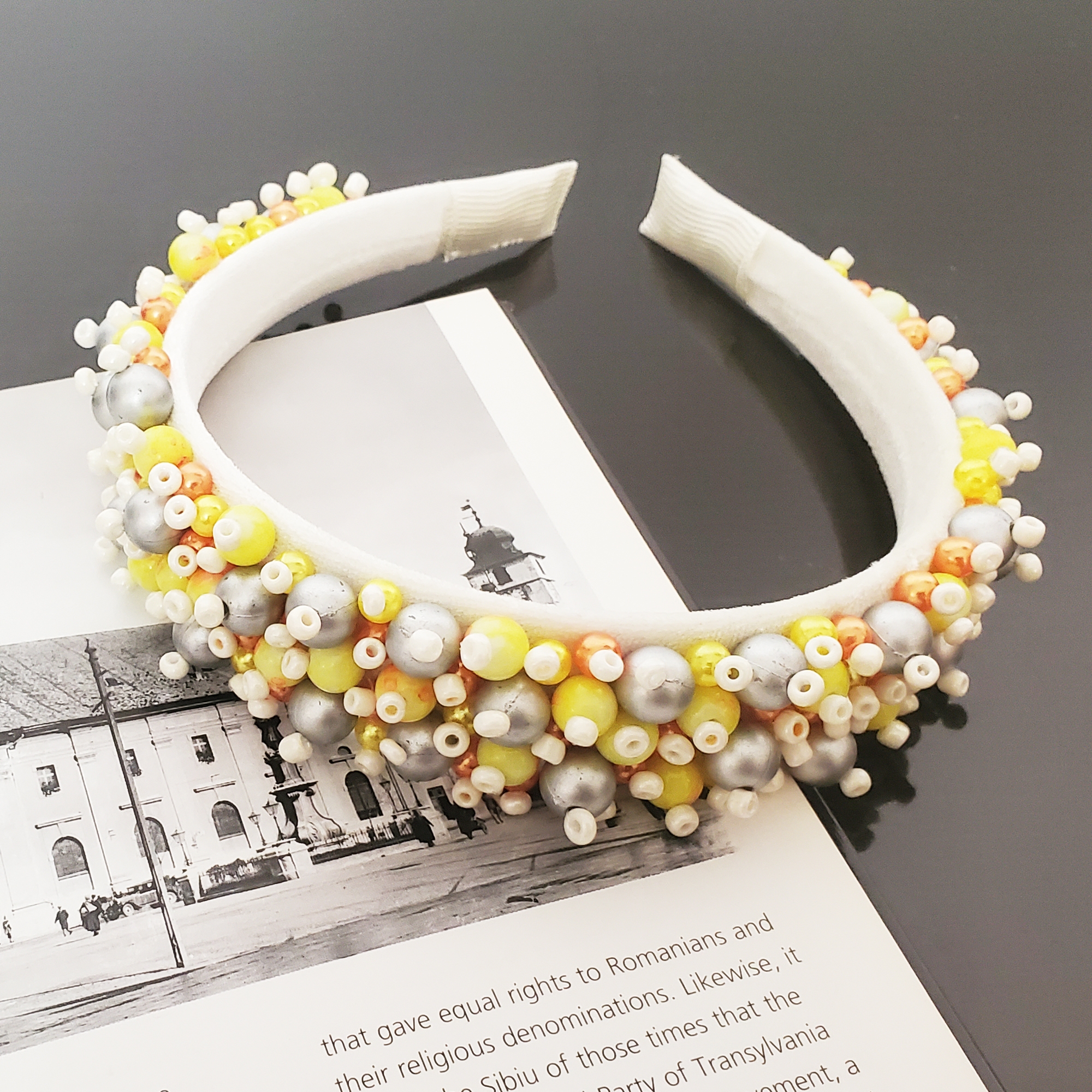 Descoperă eleganța rafinată cu Bentita Serenity, lucrată manual pe catifea albă și împodobită cu perle de sticlă și acrilice în nuanțe vibrante de galben, argintiu și alb. Un accesoriu clasic, care îți luminează ținuta și pune în valoare orice look. Masură universală.