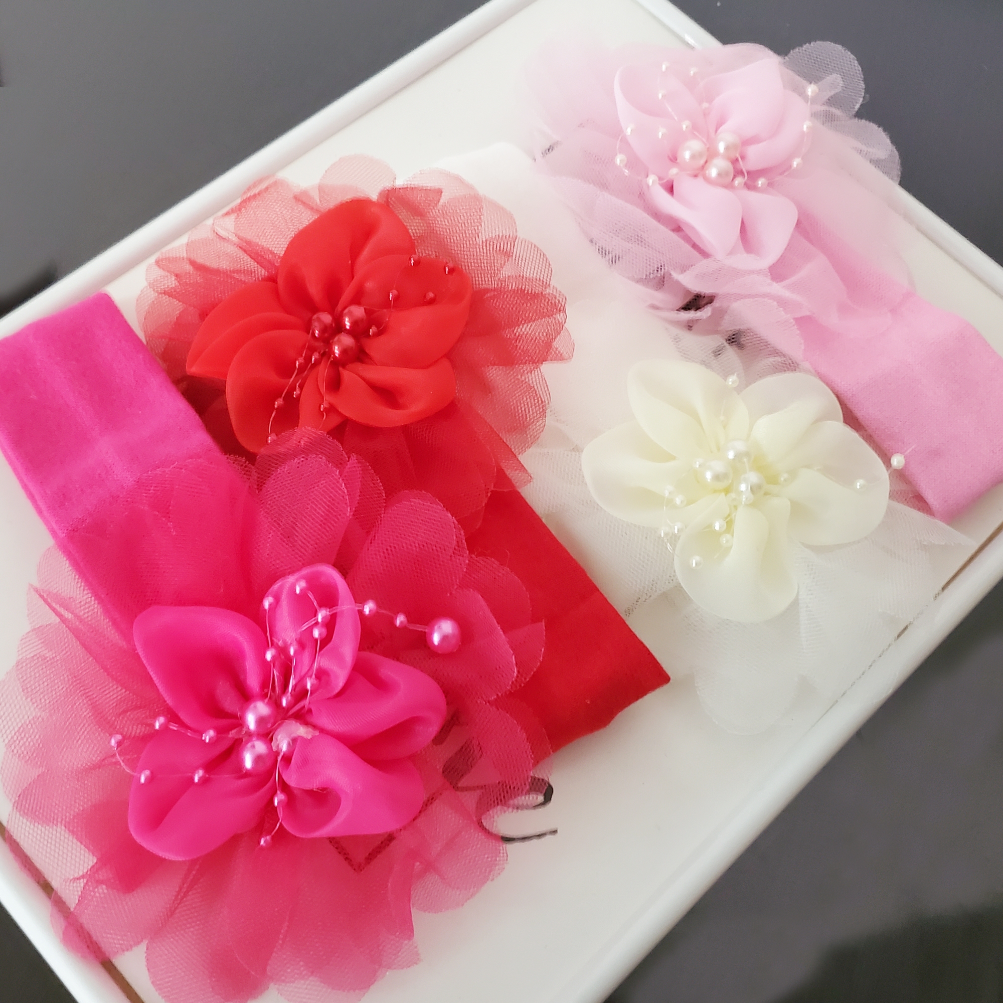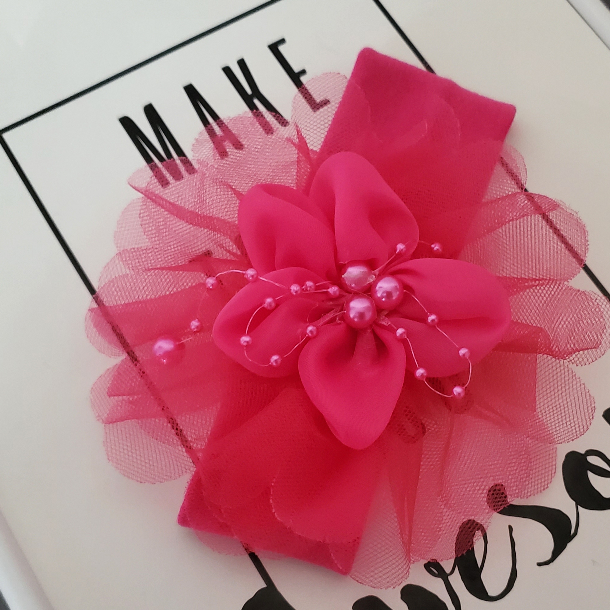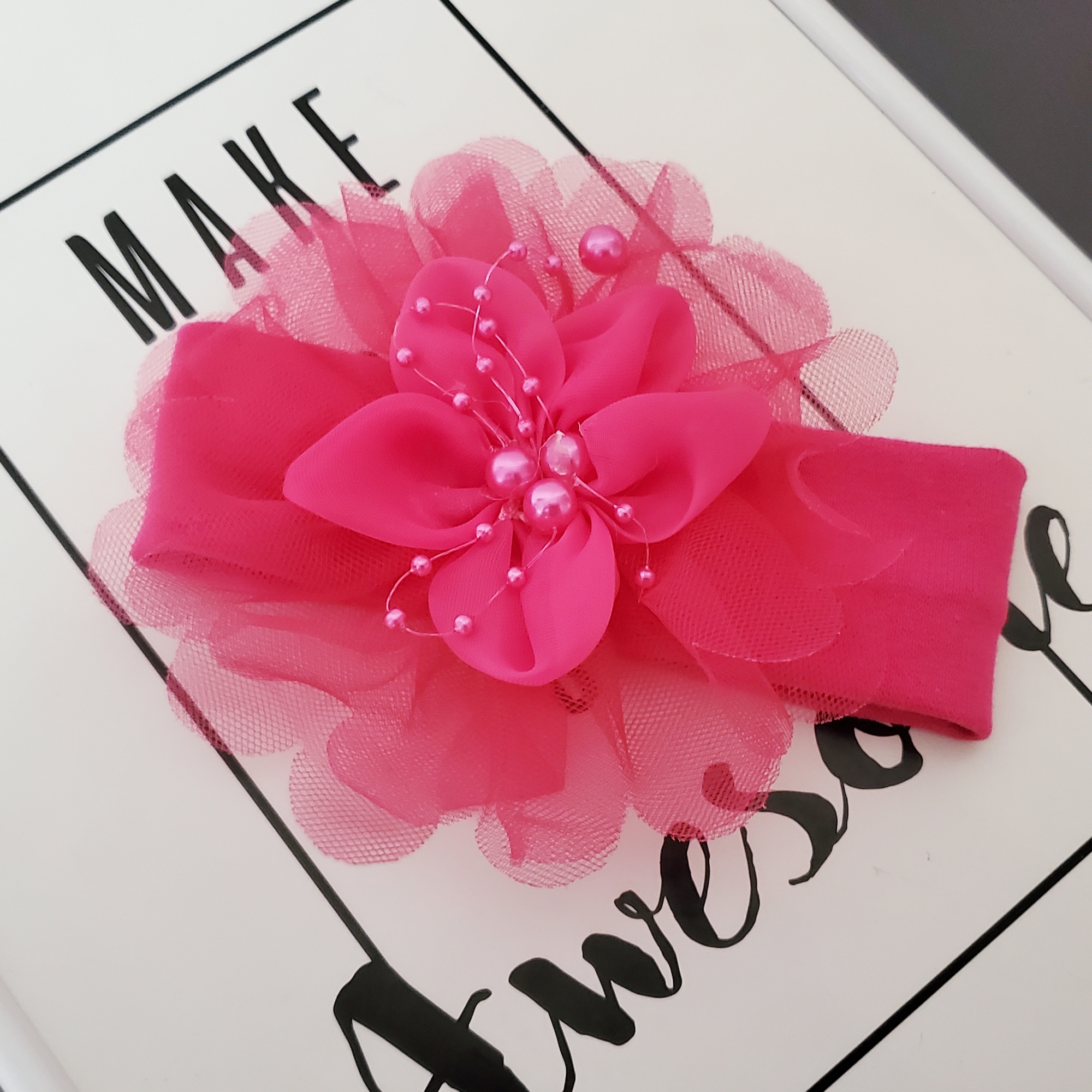 Bentita moale roz fuxia, cu floare in 3 straturi si perle roz. Stratul de sus este din satin, iar celelalte doua din tule.