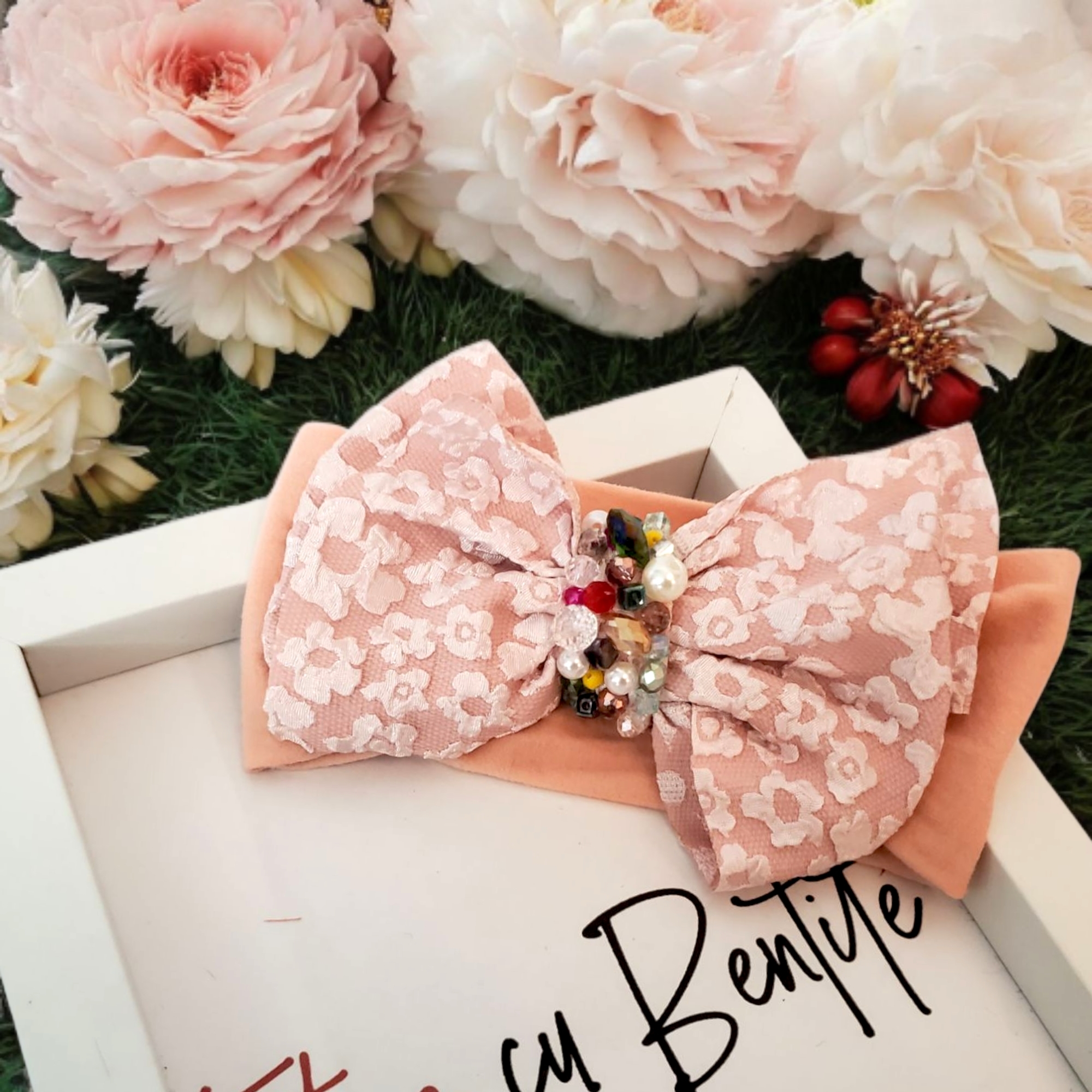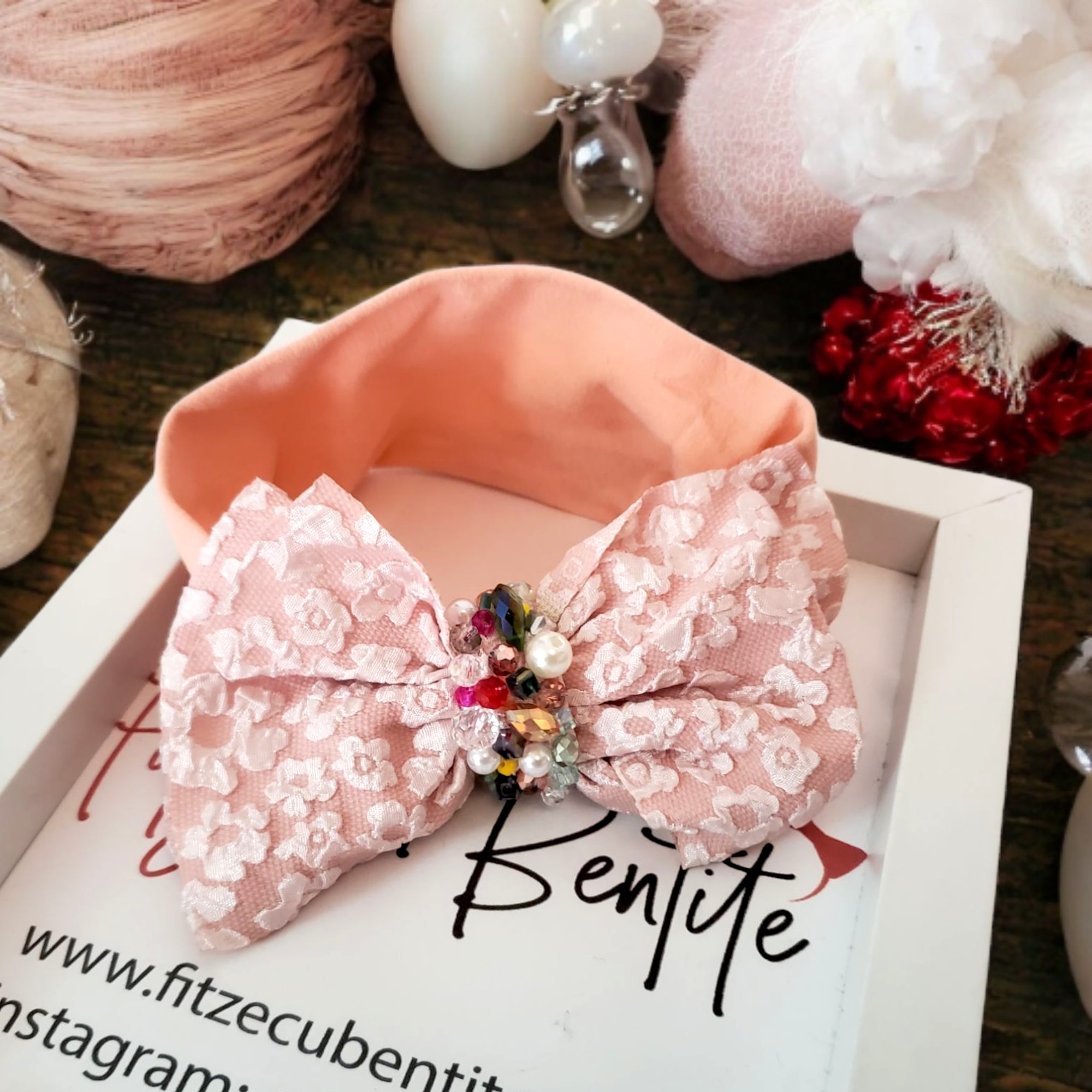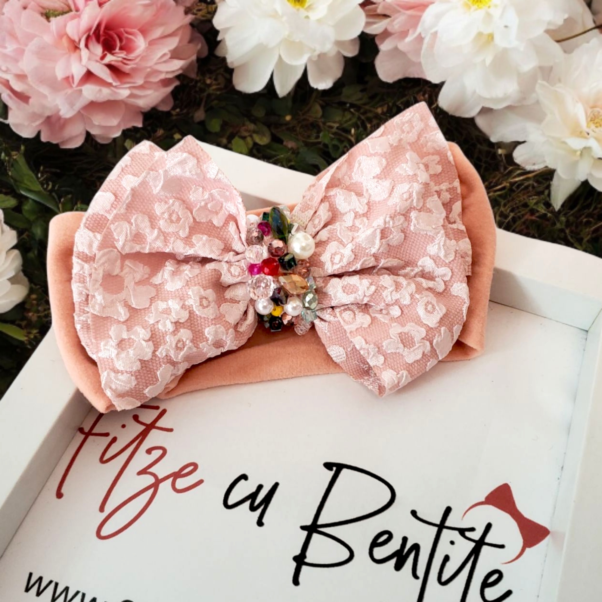 Bandana moale de culoarea piersicii cu o funda mare roz cu broderie alba. Pe funda sunt cusute cristale de sticla si perle de diferite forme si marimi. Nu contine elemente din plastic. Bandana este foarte elastica, astfel se poate purta pana la 4 ani. Se poate spala usor intrucat toate elementele sunt cusute.