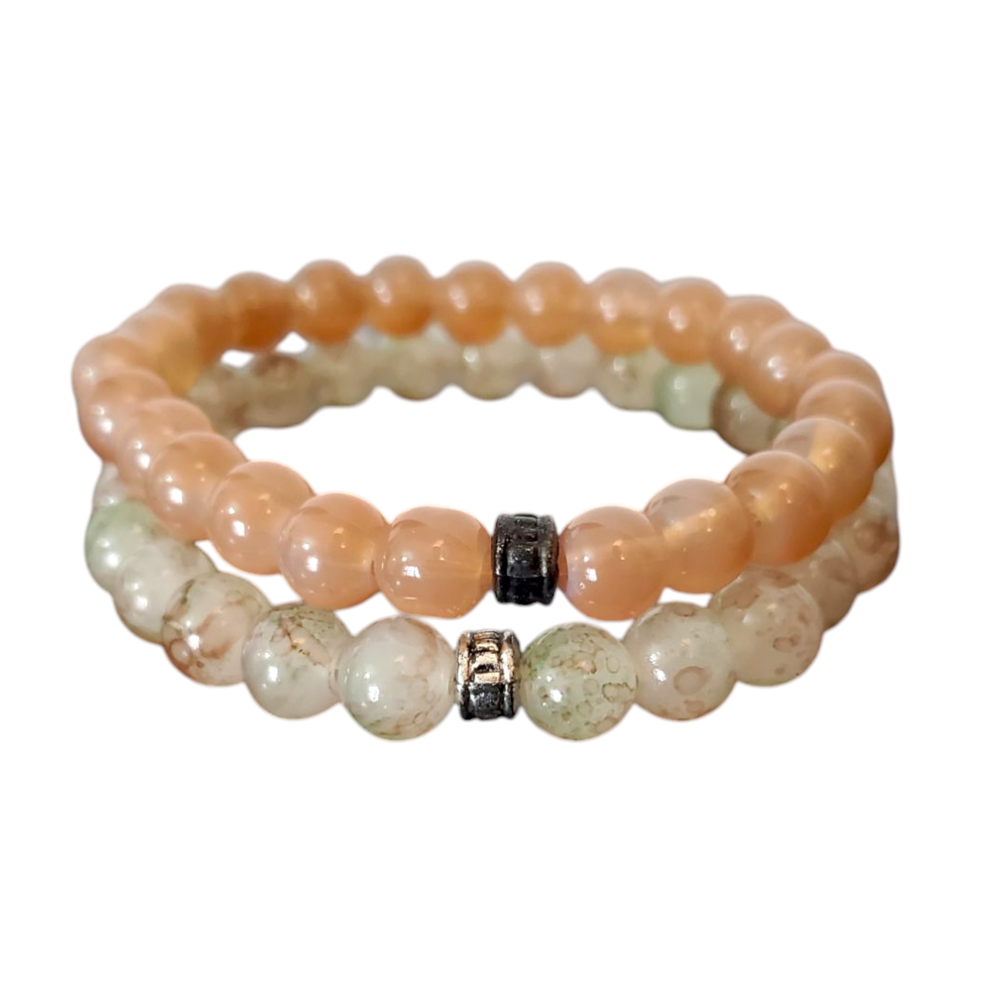 Setul contine doua bratari, una roz pal si una culoarea piersicii. Se pot purta impreuna sau separat. Bratarile sunt confectionate din perle de sticla slefuita, opace, cu distantiere metalice argintii.