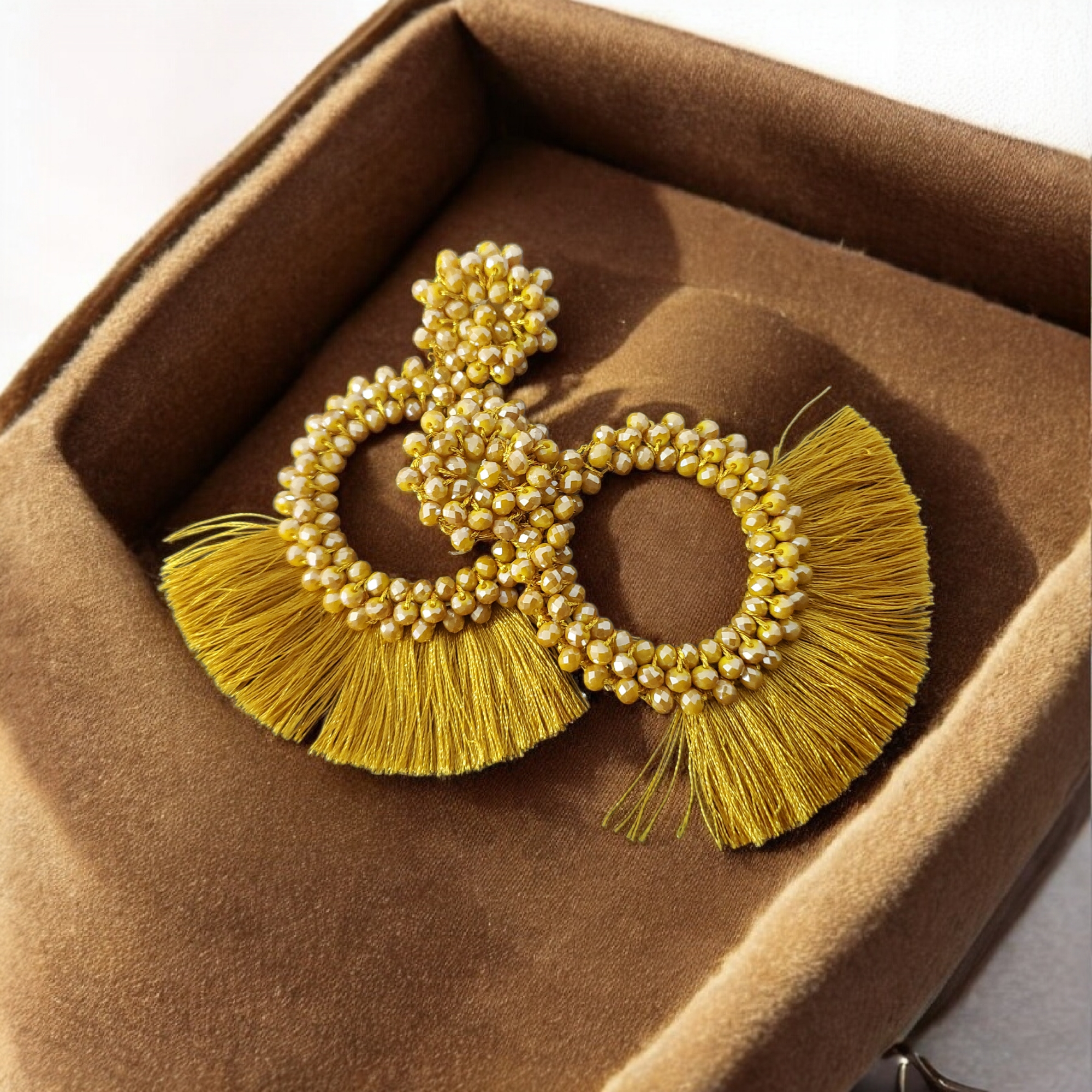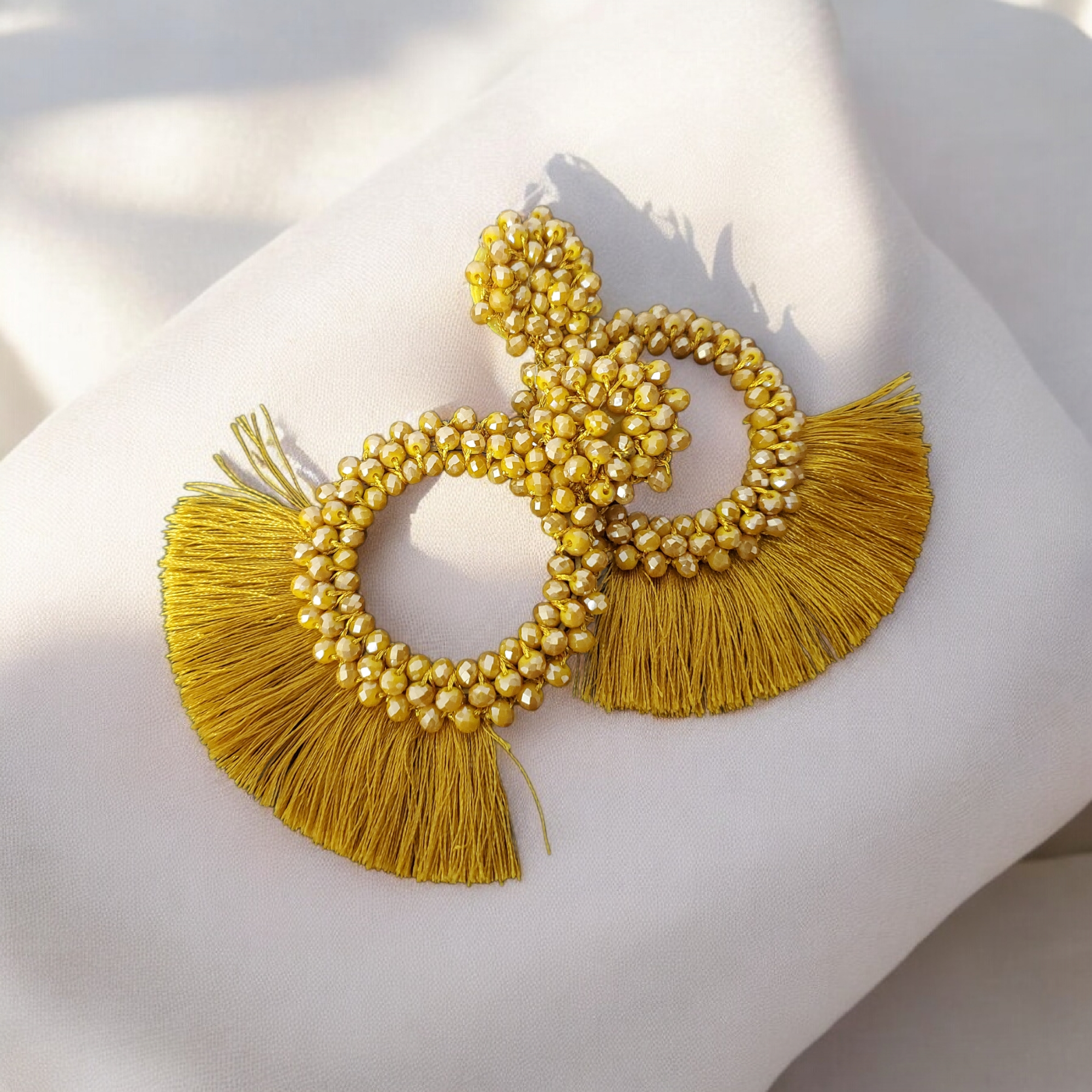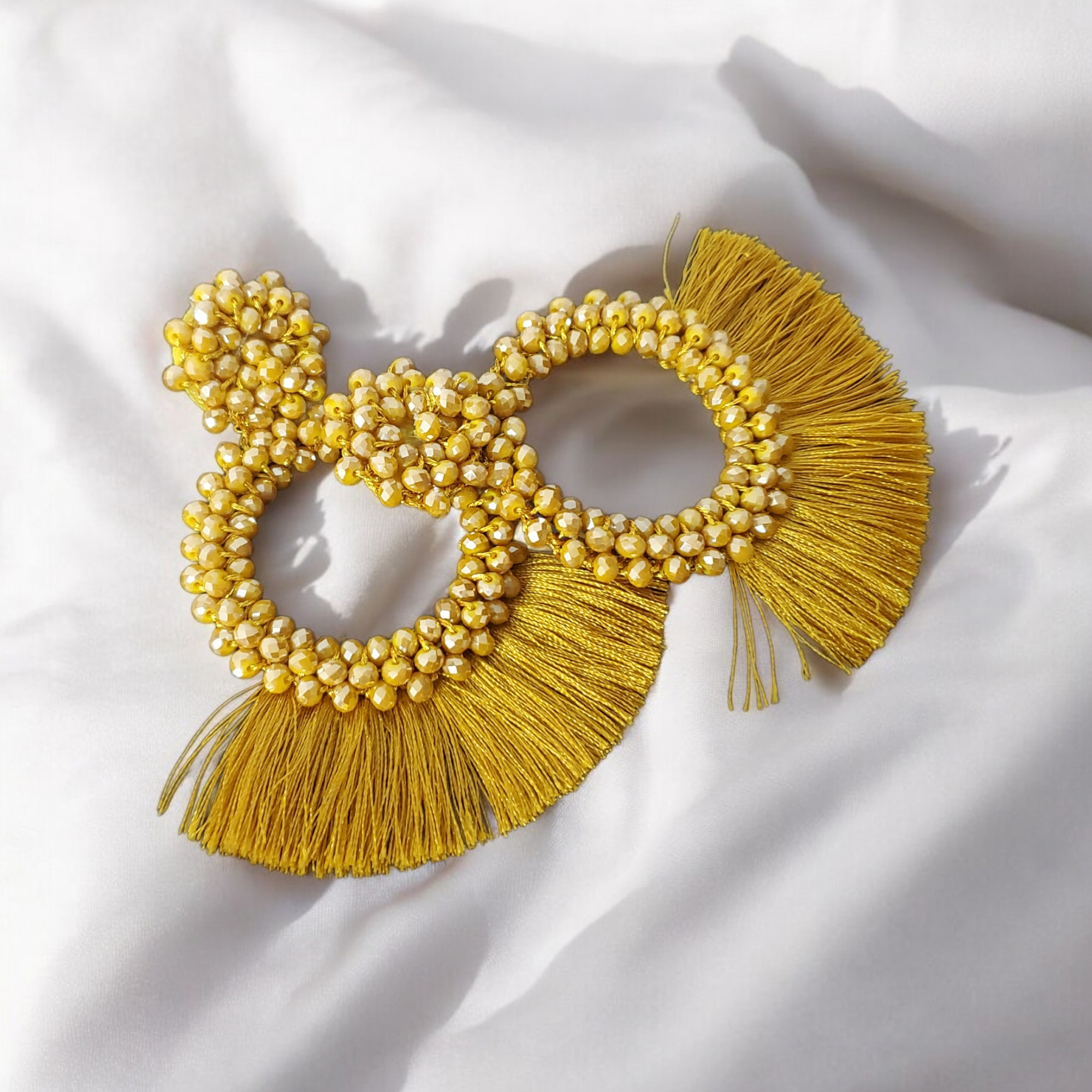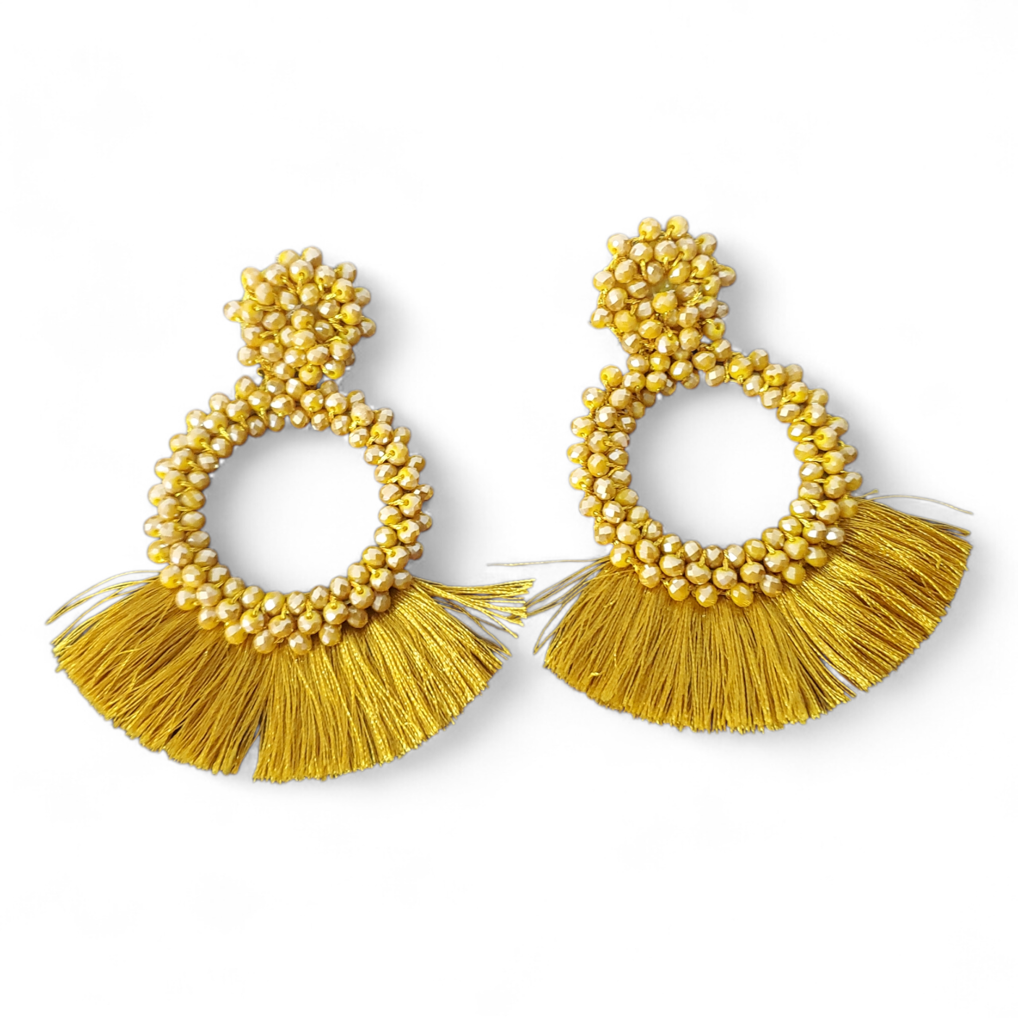 Cercei din cristale de sticla crem/auriu si ciucuri din matase ce se inchid cu surub metalic.