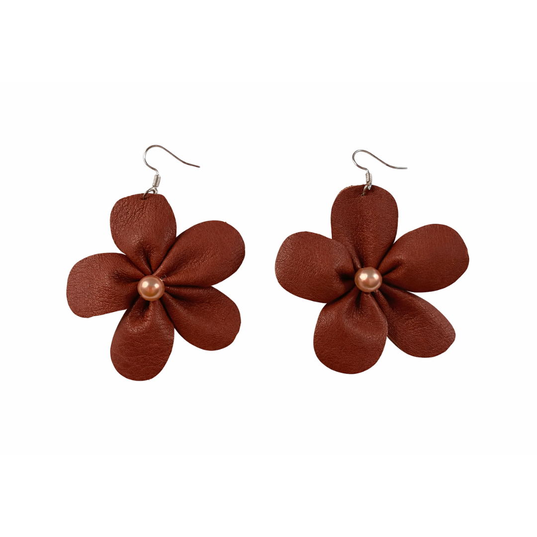 Cercei statement în formă de floare, realizați din piele naturală, într-o nuanță caldă de maro cognac. Designul cu cinci petale rotunjite este pus în valoare de pliurile discrete din centru, care creează volum și un efect delicat, tridimensional.