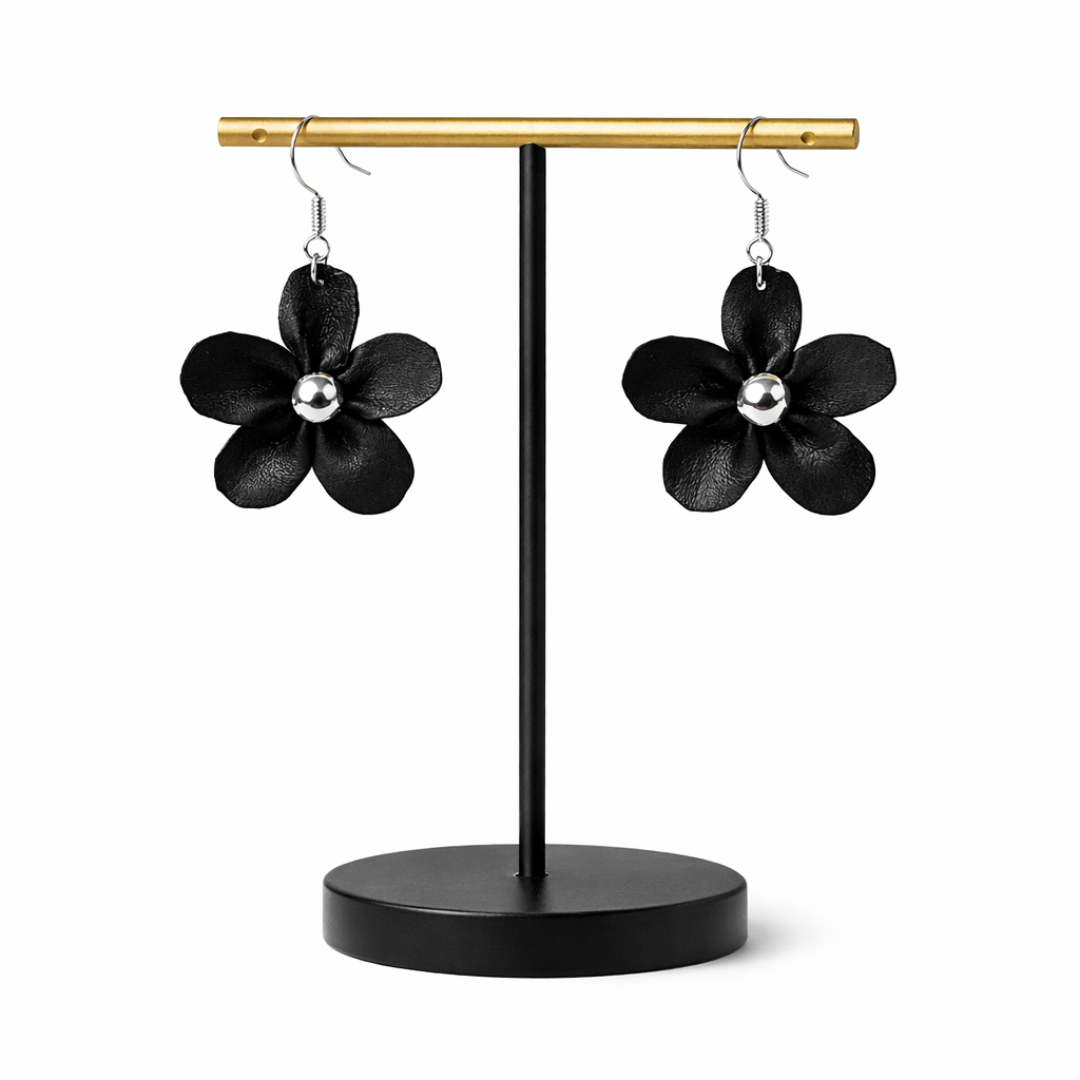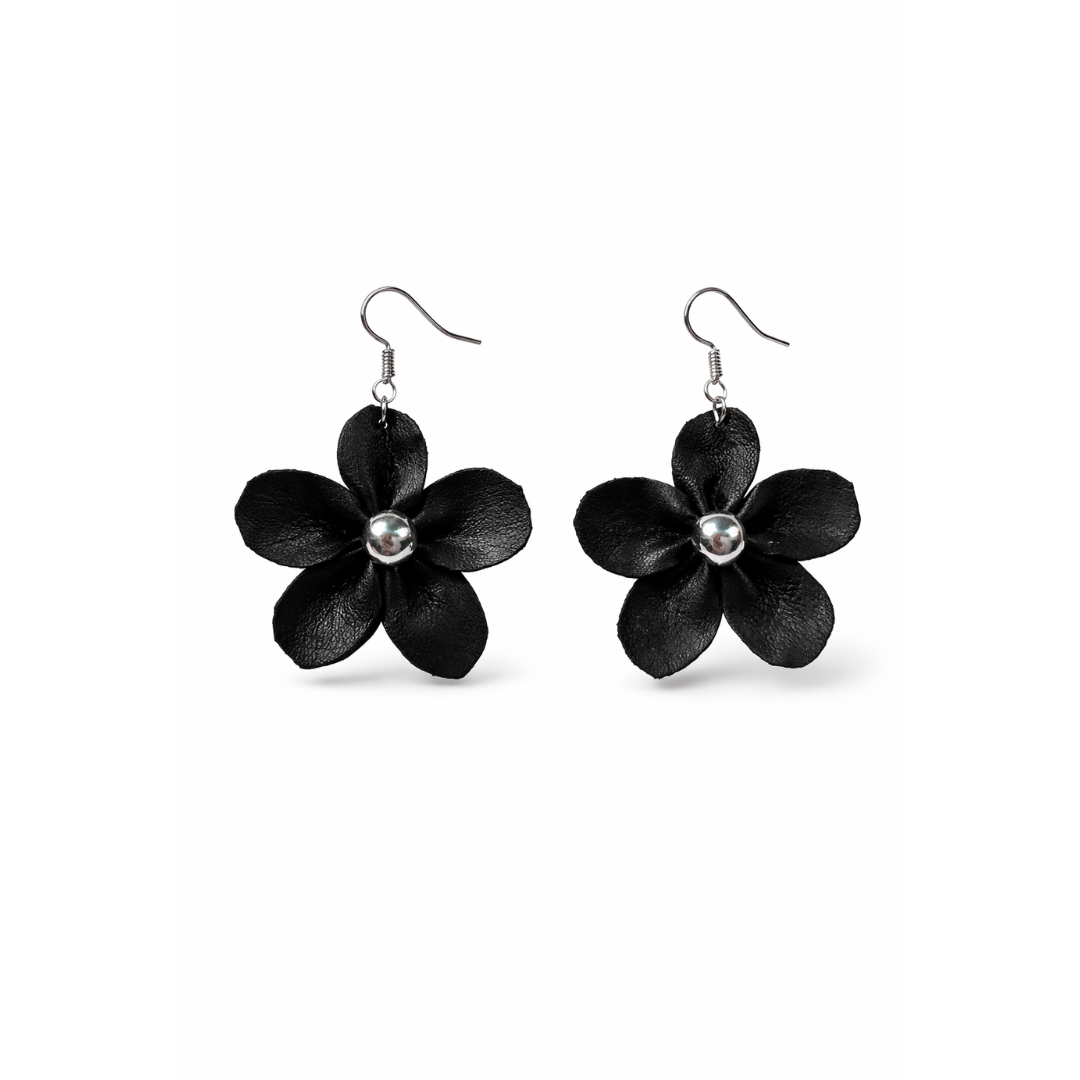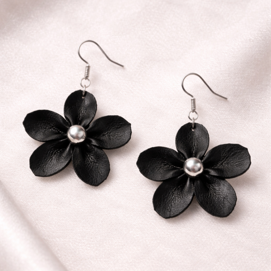 Cercei eleganți în formă de floare, realizați din piele naturală, într-o nuanță intensă de negru profund. Fiecare floare are cinci petale atent modelate, cu pliuri discrete în centru, care oferă volum și un efect sofisticat, tridimensional.