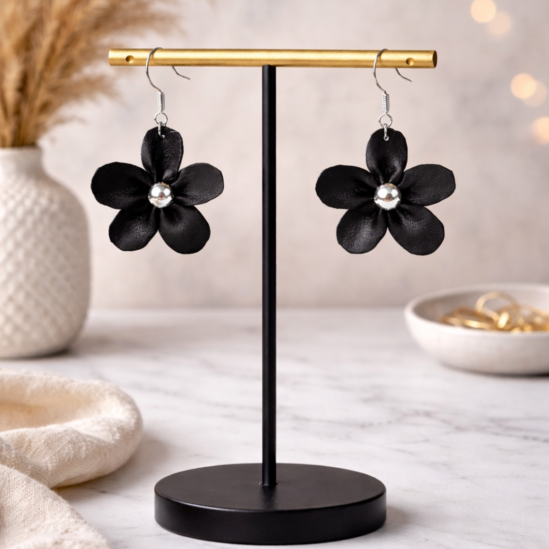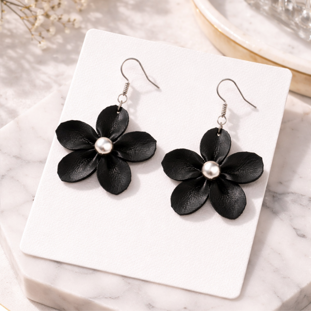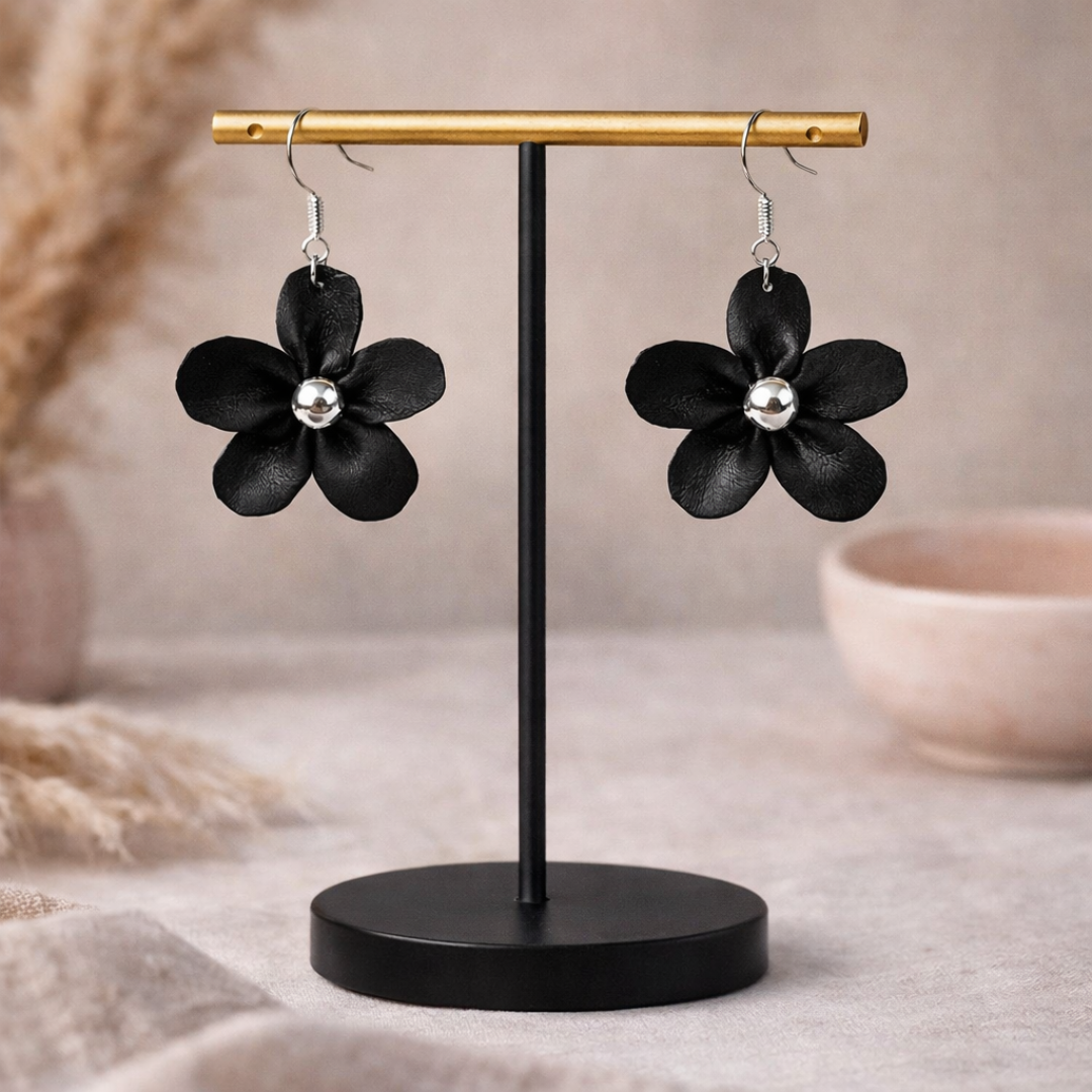 Cercei eleganți în formă de floare, realizați din piele naturală, într-o nuanță intensă de negru profund. Fiecare floare are cinci petale atent modelate, cu pliuri discrete în centru, care oferă volum și un efect sofisticat, tridimensional.