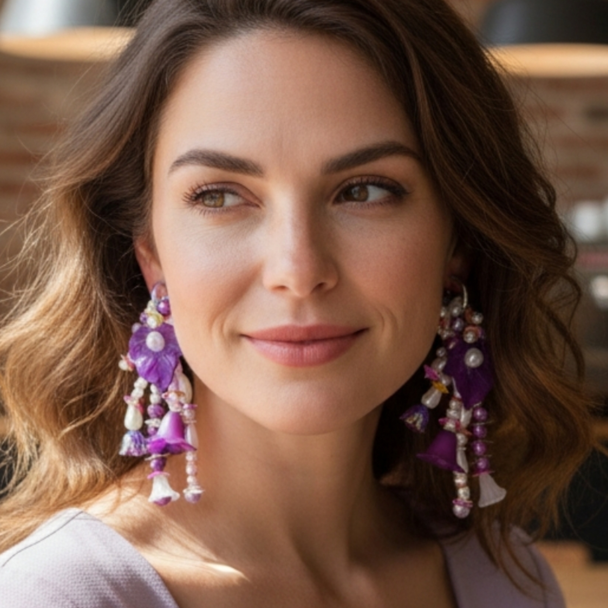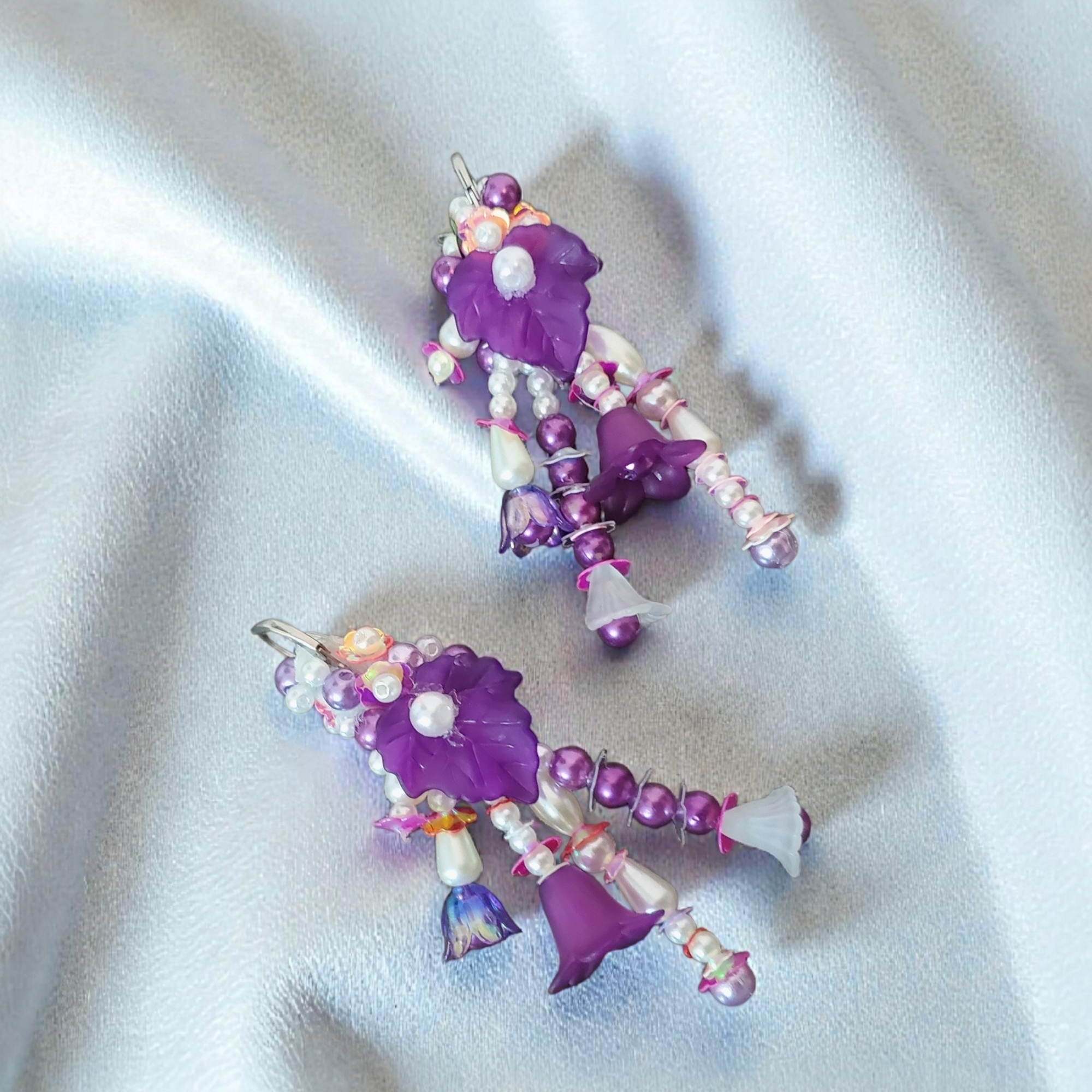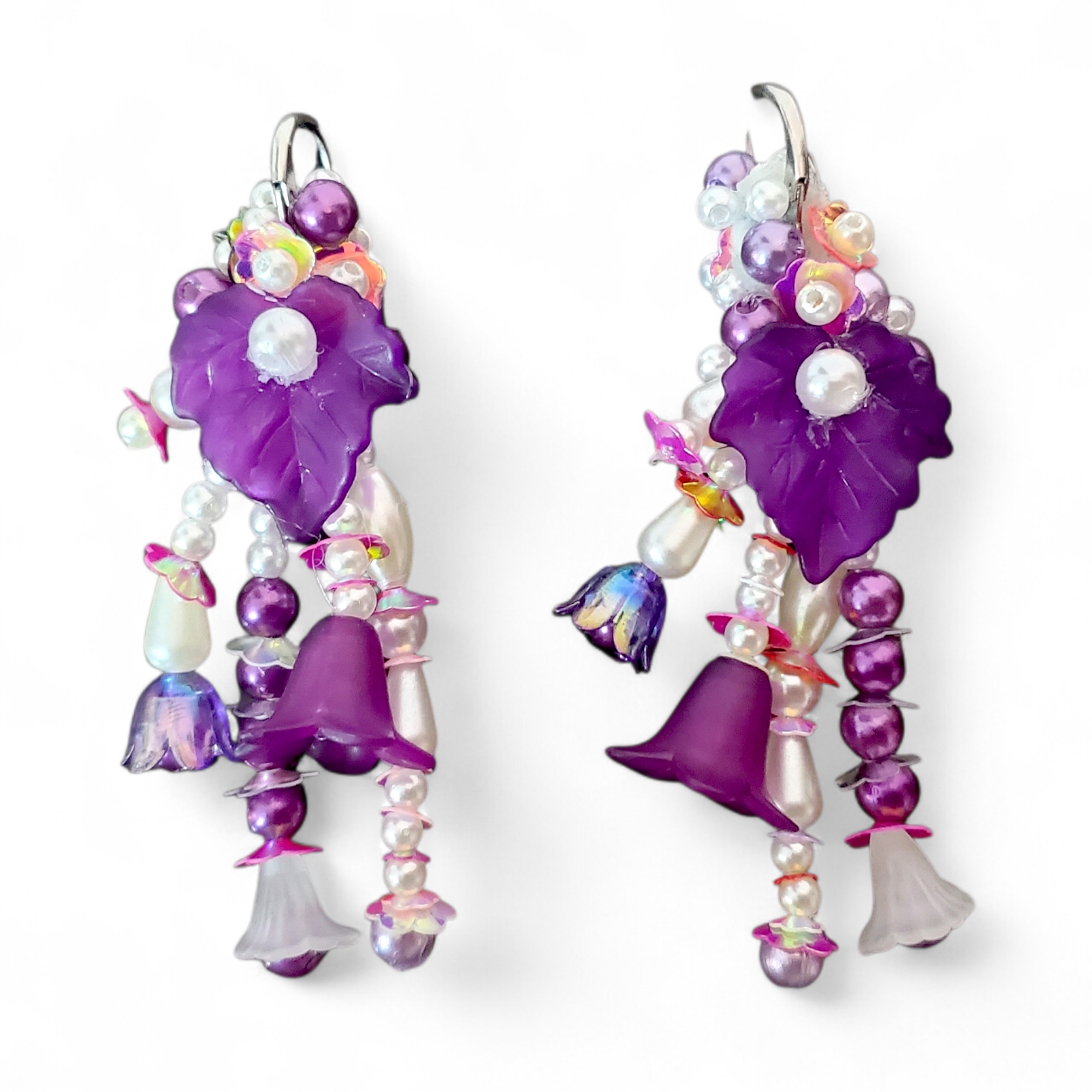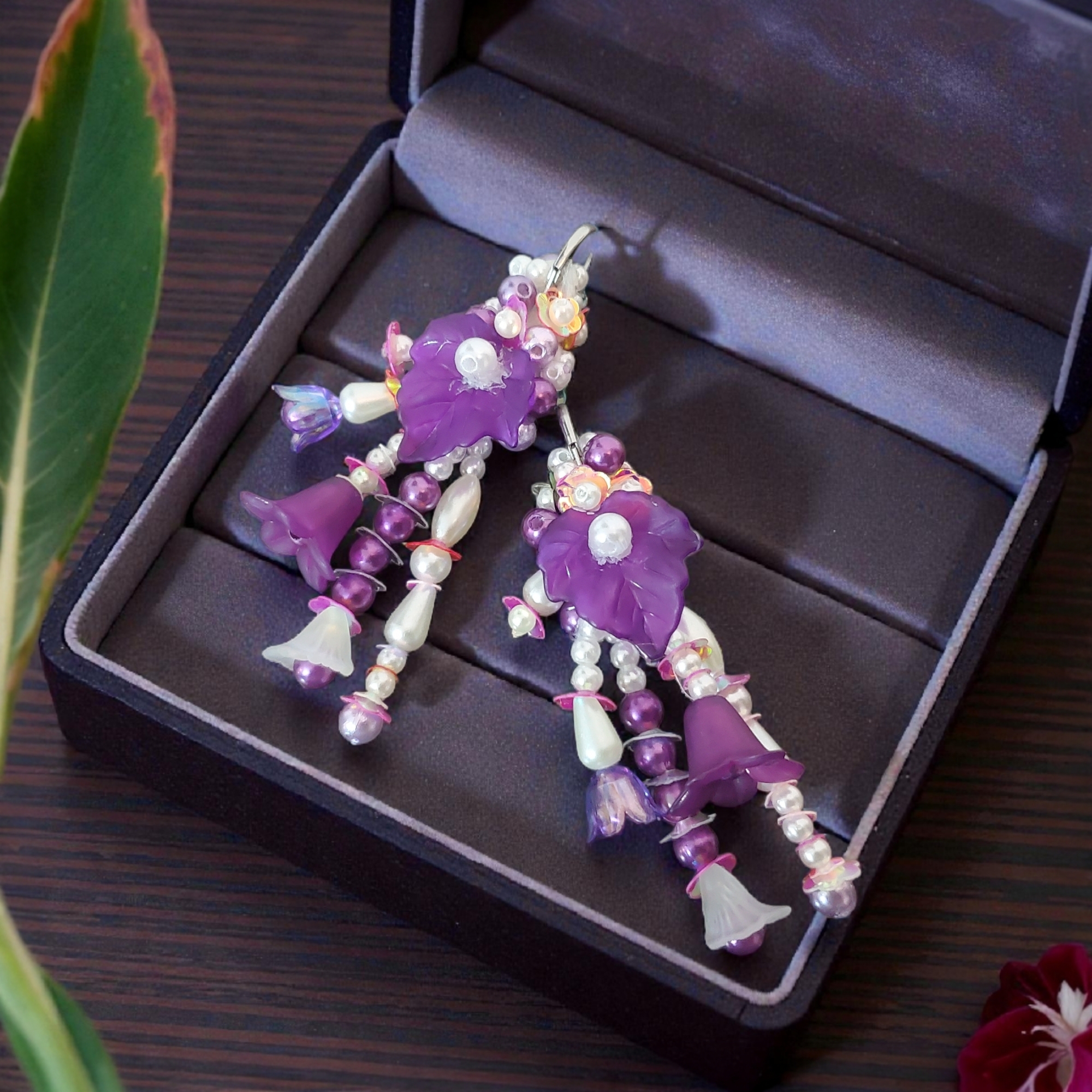 Cercei realizati manual dintr-o combinatie unica de materiale, in nuante de lavanda si perle albe. Cerceii sunt pe stil lung, cu siraguri de perle in nuante de mov si paiete mici cu reflexii calde. La capete sunt flori de primavara. Elementul central este o frunza mov din sticla. Se inchid cu sistem tip cheita metalica argintie.