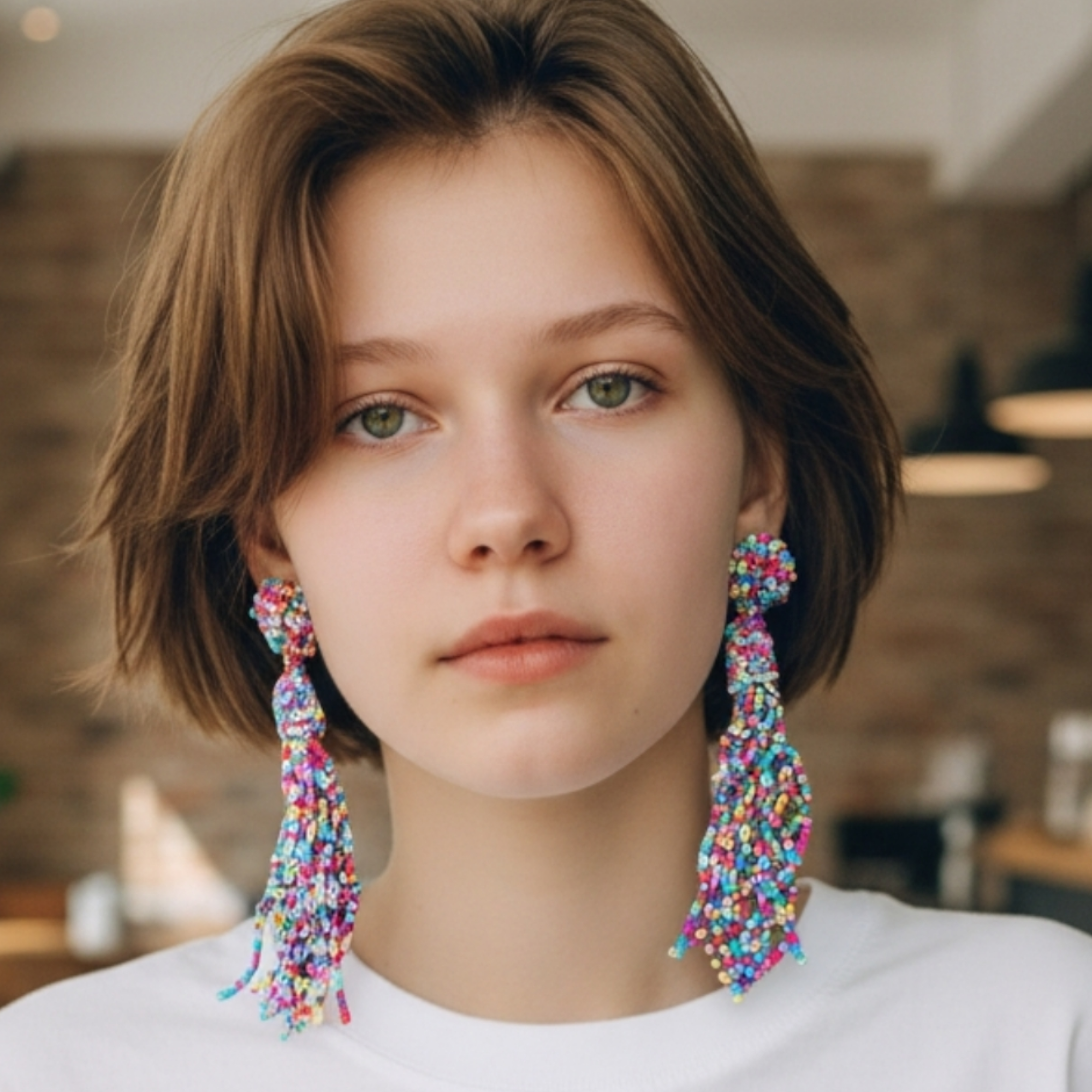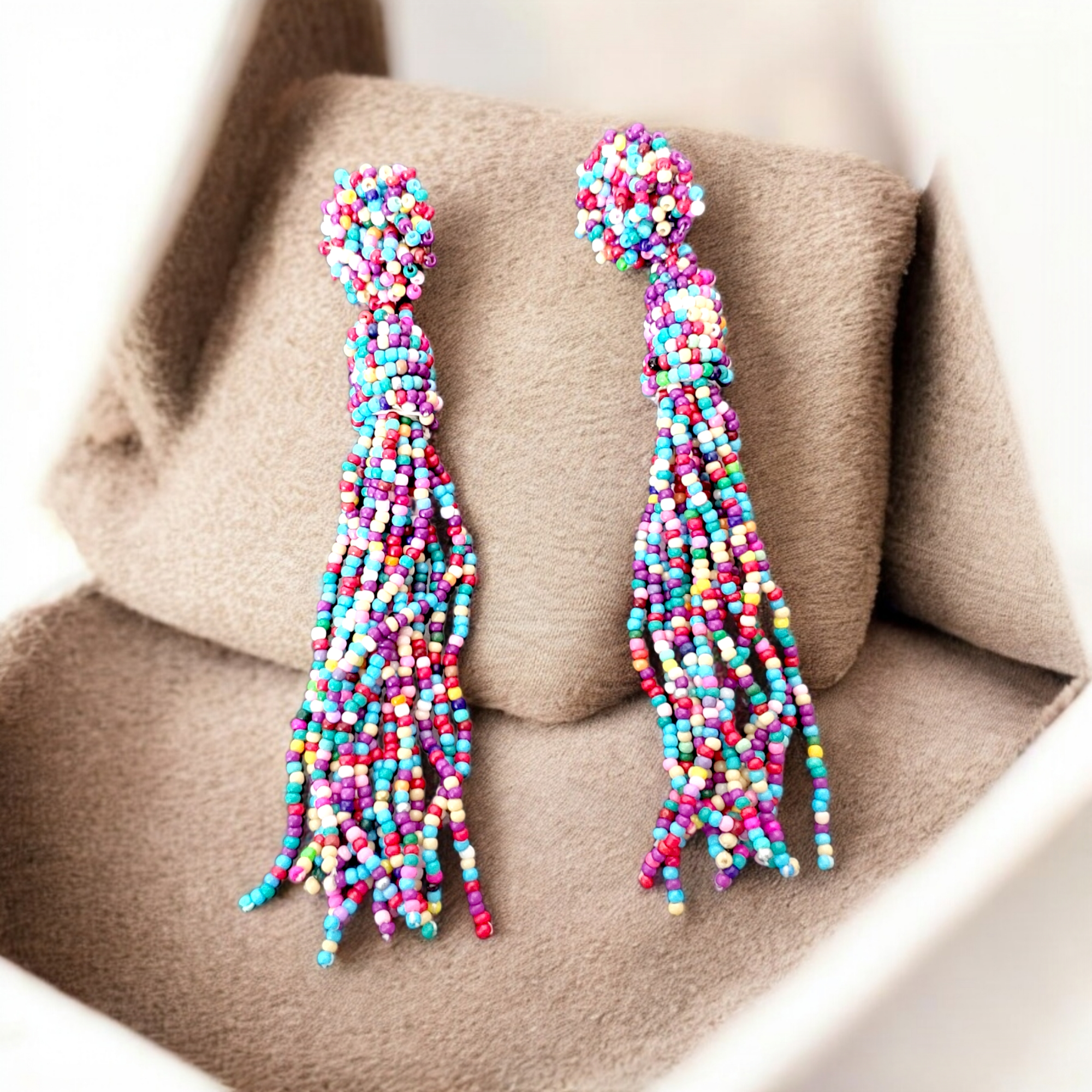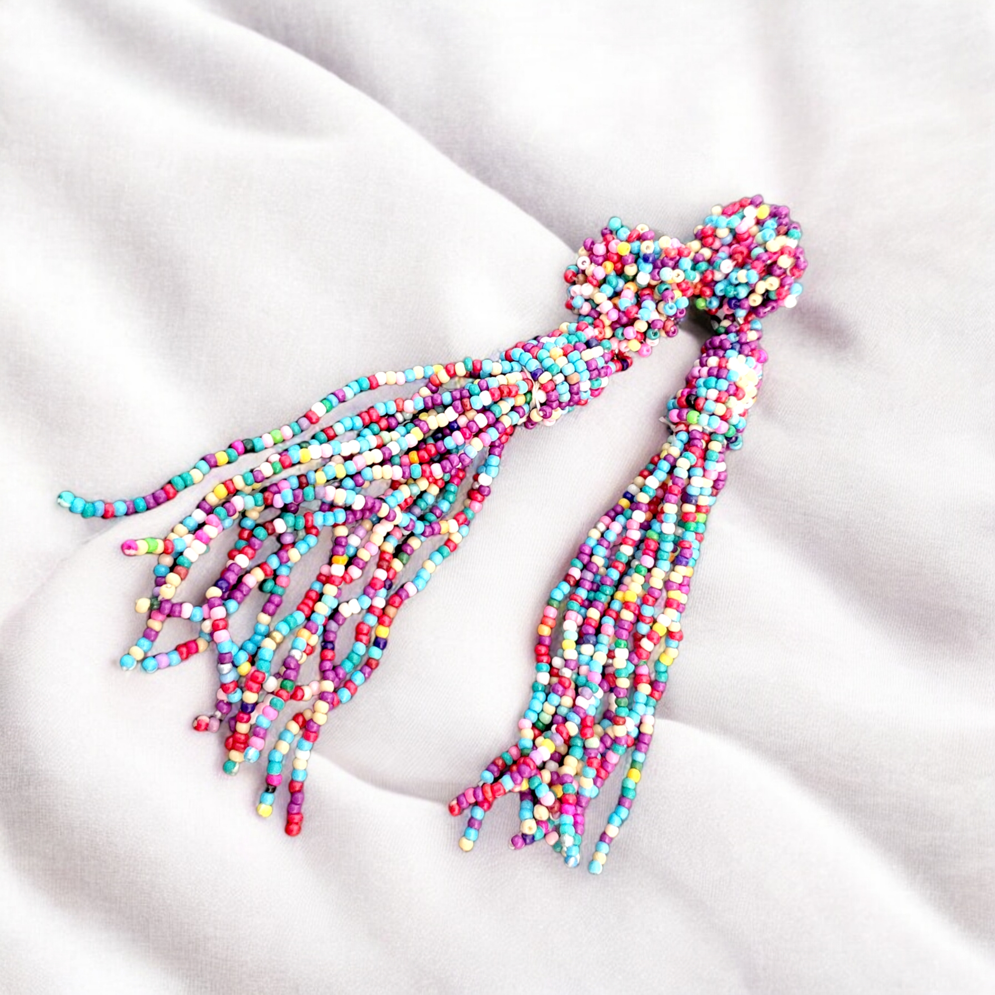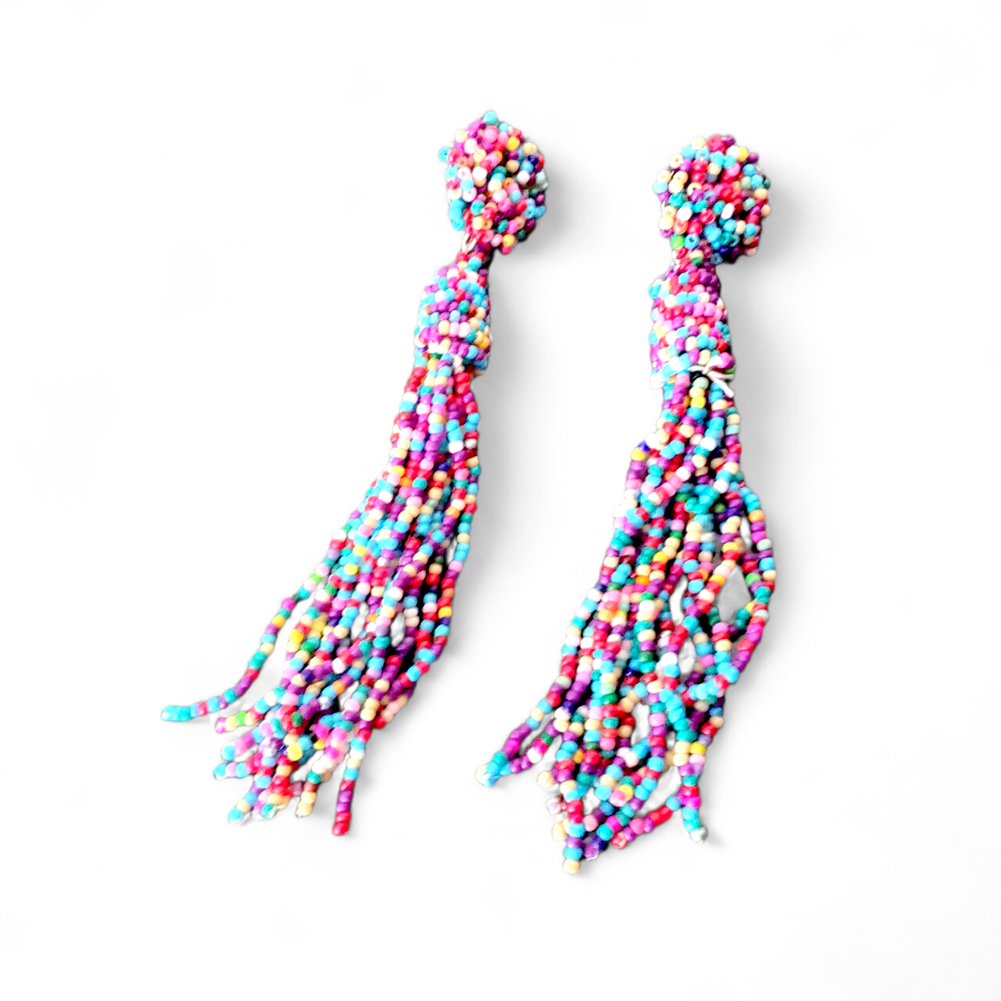 Cercei lungi cu inchidere pe surub, din margelute toho. Cerceii au franjuri dese din margelute in nuante calde de albastru, mov, rosu, alb, astfel fiind un accesoriu elegant si usor de asortat la tinute variate. Fiind fabricati din margelute toho, acestia sunt usor de purtat.
