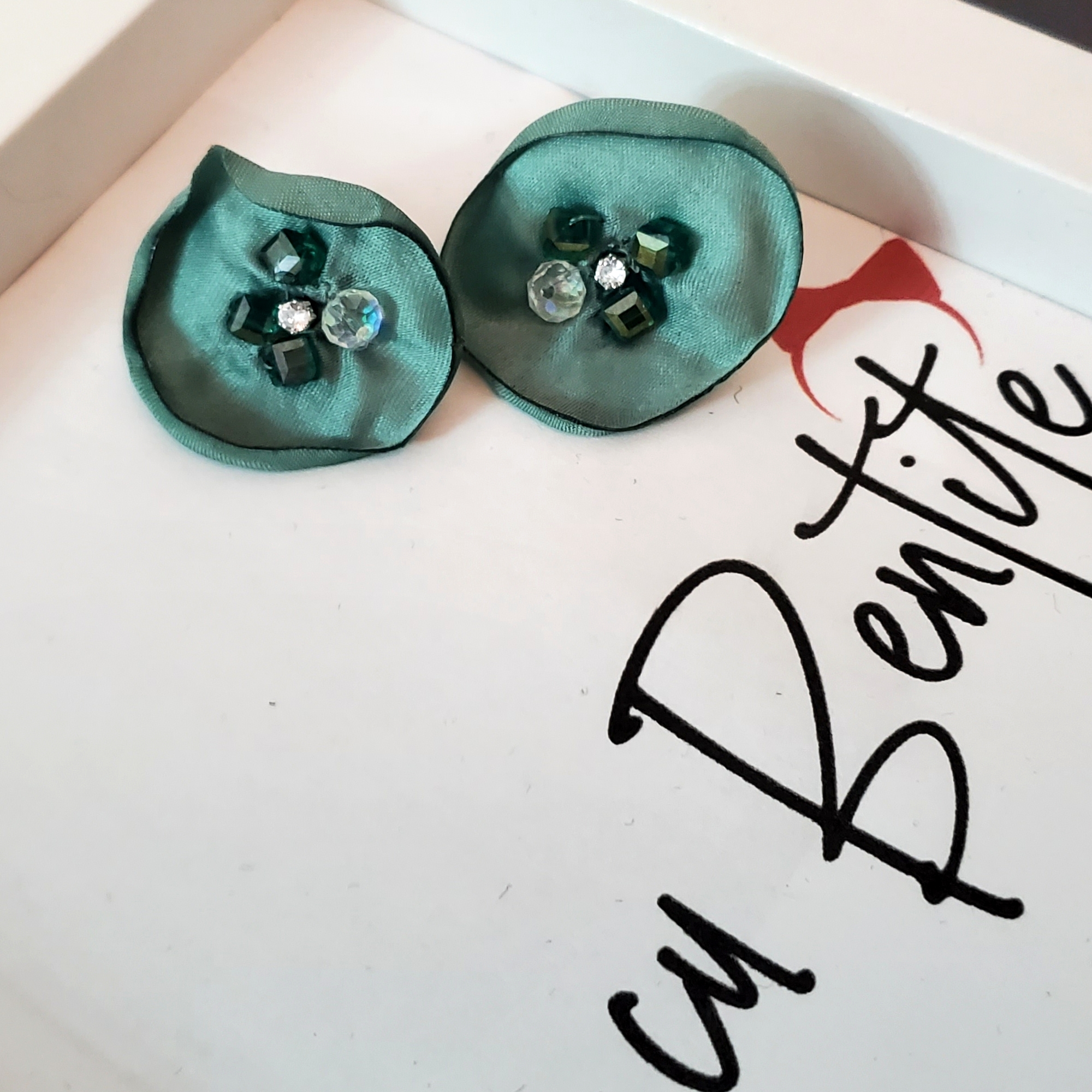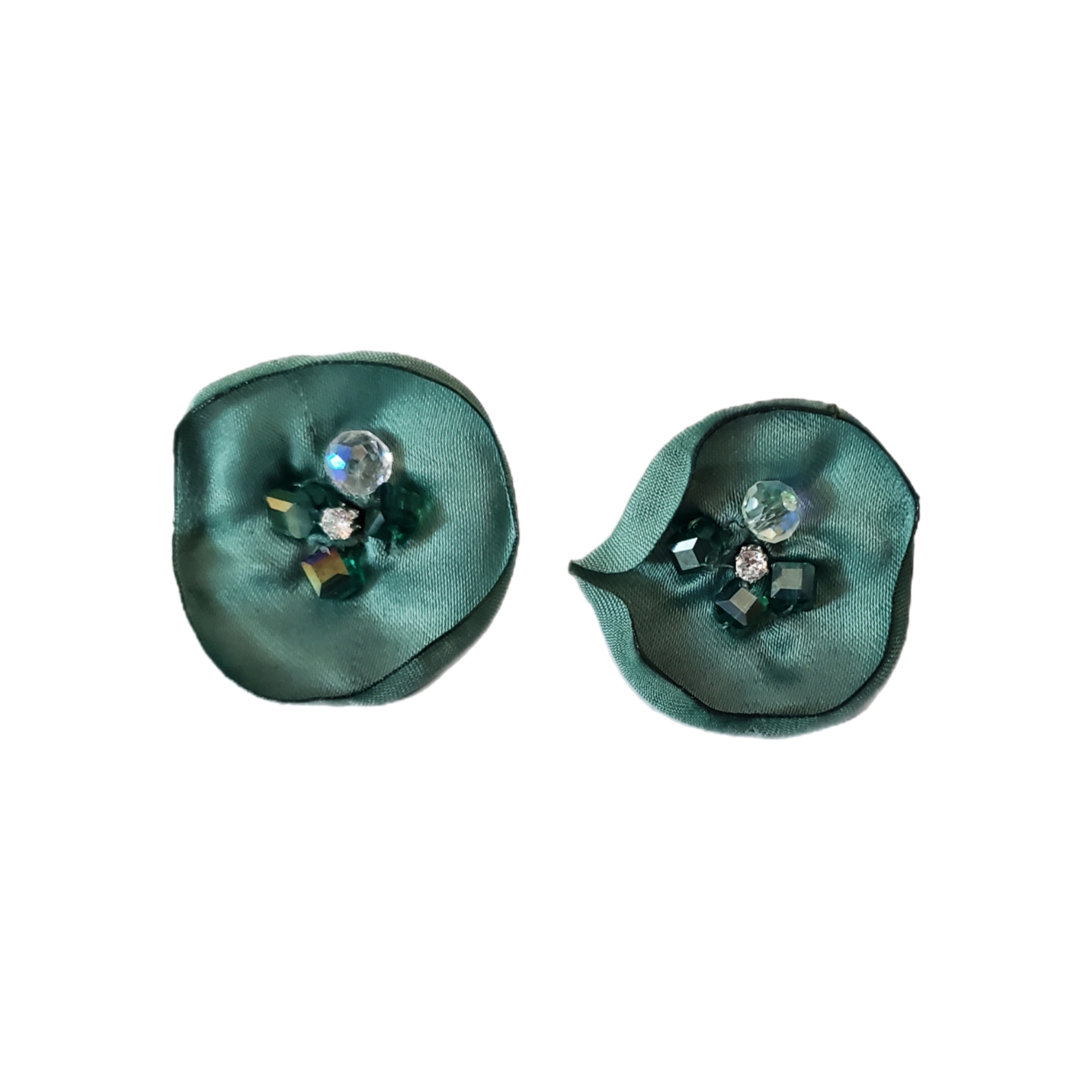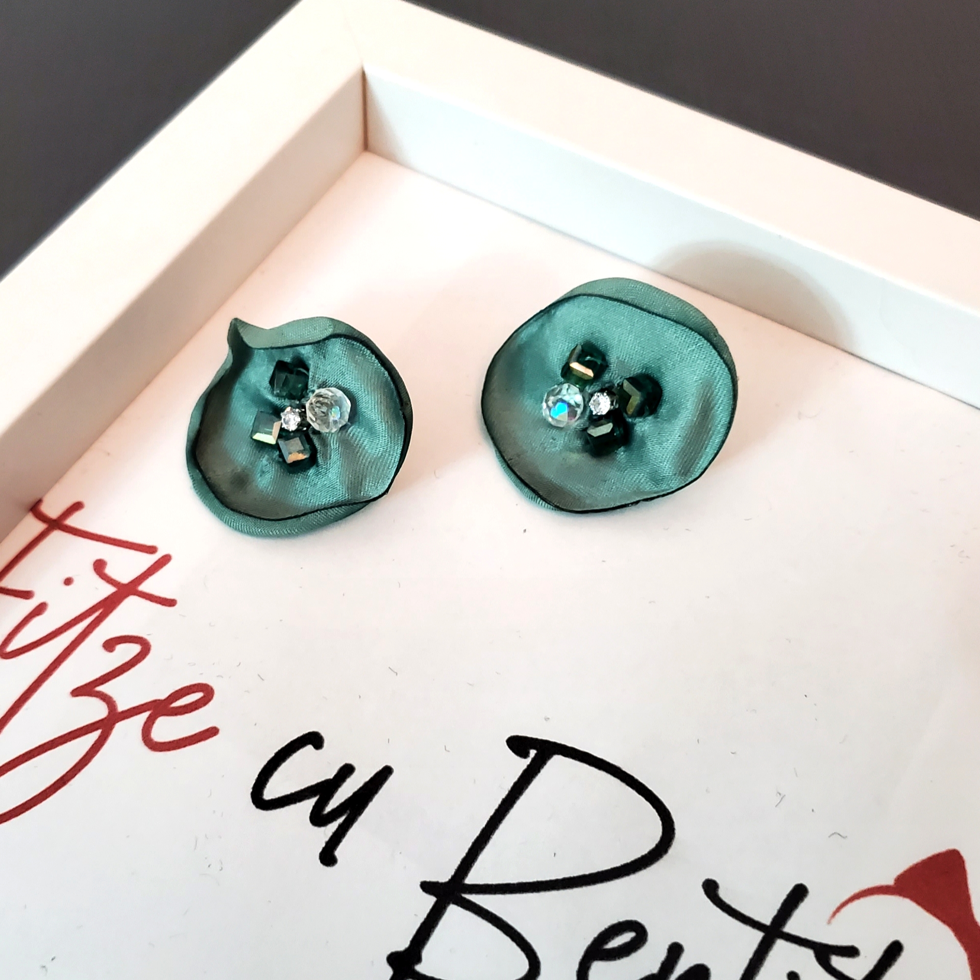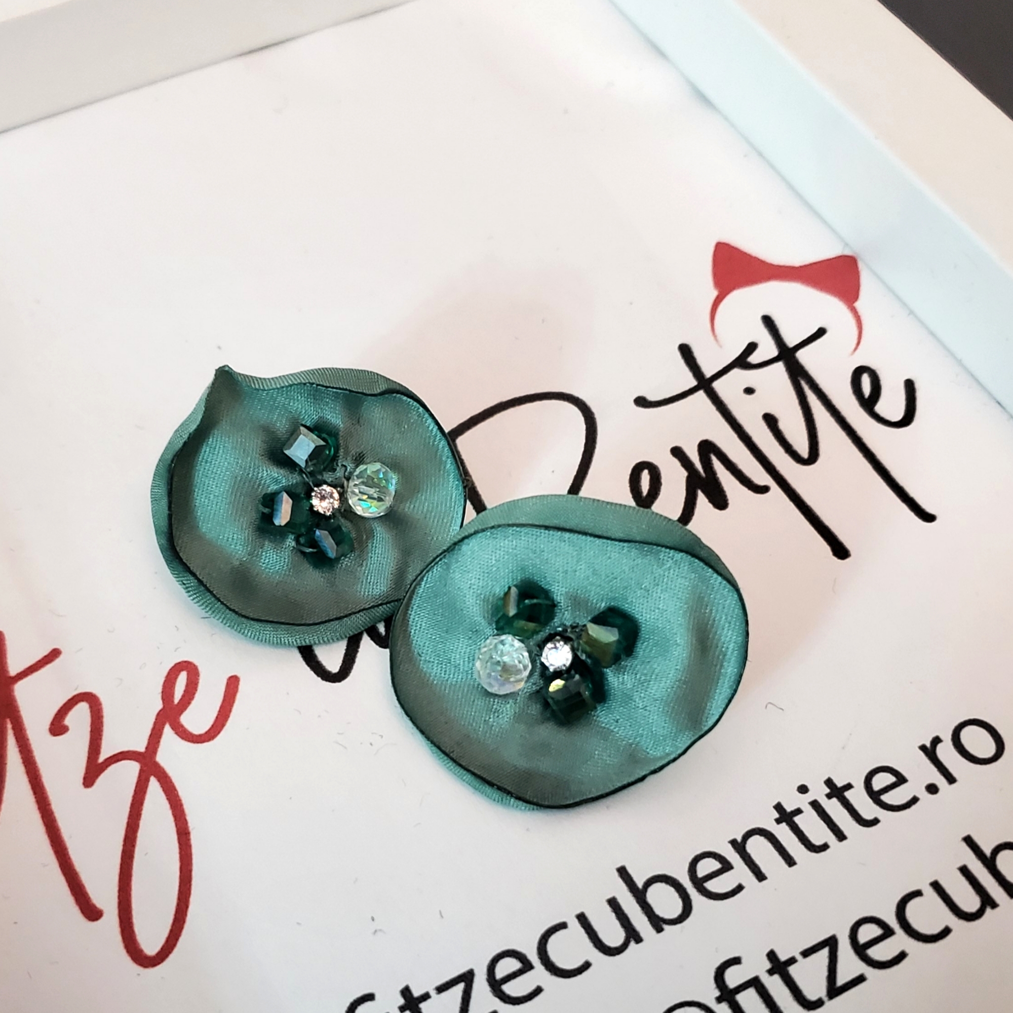 Cerceii sunt compusi din 2 petale din satin turcoaz, pe care sunt cusute cristale de sticla asortate. Se inchid cu surub metalic argintiu, astfel petala imbraca urechea elegant.
