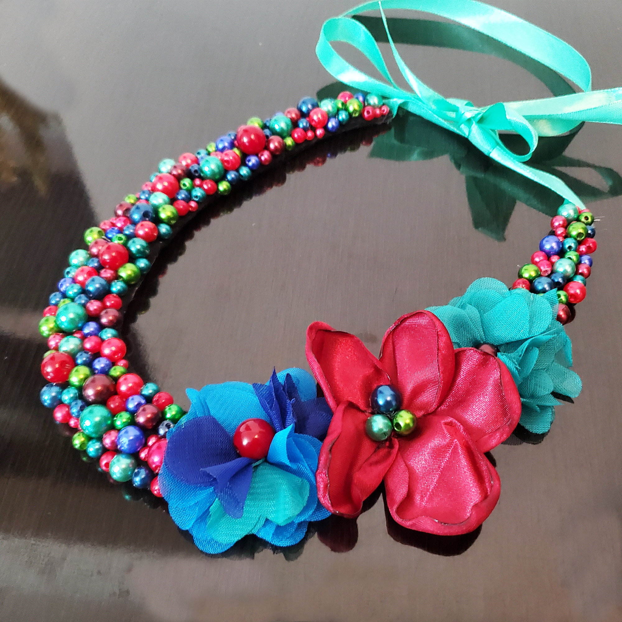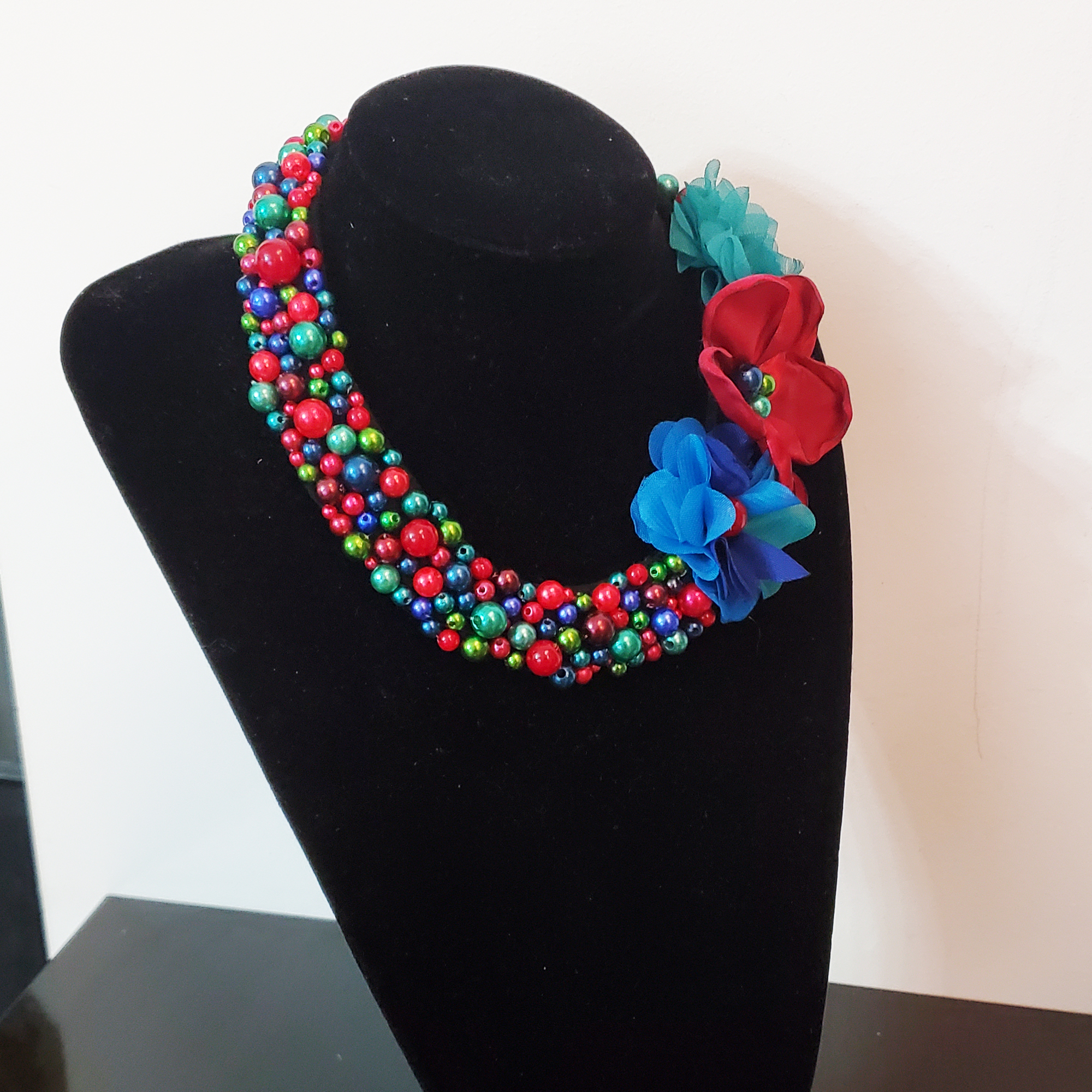 Colierul este pe forma semirotunda, la baza gatului. Pe baza textila sunt cusute 3 flori, 2 din tule in nuante de albastru si turcoaz si una din satin rosie. Perlele sunt de diferite marimi in nuante asortate cu florile. Se inchide la spate cu panglica din satin turcoaz.