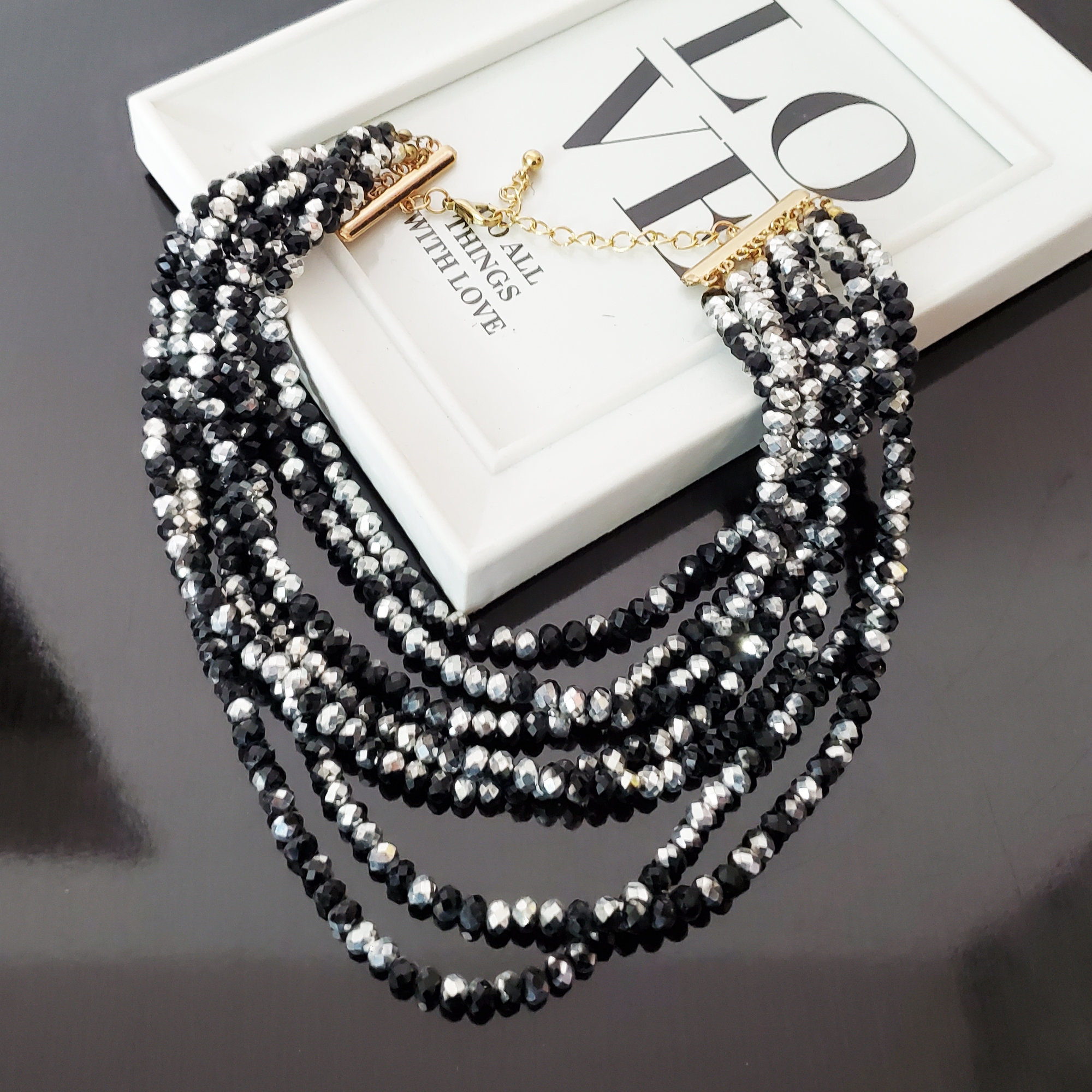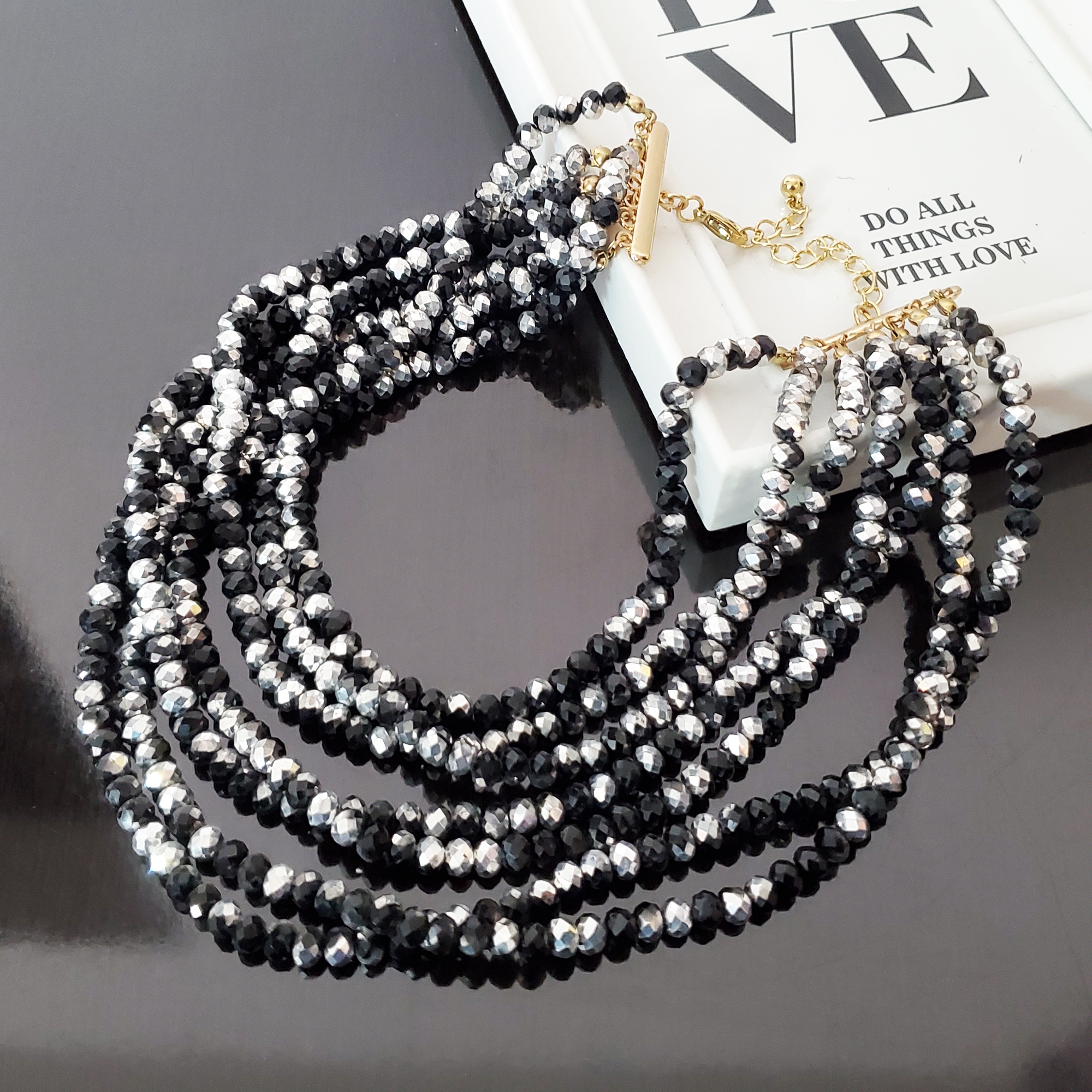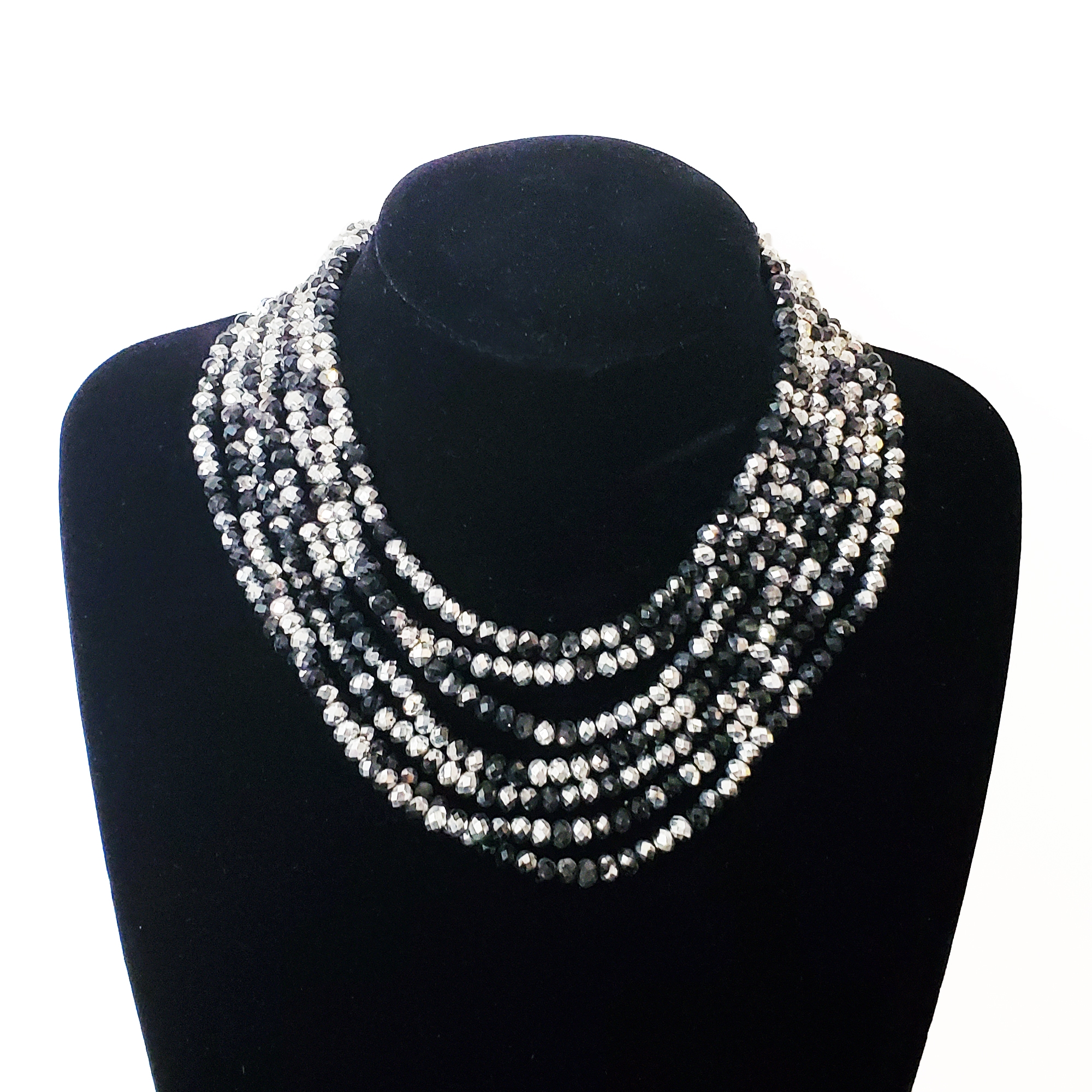 Colier cu 7 randuri de cristale de sticla, potrivit pentru persoane ce prefera culori discrete. Este potrivit atat pentru tinute de zi cat pentru tinute de seara, si se asorteaza bine cu bijuterii din argint.