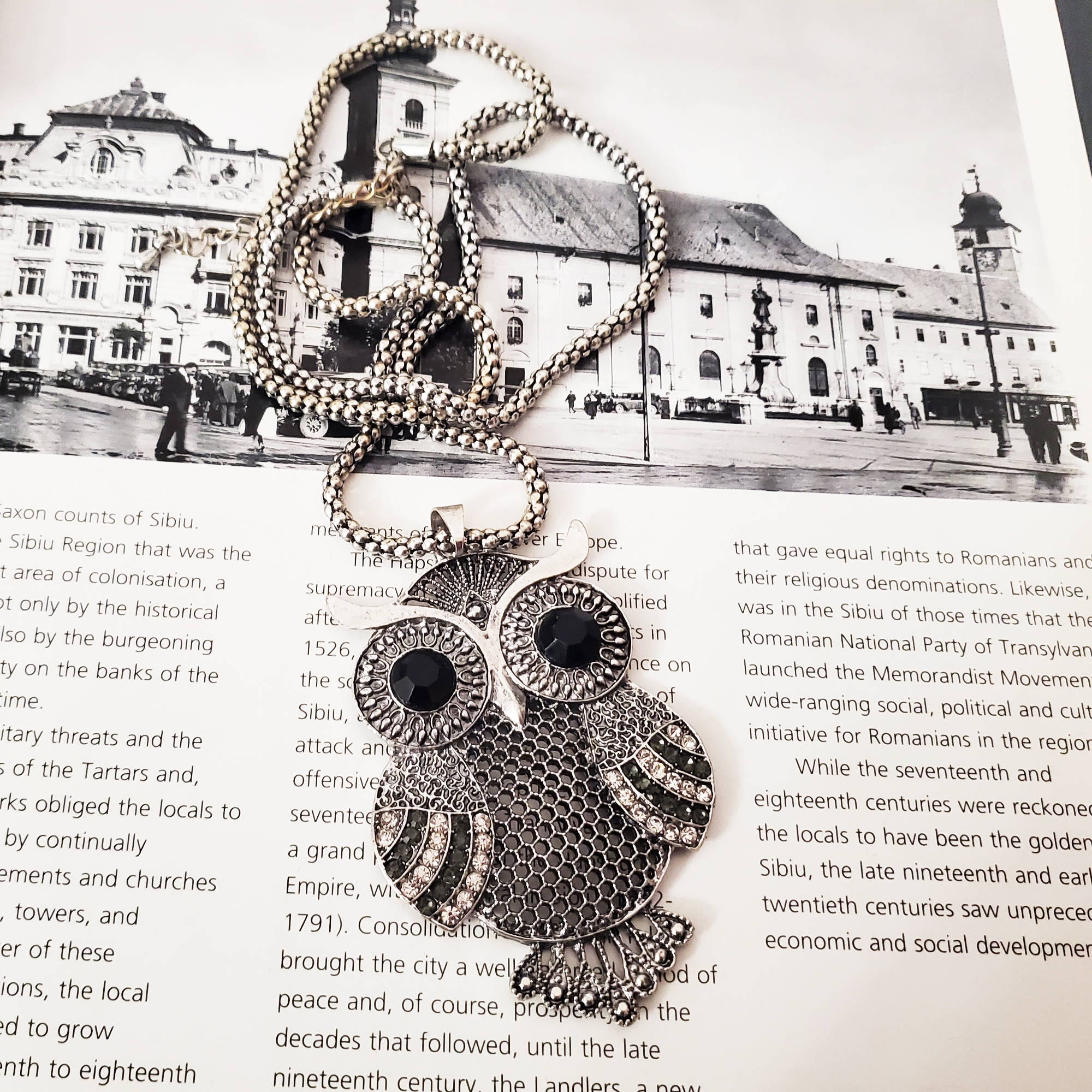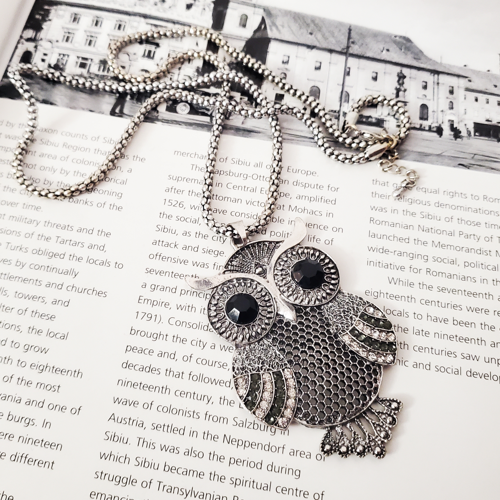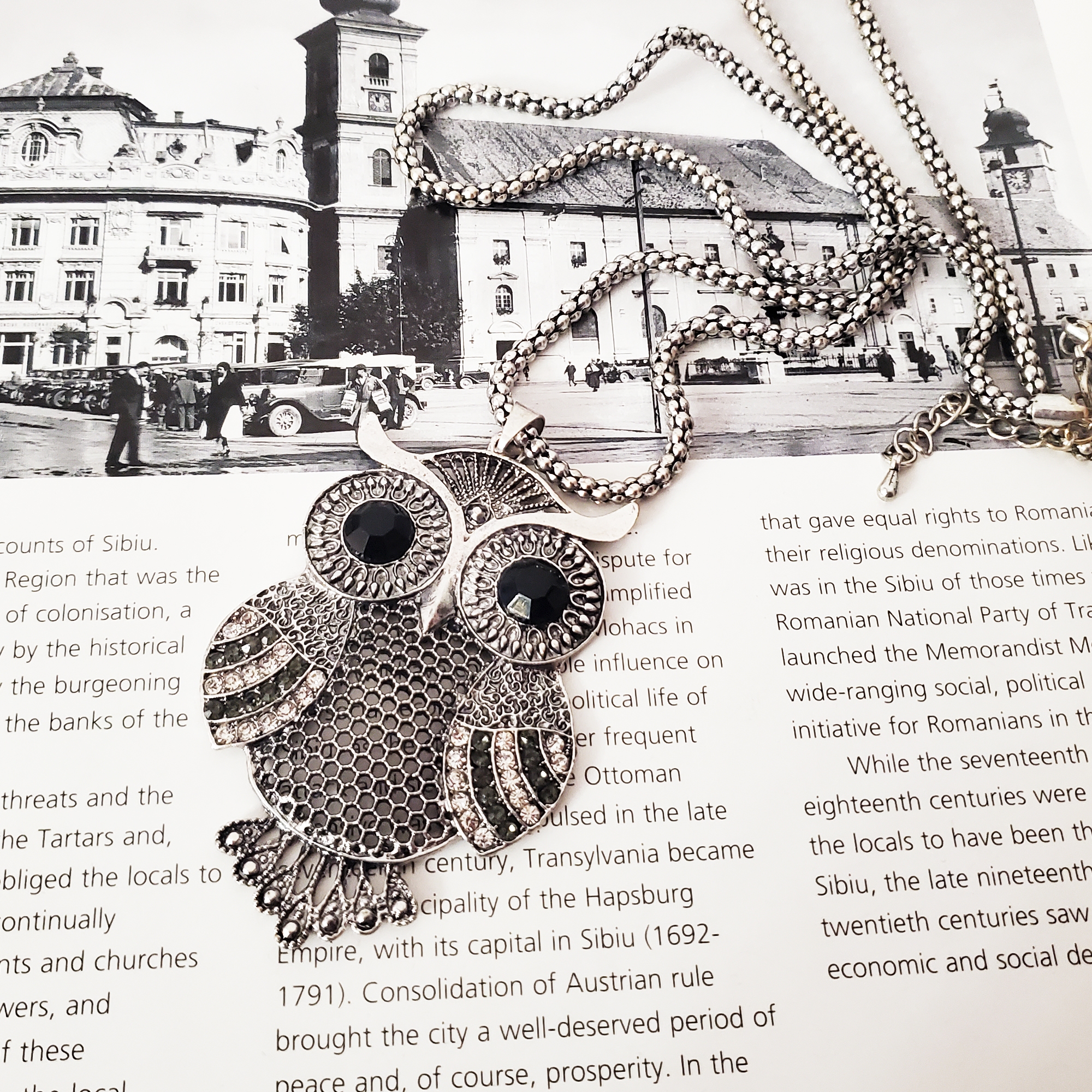 Lant finut metalic tip tetris, lung pana la decolteu, cu pandantiv. Se poate purta lung sau dublat ca in poza principala. Pandantivul este o bufnita 3D cu strasuri de sticla de albe si negre batute in montura. Se inchide su sistem metalic reglabil pe lant. Produs de serie disponibil in doua culori