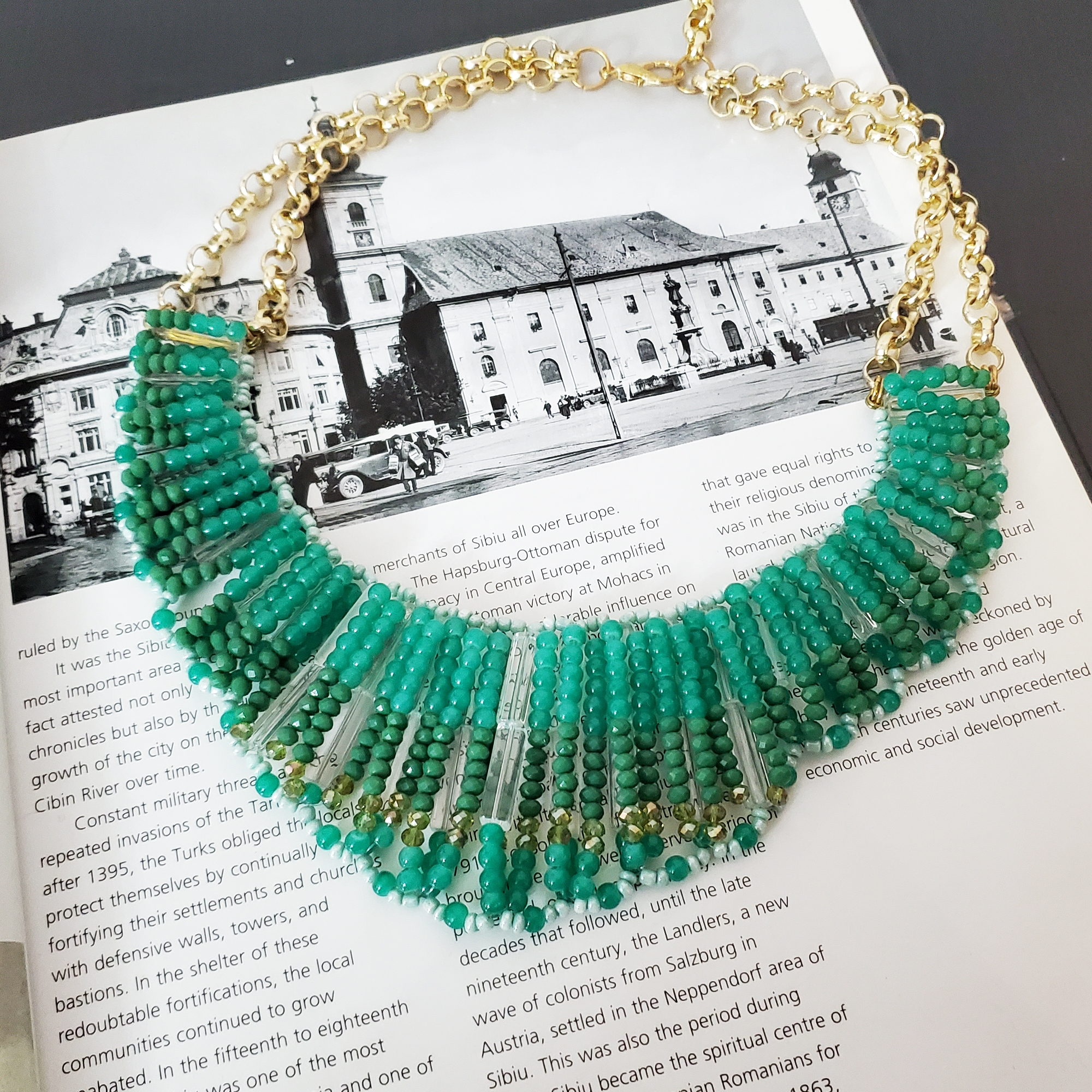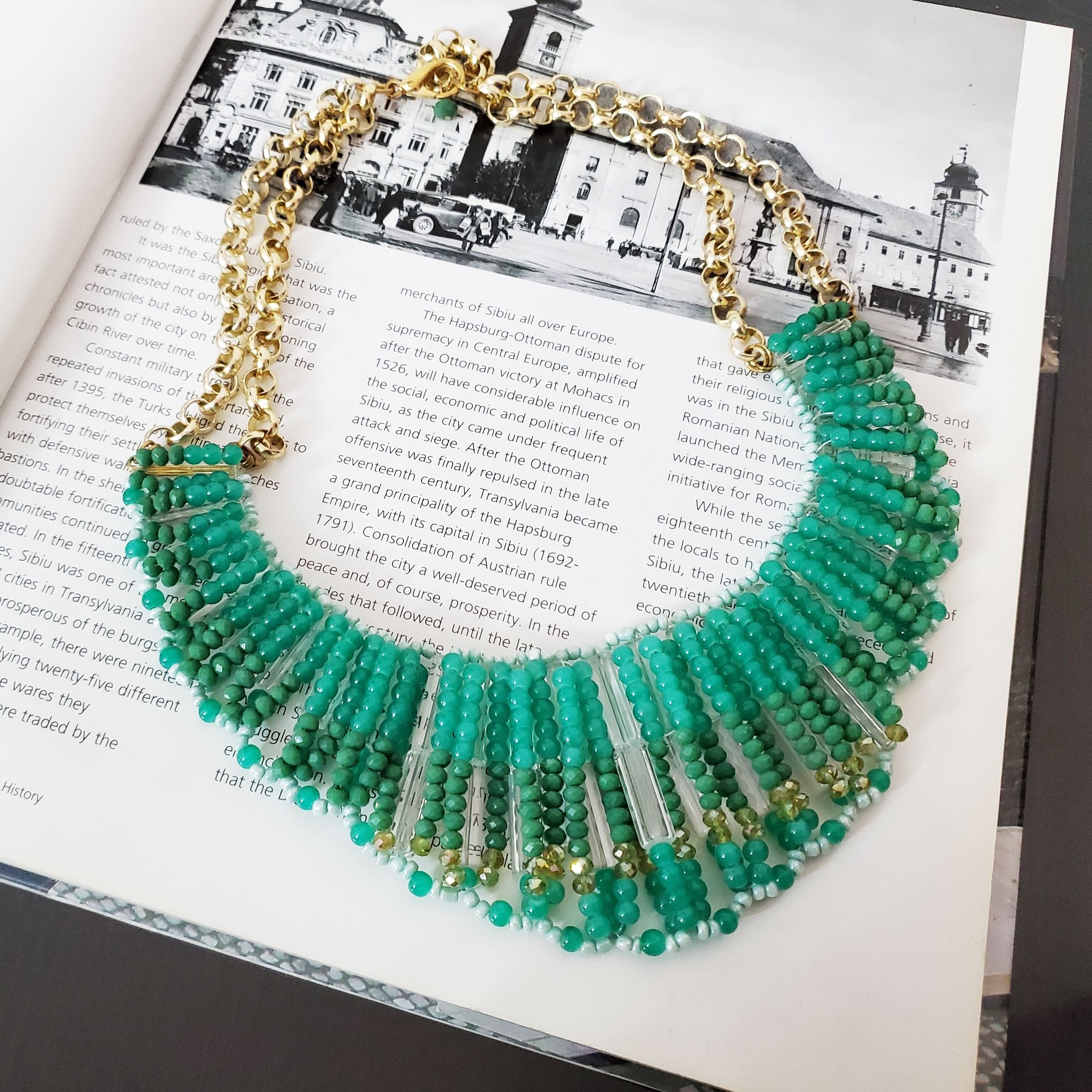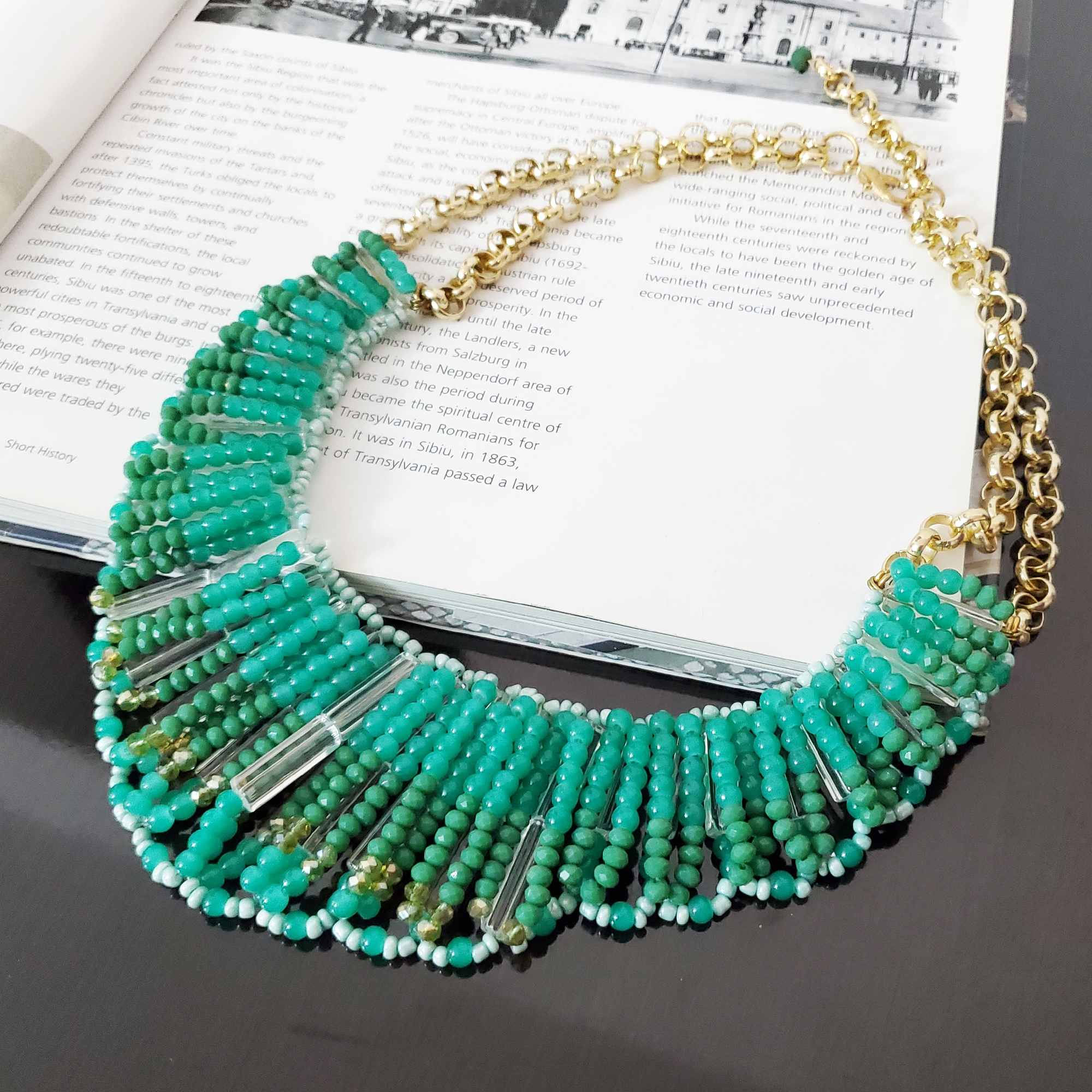Colier la baza gatului, pe forma semirotunda, realizat doar din cristale mici fatetate. Cristalele sunt legate ferm cu zale metalice aurii. Culorile cristaleleor alterneaza intre verde si turquoize. Se inchide la spate cu cheita metalica pe lant, reglabila. Produs de serie, disponibil in doua culori. Se livreaza in sac textil pentru bijuterii