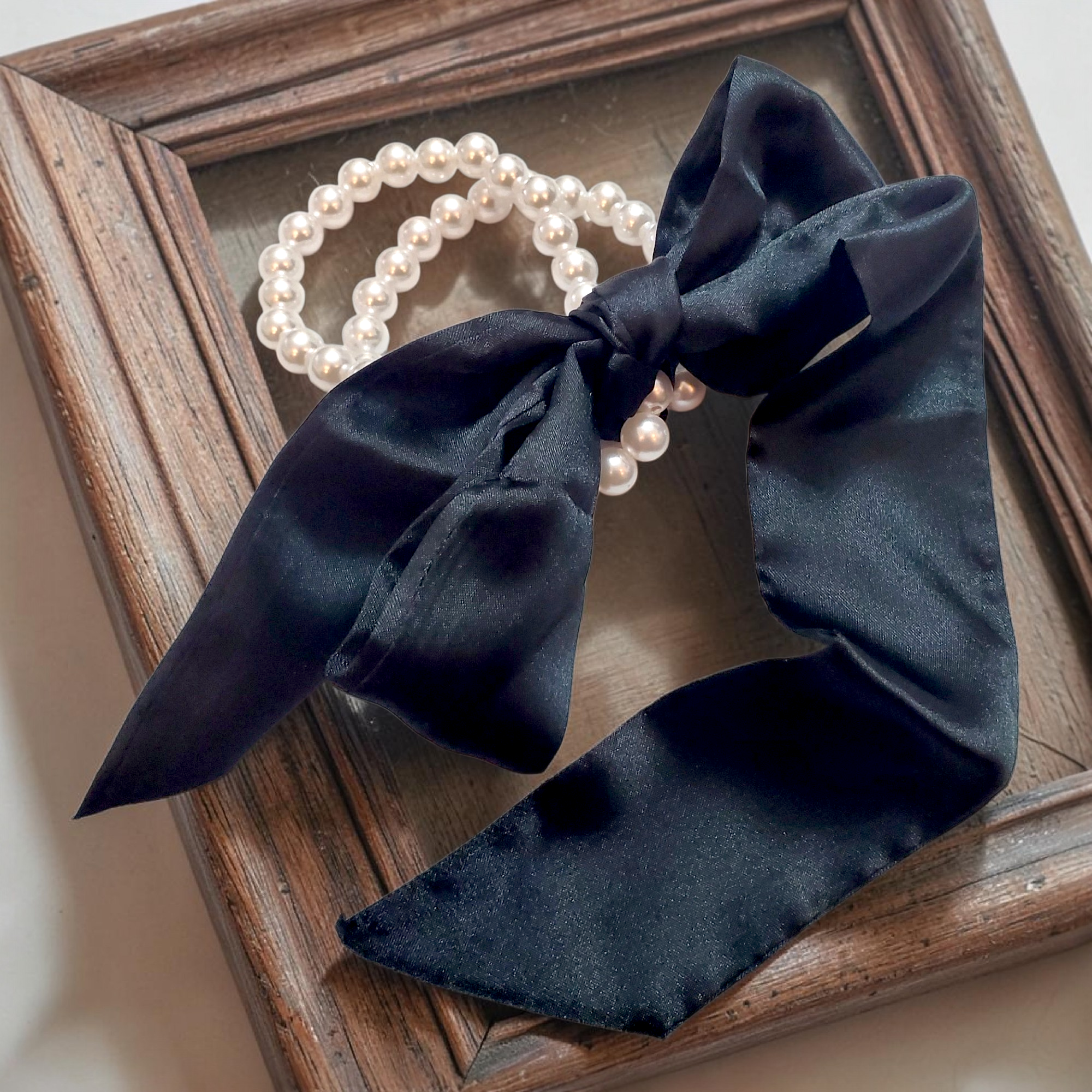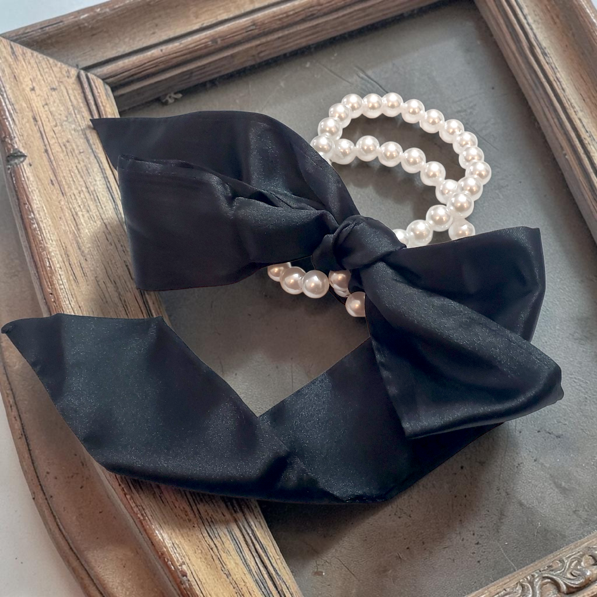 Setul contine un sirag de perle albe si o esarfa neagra din material fin tip matase, ce pot fi purtate impreuna in multe feluri.