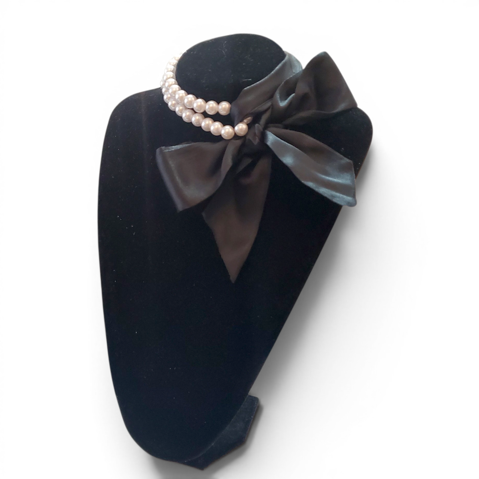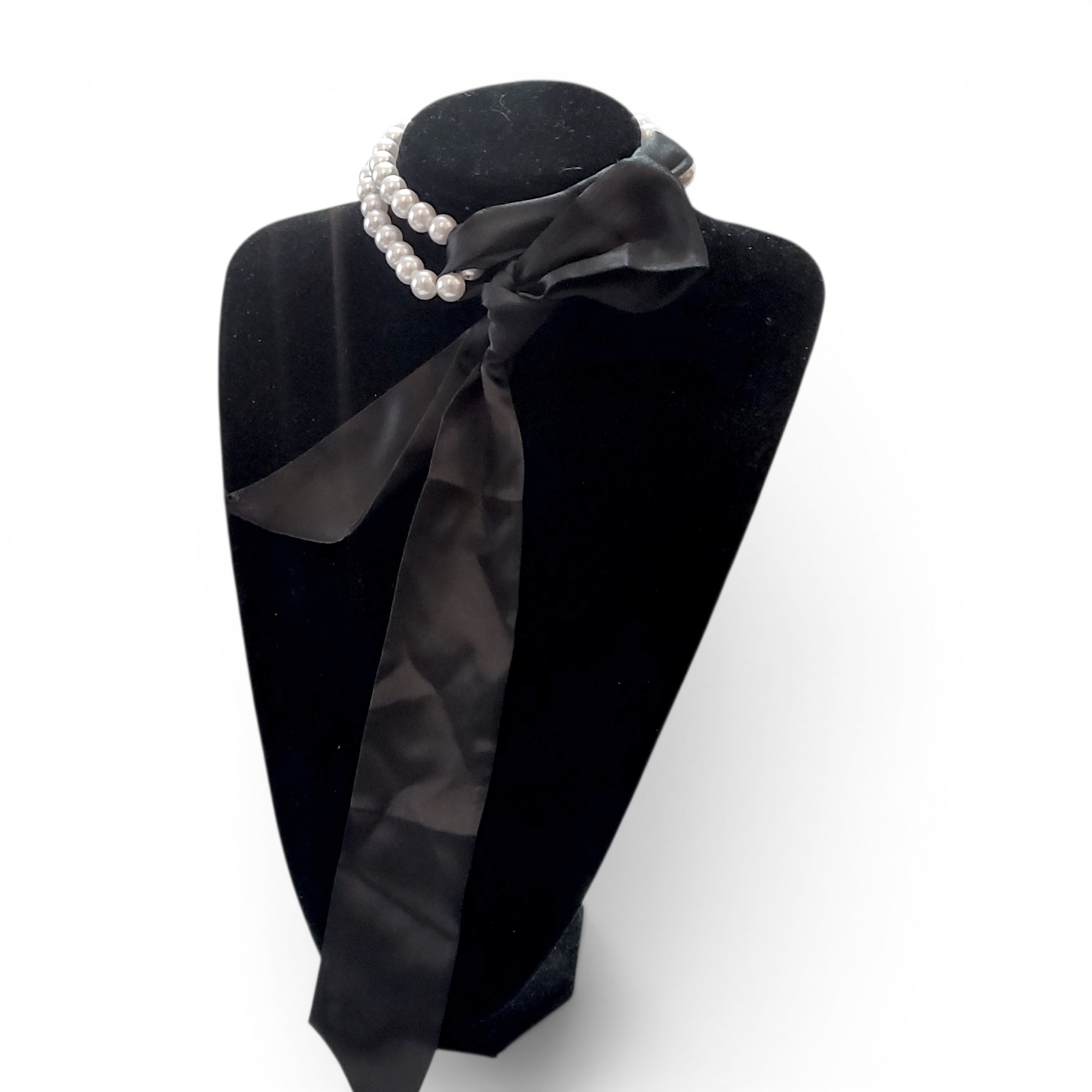 Perlele sunt acrlice, de diametru de 6 mm, si pentru a aduce un plus de comoditate sunt puse pe elastic de silicon transparent. Culoarea este alb. Astfel siragul este usor de purtat ca choker, fiind putin elastic. Ca lungime ajunge pana la nivelul decolteului, si poate fi bagat pe cap, fara a fi necesar sistem de prindere. Esarfa este perfect neagra, dintr-un material fin de tip matase. Setul poate fi purtat in cel putin 5 feluri, insa cel mai indicat este cel jumatate esarfa, jumatate perle.