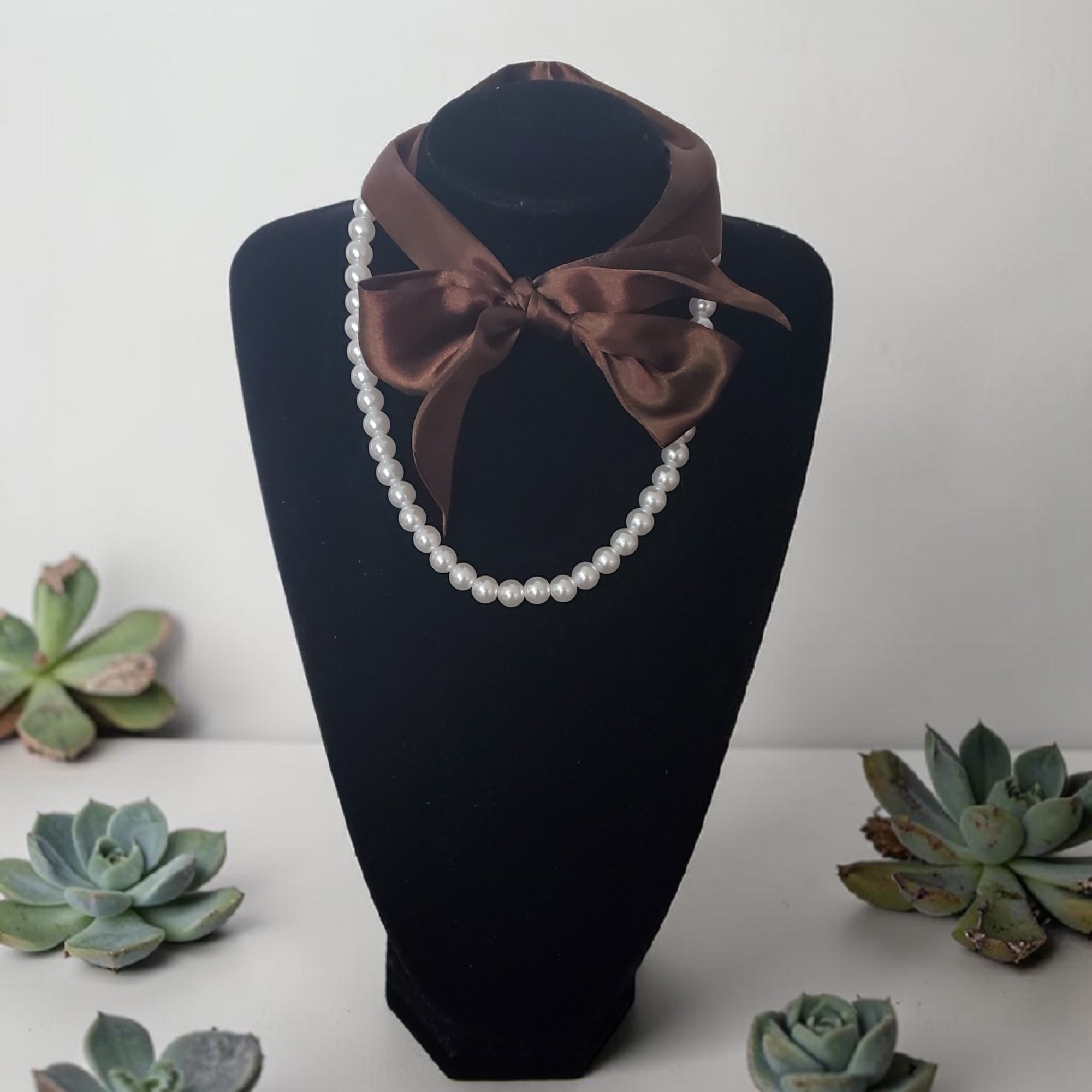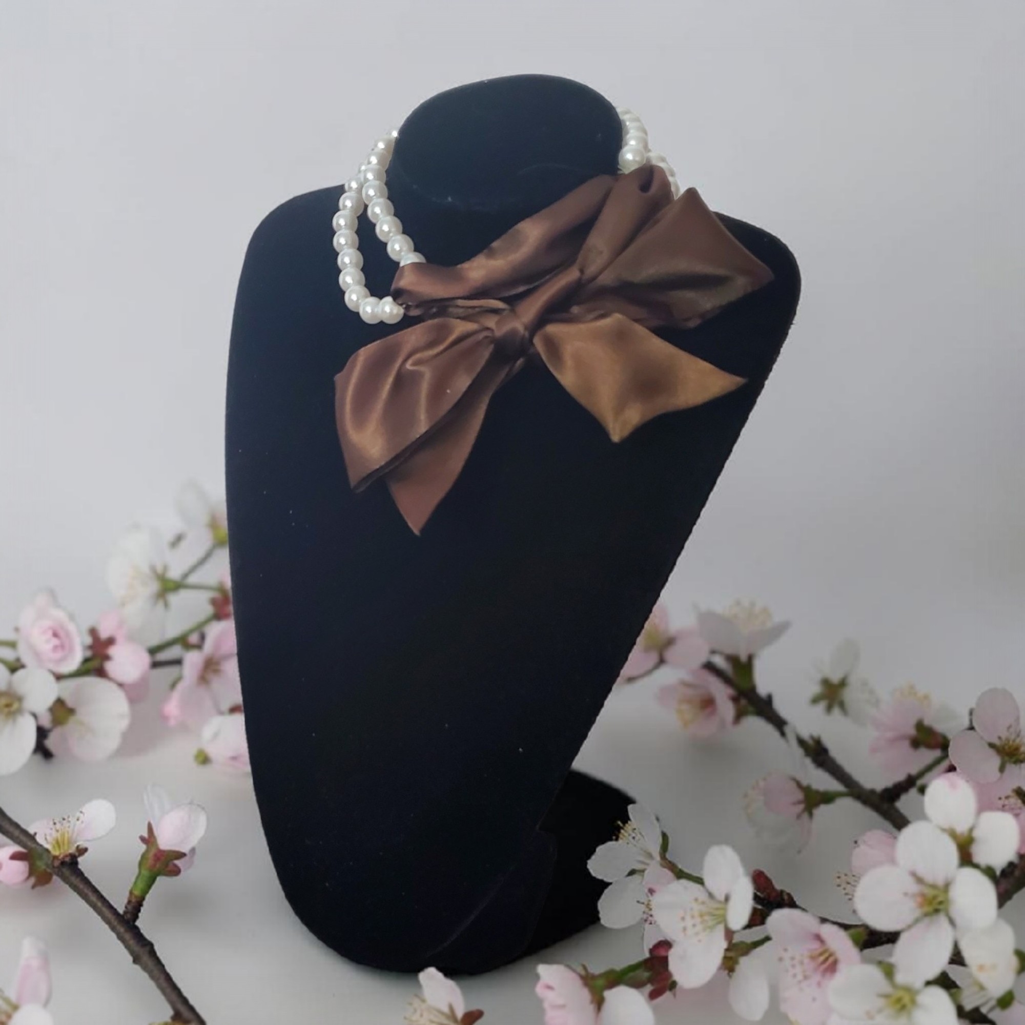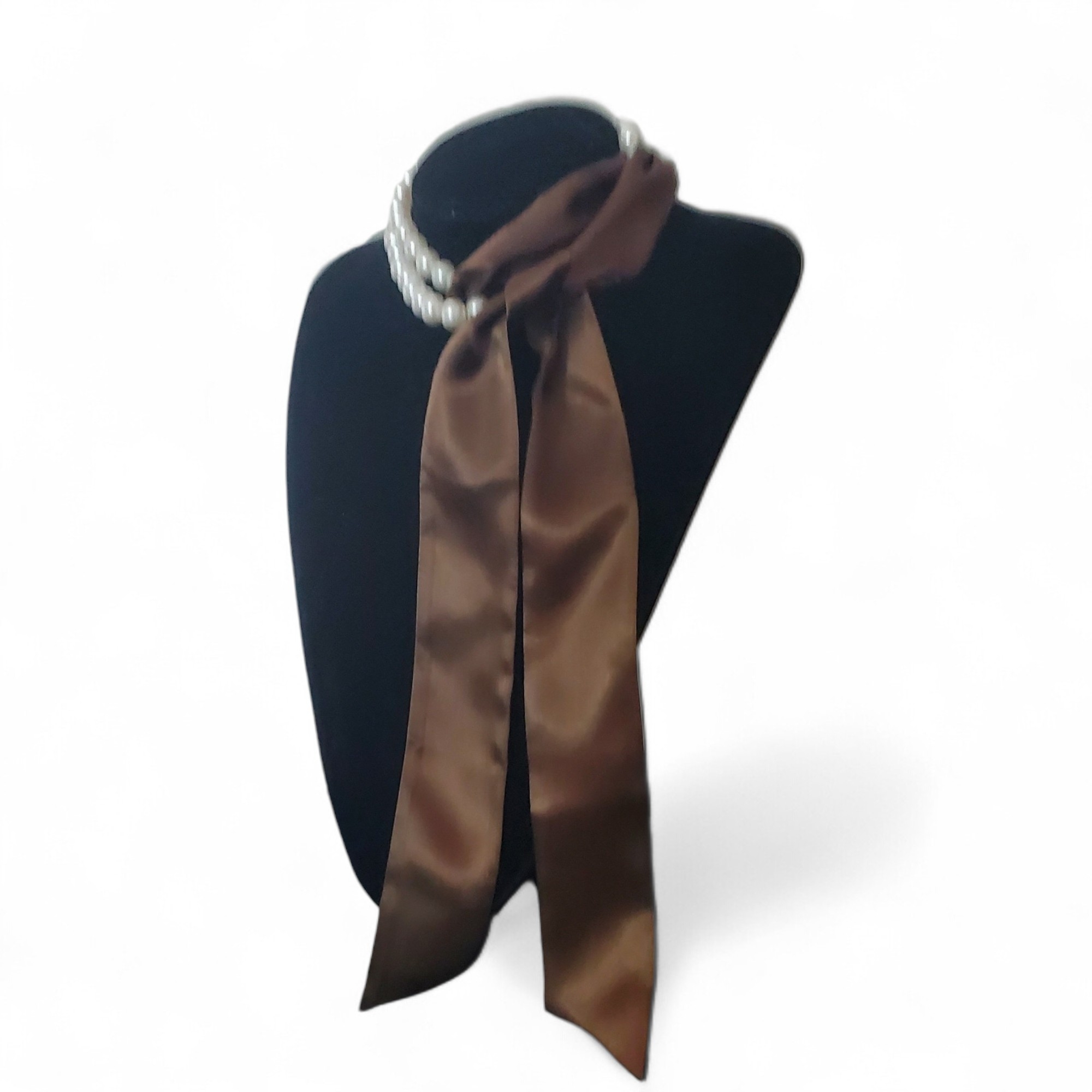 Setul contine un sirag de perle albe si o esarfa maro din material fin tip matase, ce pot fi purtate impreuna in multe feluri.