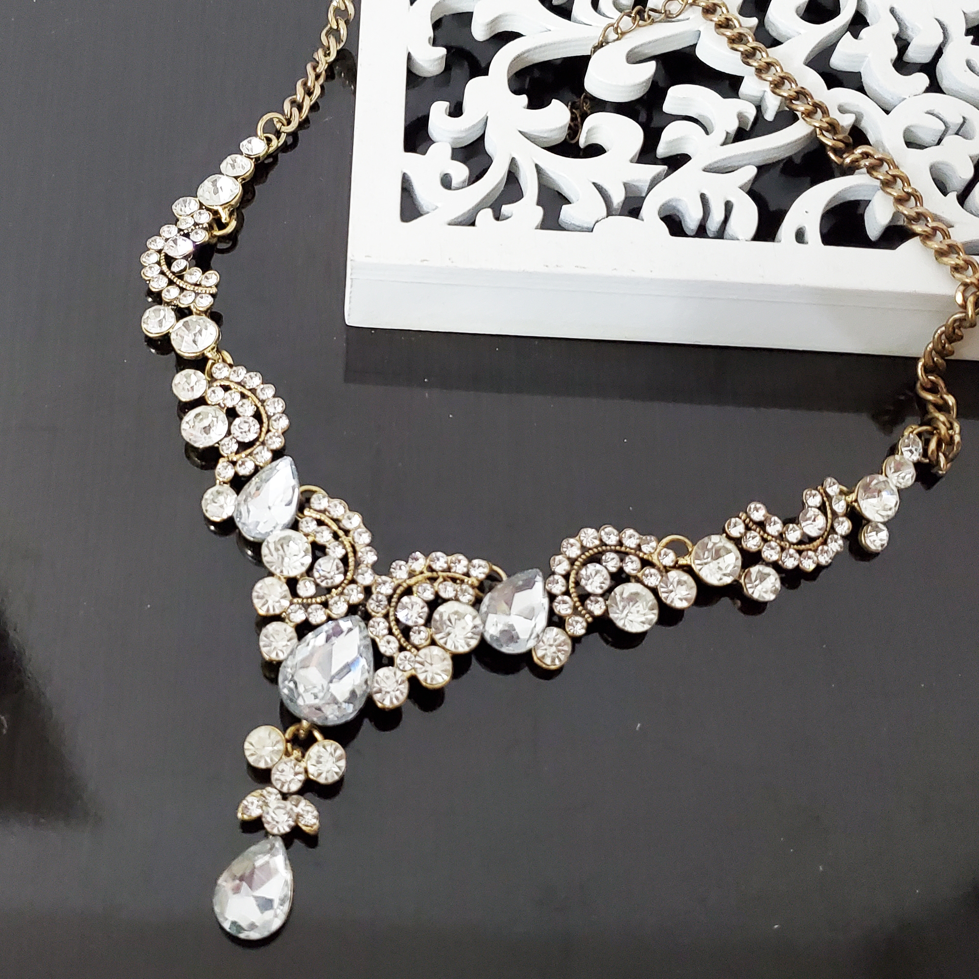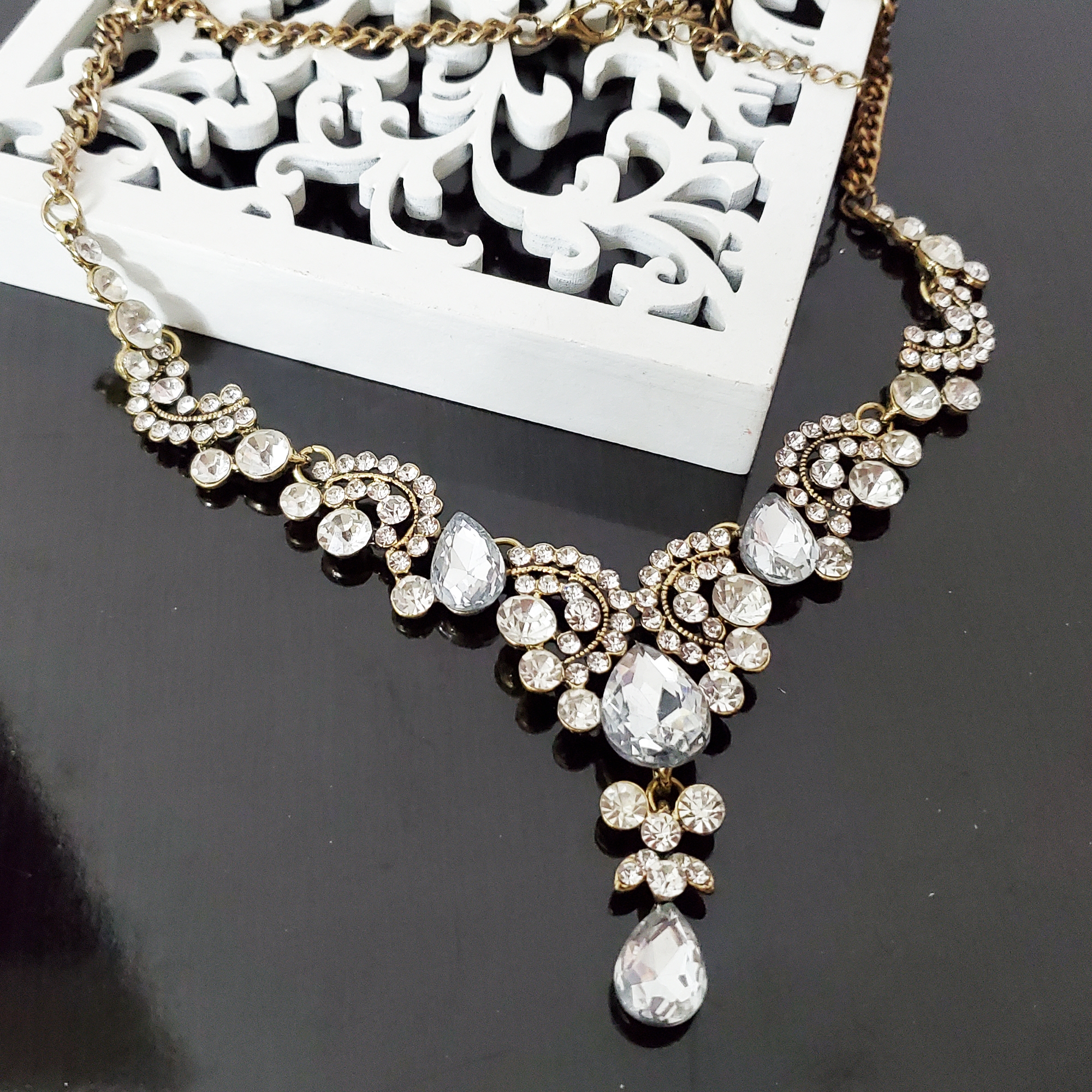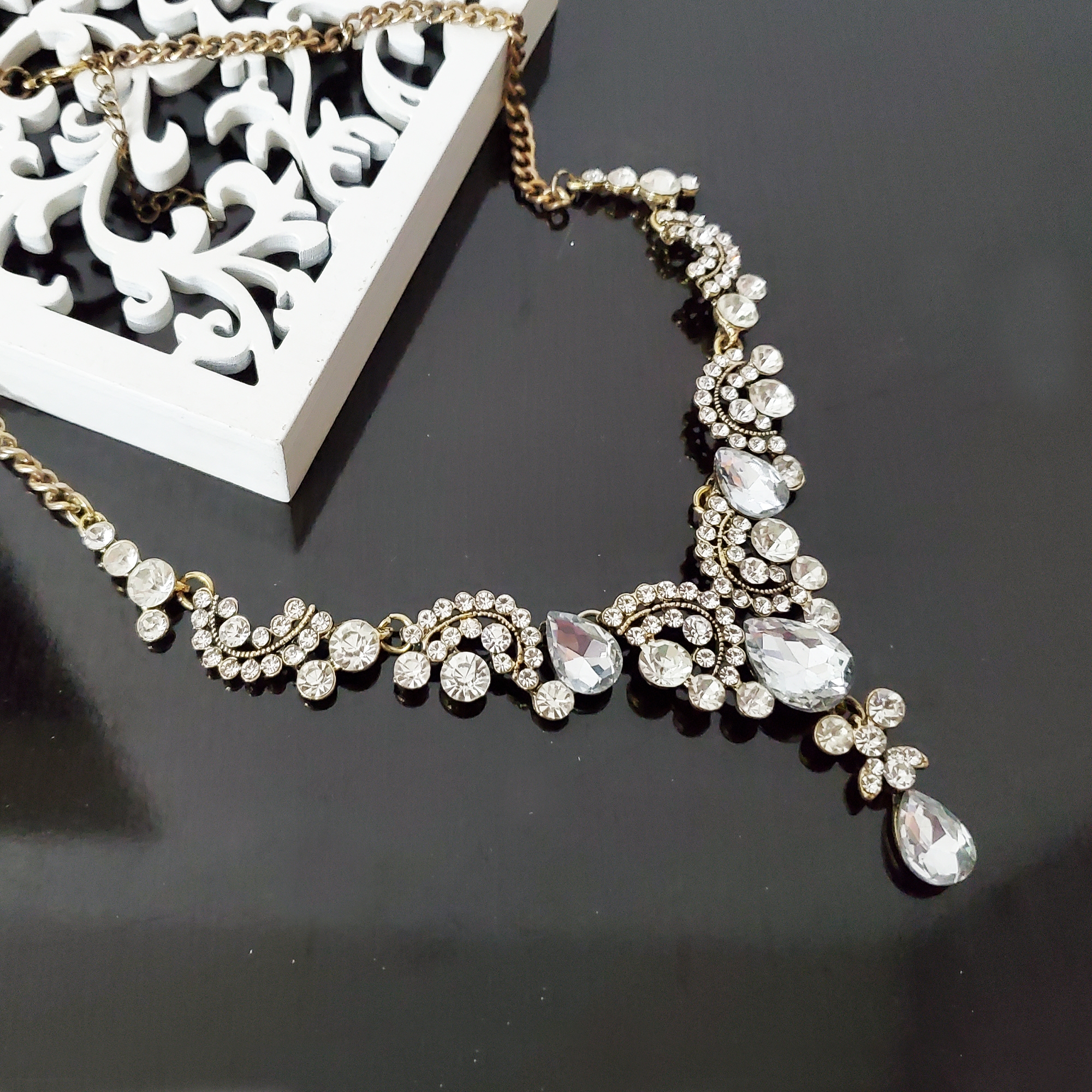 Colier la baza gatului in forma de A, pe montura aurie. Pe colier sunt doar cristale de sticla si strasuri albe.  Datorita culorii se potriveste cu orice alte accesorii atat din aur cat si din argint. Inchidere la spate pe lant auriu reglabil pentru lungime. Produs de seie, disponibil in mai multe culori.