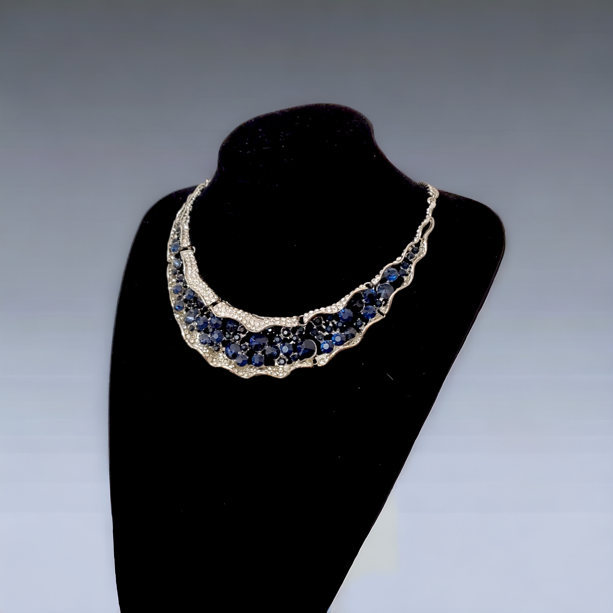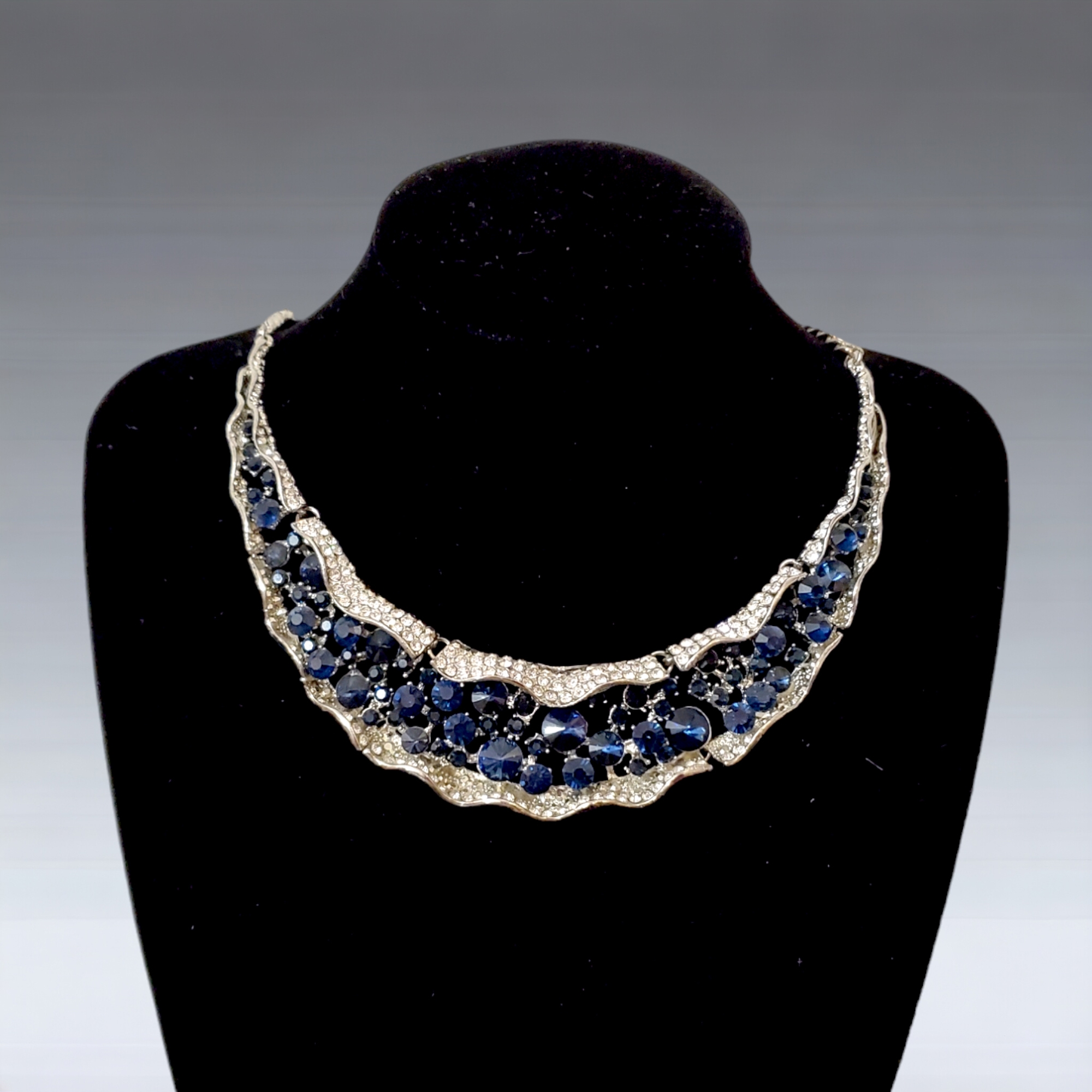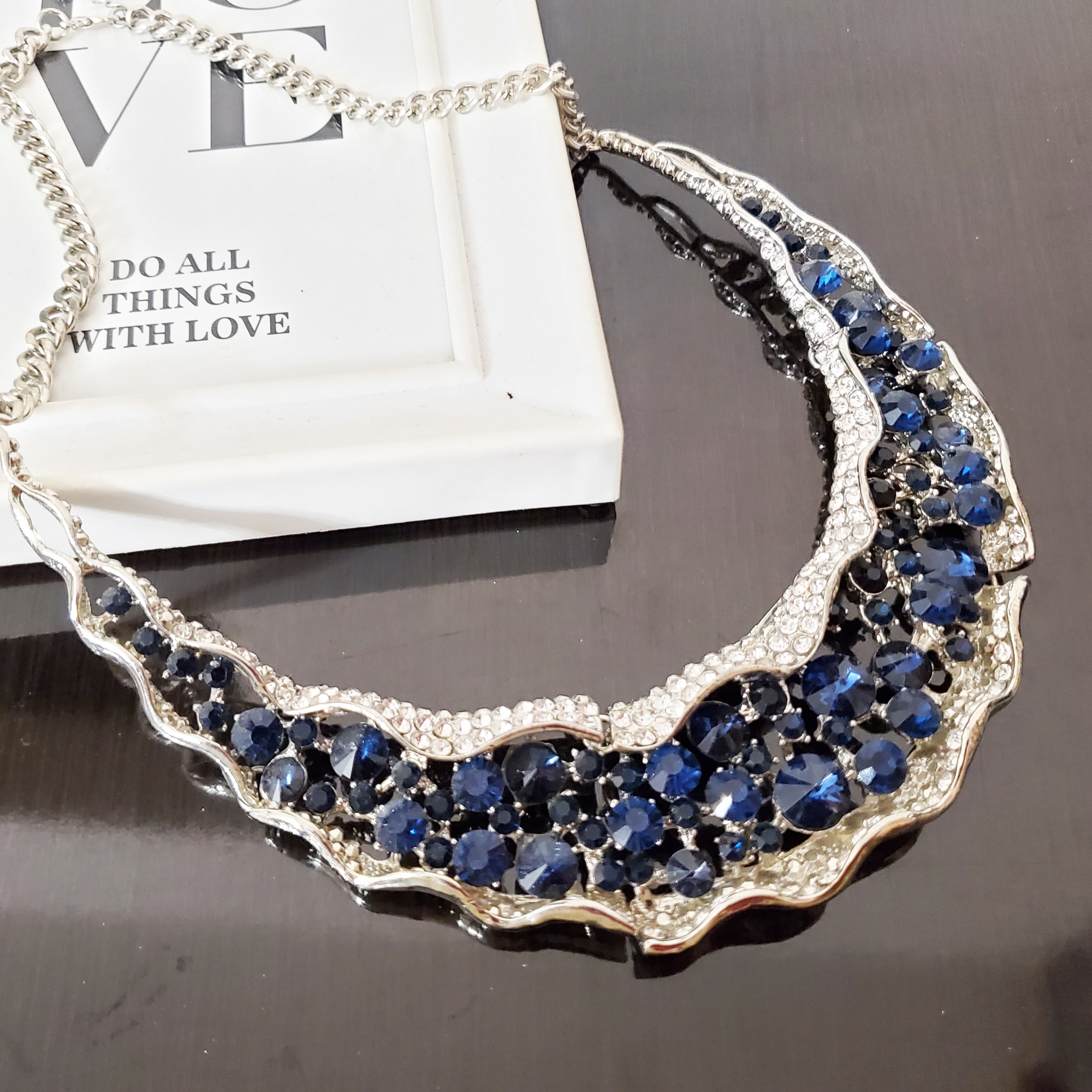 Colier statement metalic la baza gatului pe montura argintie. Pe colier sunt cristale de sticla in nuante de albastru inchis si alb argintiu cu putere mare de reflexie, si strasuri albe. Se inchide la spate cu sistem metalic pe lant ajustabil. Este potrivit pentru tinute de ocazie, elegante. Datorita monturii argintii se poate asorta cu alte accesorii din argint. Produs de serie, disponibil in mai multe culori. Se livreaza in sac textil pentru bijuterii