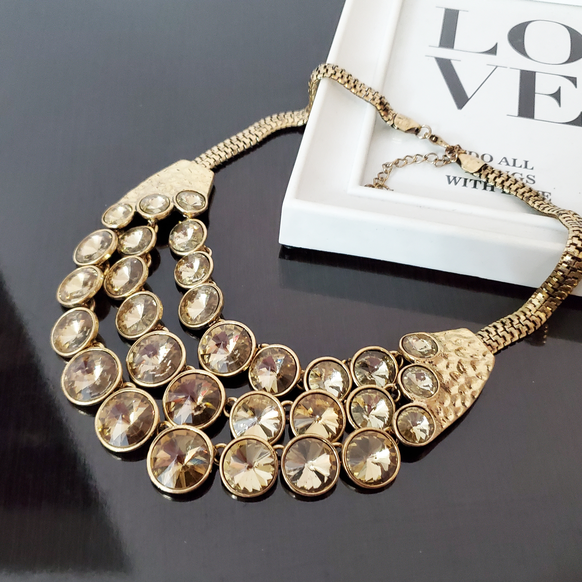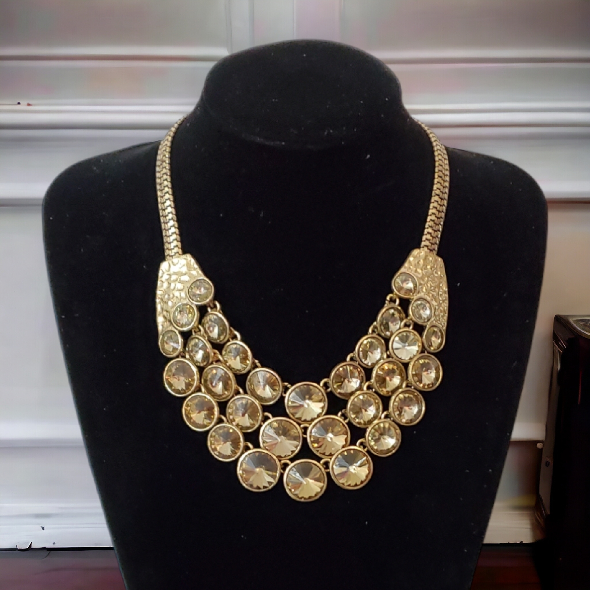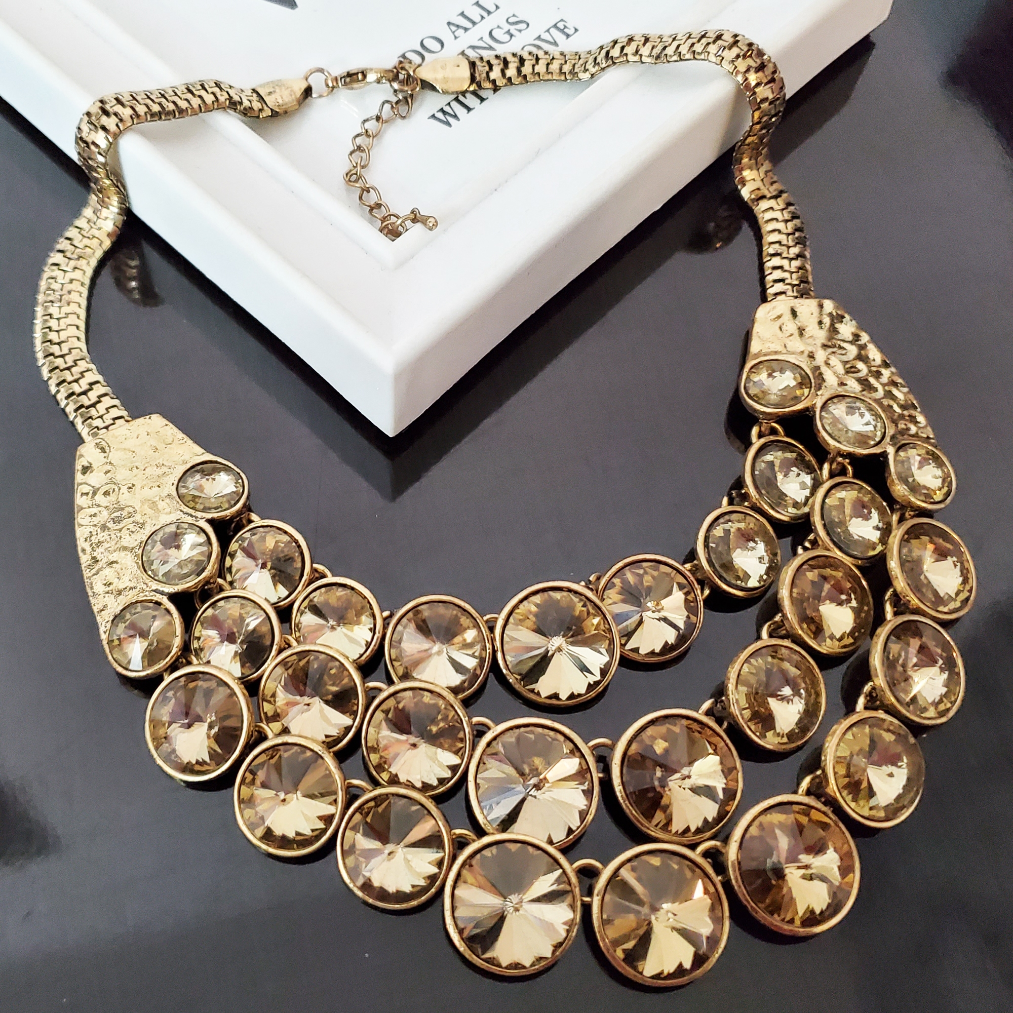 Colier pe montura metalica aurie, la baza gatului. Lungimea este reglabila. Colierul este format din 3 randuri de cristale de sticla de nuanta crem/auriu rotunde, de diferite marimi. Datorita monturii aurii poate fi purtata impreuna cu accesorii din aur Poate fi un accesoriu potrivit si pentru camasi, la tinute ofiice, sau pentru tinute elegante de seara. Se inchide la spate cu sistem metalic pe lant ajustabil. Produs de serie, disponibil in 2 culori. Se livreaza in sac textil pentru bijuterii.