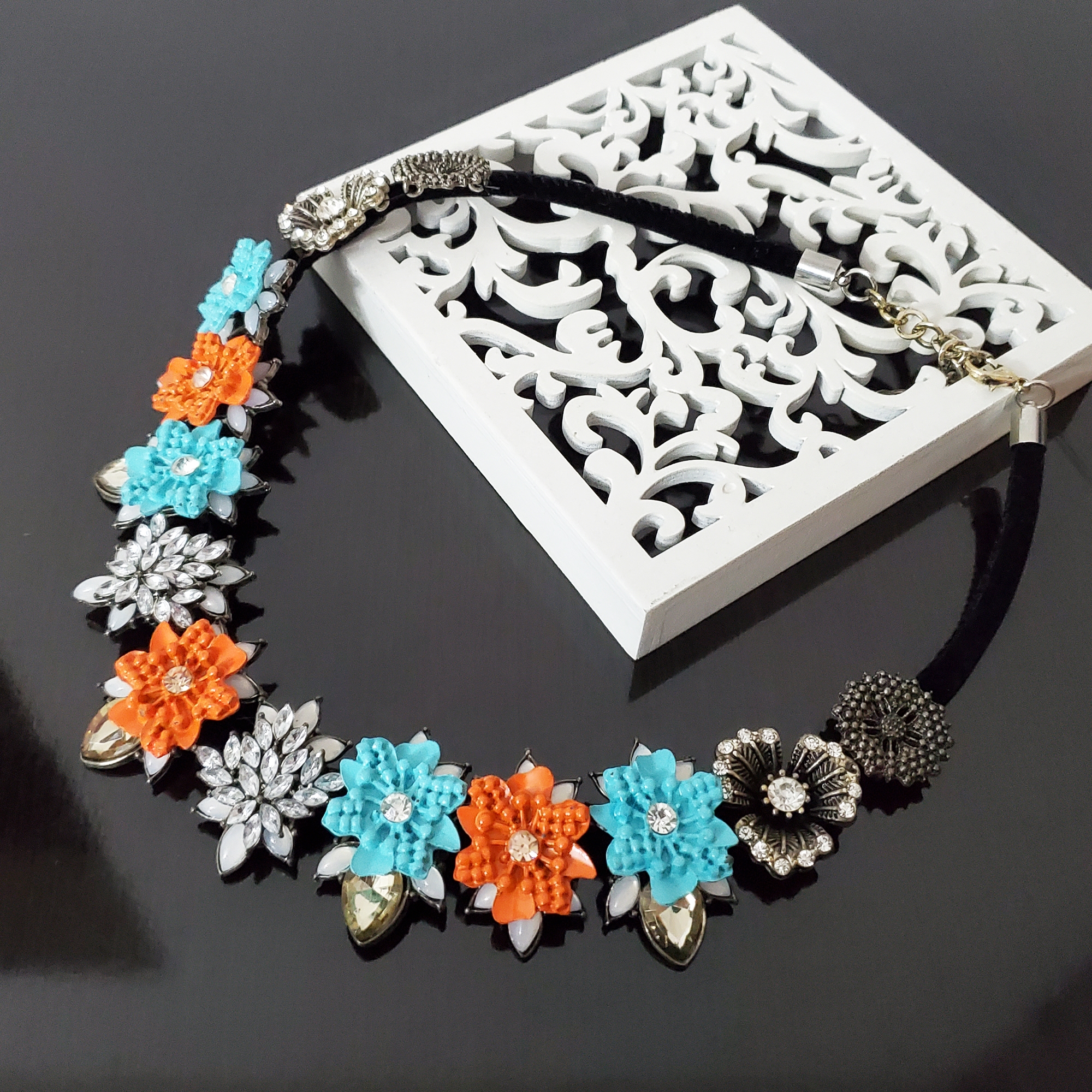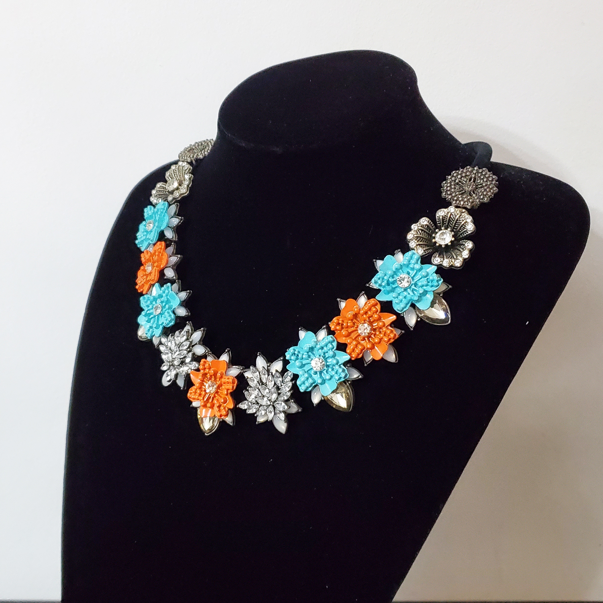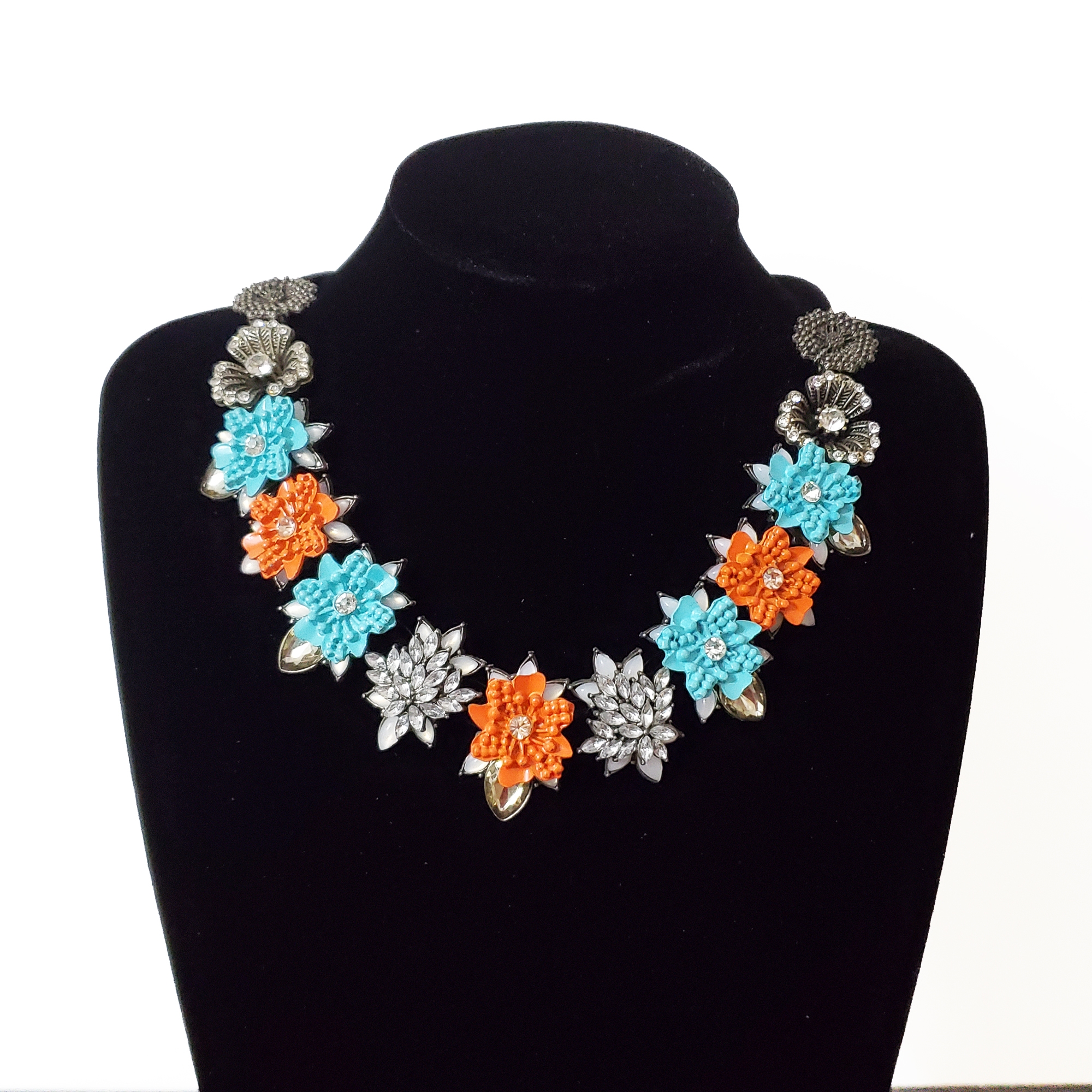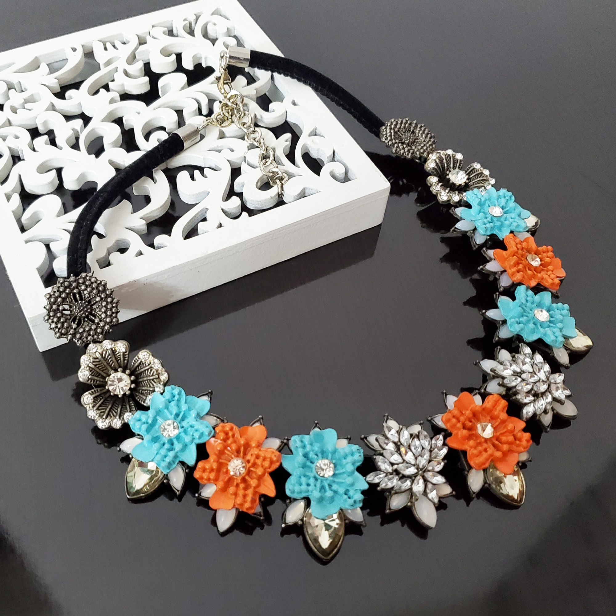 Transformă-ți ținuta într-o poveste de culoare cu acest colier statement, realizat din flori metalice albastre, portocalii și argintiu antichizat. Elegant, cu sistem reglabil pentru confort, aduce un strop de magie și rafinament fiecărei apariții. Lungime: 42-50 cm.